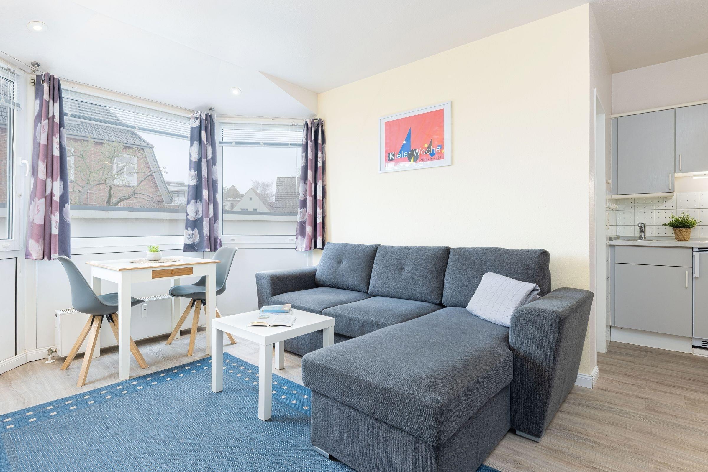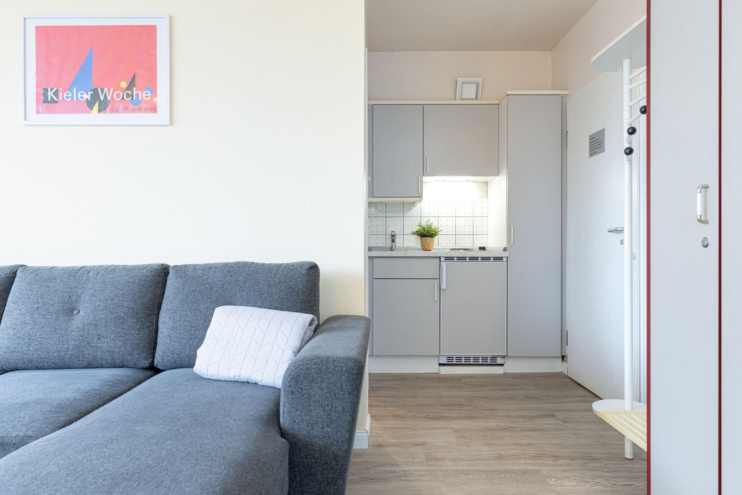 Die kleine 1-Zimmer-Ferienwohnung für 2 Personen mit seitlichem Meerblick befindet sich im Hochparterre des Appartementhauses Panorama direkt an der Strandpromenade von Laboe.