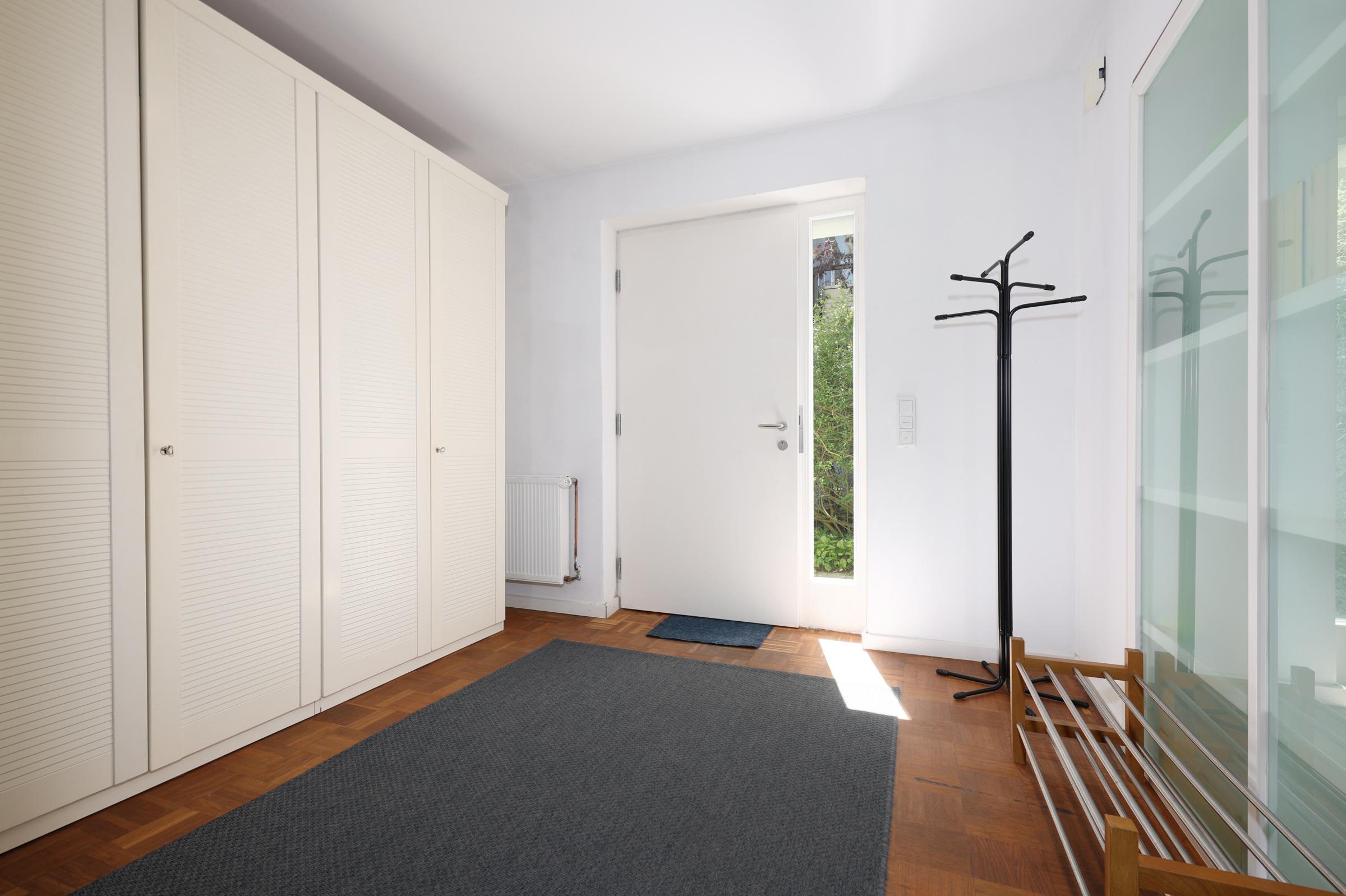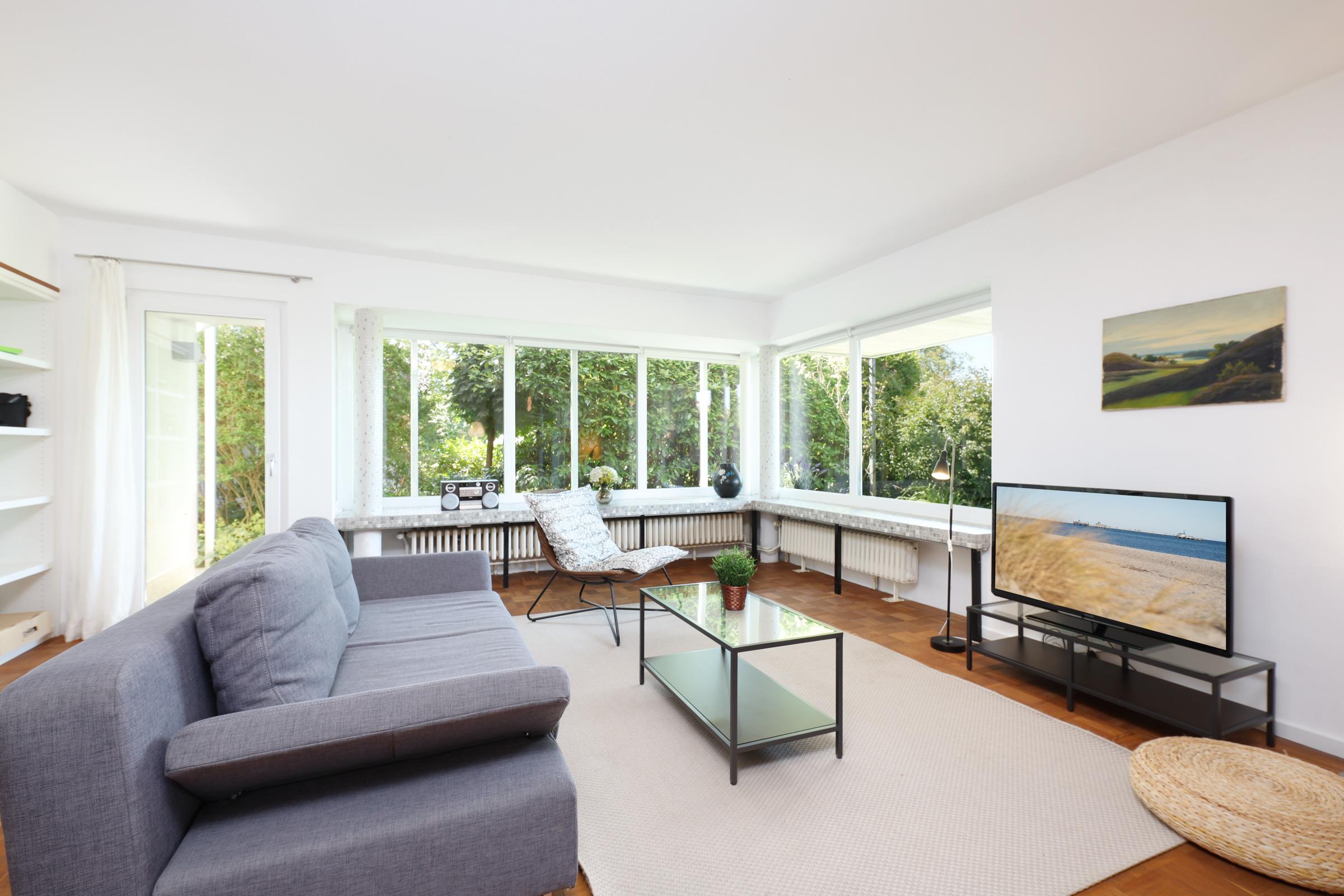 Ein geräumiger Flur empfängt Sie und führt in das großzügige und nordisch-modern eingerichtete Wohnzimmer. Die Sofaecke bietet bei Tag Entspannung nach ausgiebigen Strandspaziergängen und nachts Schlafplätze für zwei Personen. Die zum Wohnzimmer hin offene Küche und der Esstisch ermöglichen gemütliche Stunden des Beisammenseins. Der Blick schweift von der überdachten Terrasse über den kleinen, romantischen Garten bis hin zur Förde. Ein wunderbares Plätzchen, um den Abend vielleicht bei einem guten Tropfen ausklingen zu lassen. Das Schlafzimmer ist mit Schränken für Ihre Urlaubs-Garderobe und einem gemütlichen Doppelbett ausgestattet. Das komfortable Badezimmer verfügt über eine Dusche. Die Badewanne ist genau das richtige nach langen Winterspaziergängen entlang der Küste. Aufgrund der Hanglage verfügt das Bad nur über kleinere Fenster.