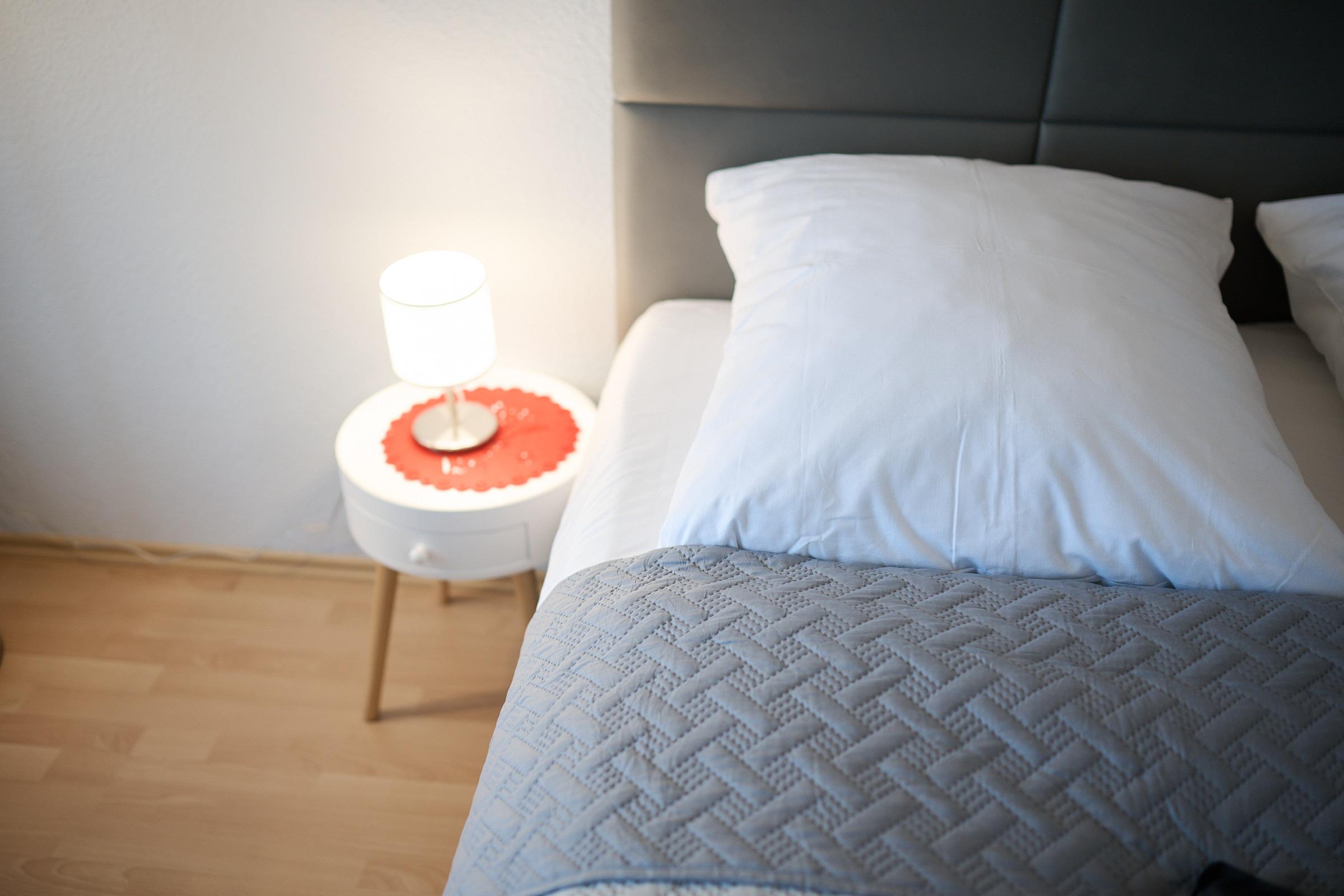 Wohnzimmer: Boxspringbett (ca. 160x200 cm), Kleiderschrank, TV, Verdunkelung (Vorhänge, Plissees)
