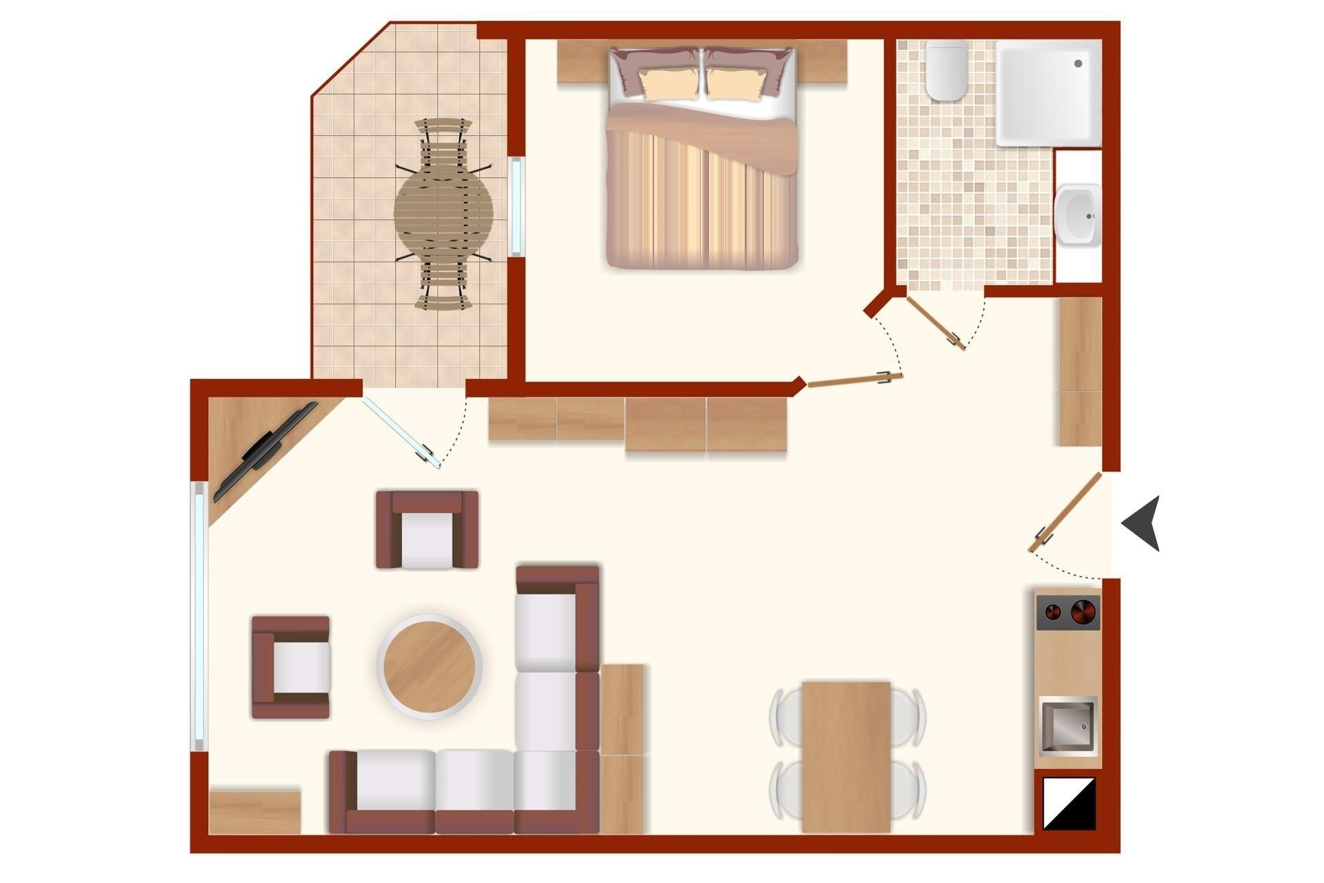 Die modern ausgestattete Ferienwohnung ist für maximal 2 Personen geeignet und unterteilt sich in ein großzügiges Wohnzimmer mit angrenzendem Essbereich und offener Pantry-Küche, ein gemütliches Schlafzimmer mit Doppelbett (180 x 200 cm, Fußende offen) und ein Duschbad.