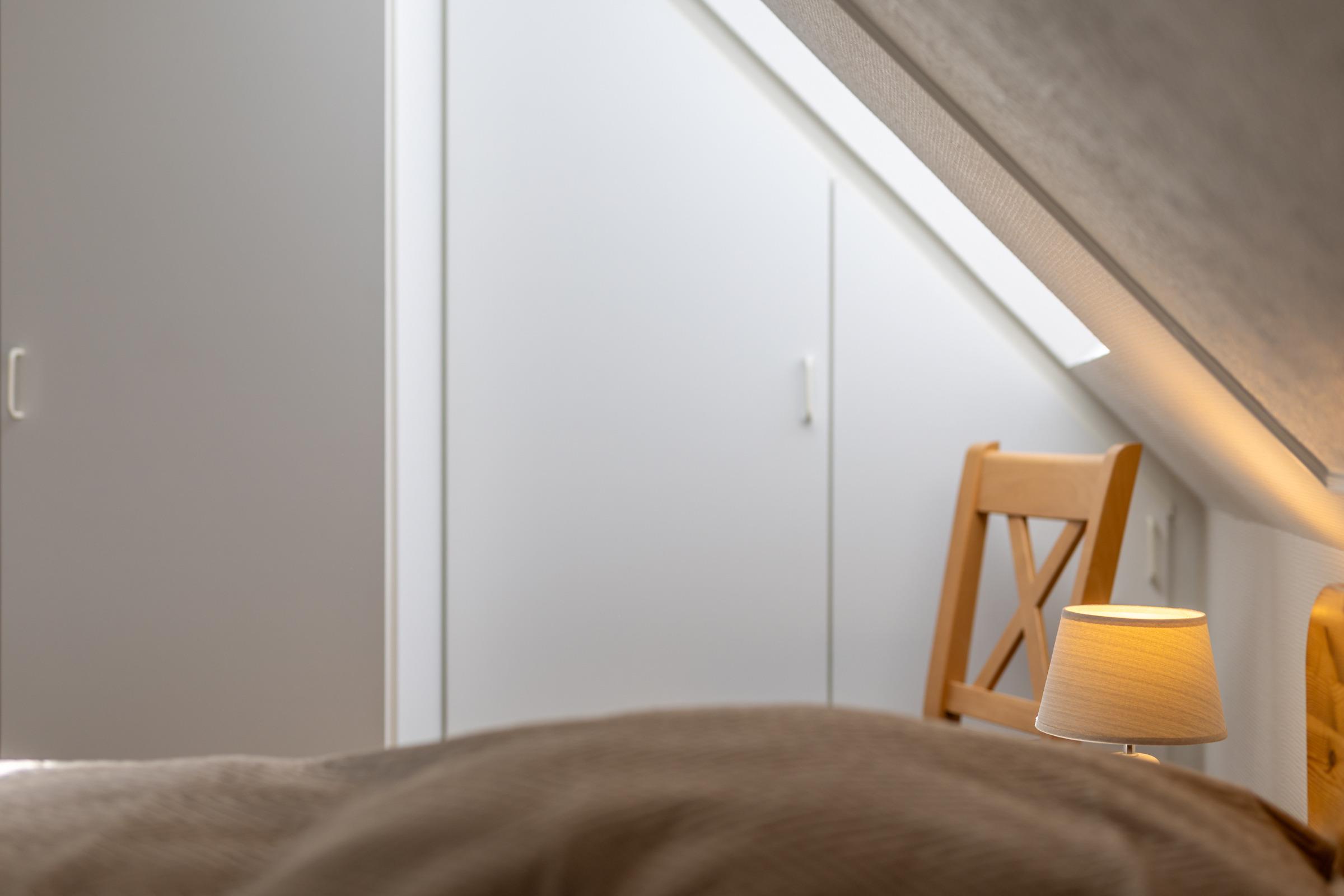 Schlafzimmer: 1 Doppelbett (2x 100x200 cm), Verdunkelung: Plissee, Kleiderschrank, kein Platz für ein Babybett vorhanden