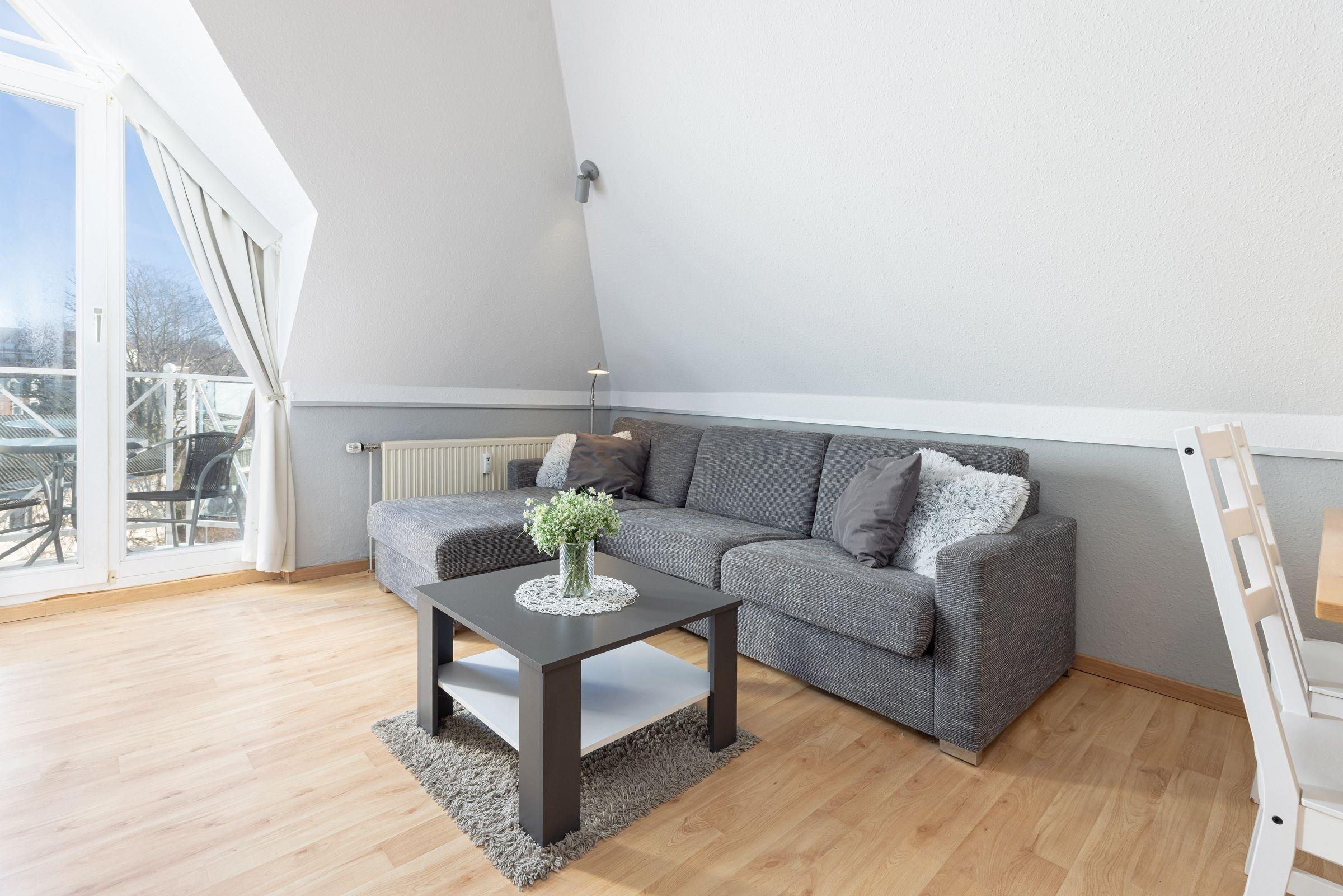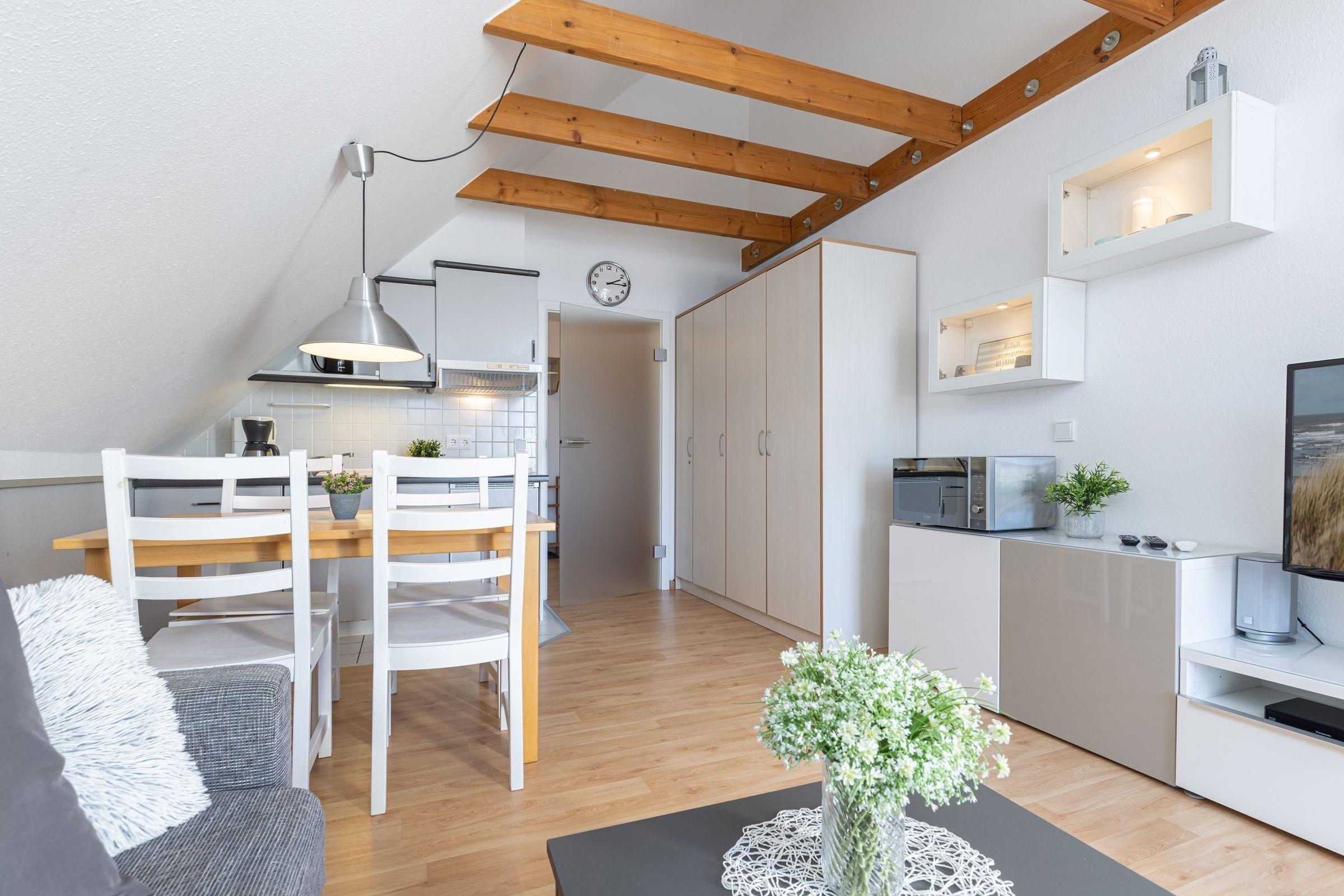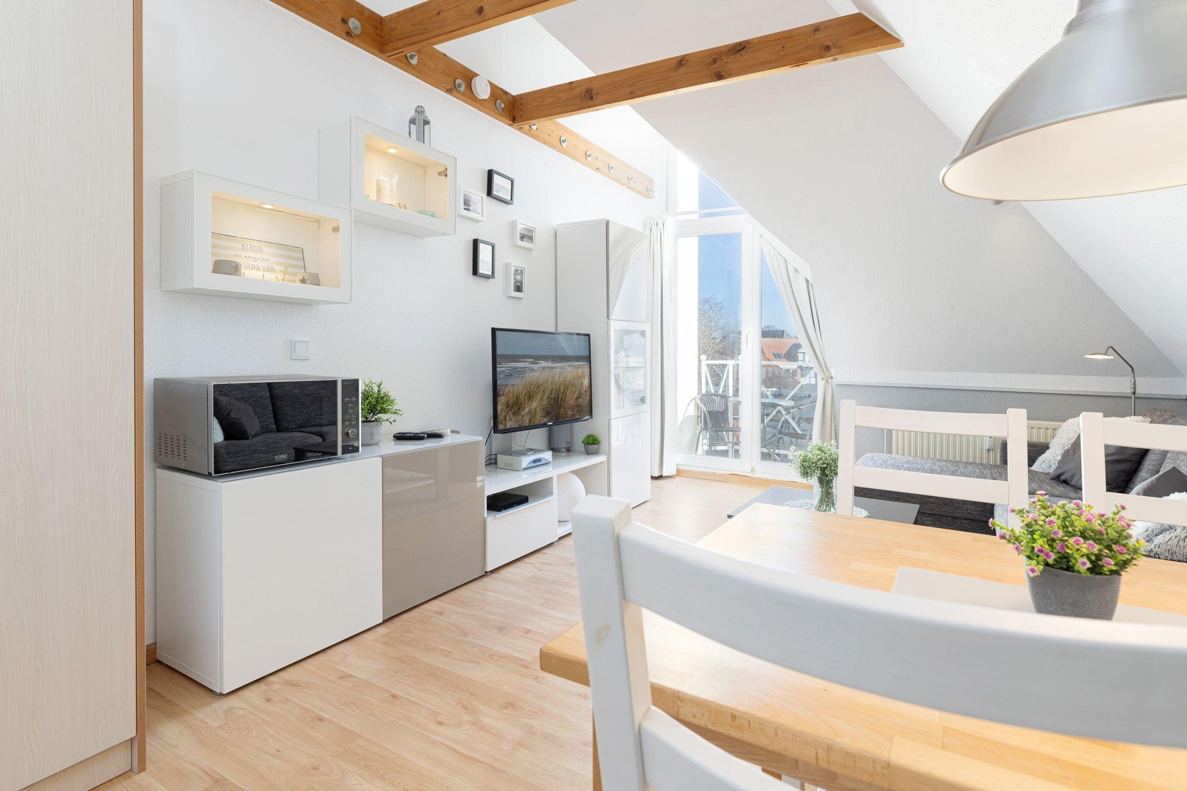 Es empfängt Sie ein gemütliches Wohnzimmer mit einer Küchenzeile. Die Wohnung ist mit einer komfortablen Schlafcouch ausgestattet. Mit nur einem Handgriff verwandeln Sie die Couch in ein bequemes Bett. Außerdem erwartet Sie ein Flachbildfernseher, DVD Player, Stereoanlage, Bücher und Gesellschaftsspiele. Vom Wohnzimmer gelangen Sie auf einen kleinen Balkon, auf dem Sie in der Morgensonne Ihren ersten Kaffee genießen können. Eine Raumspartreppe führt in die behagliche, obere Etage mit Doppelbett und einem großen Dachfenster, von dem aus Sie einen schönen Blick auf die Innenförde haben. Bitte beachten Sie, dass diese Treppe für kleine Kinder und gehbehinderte Menschen nicht geeignet ist.
