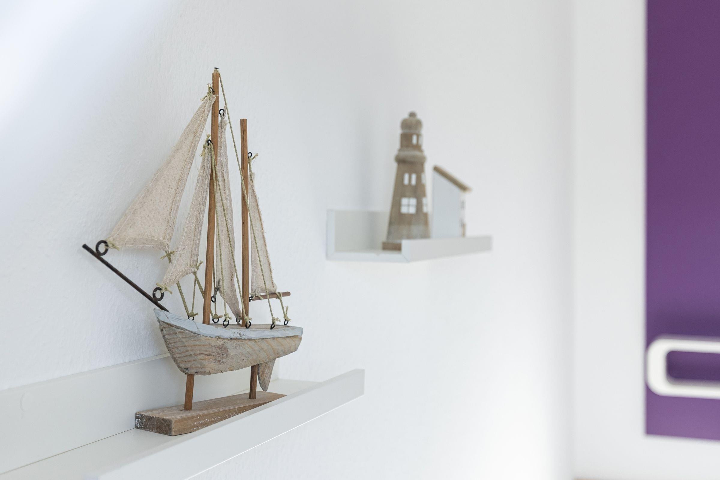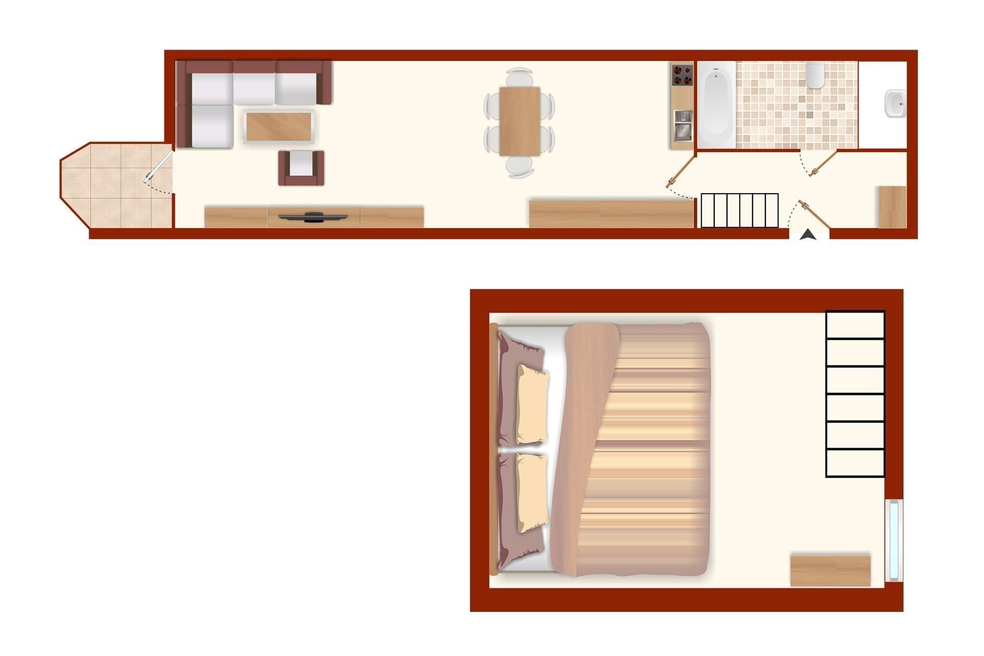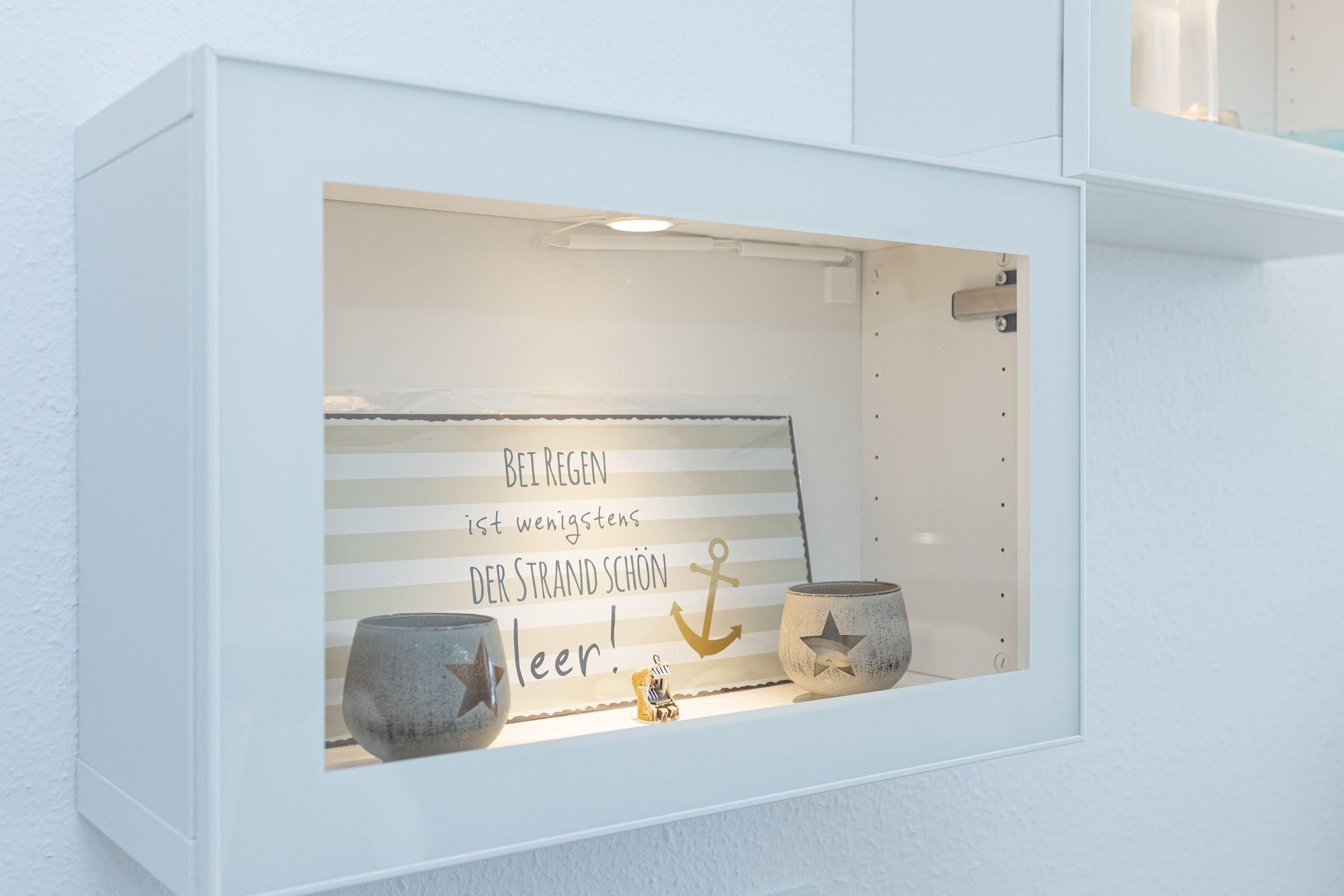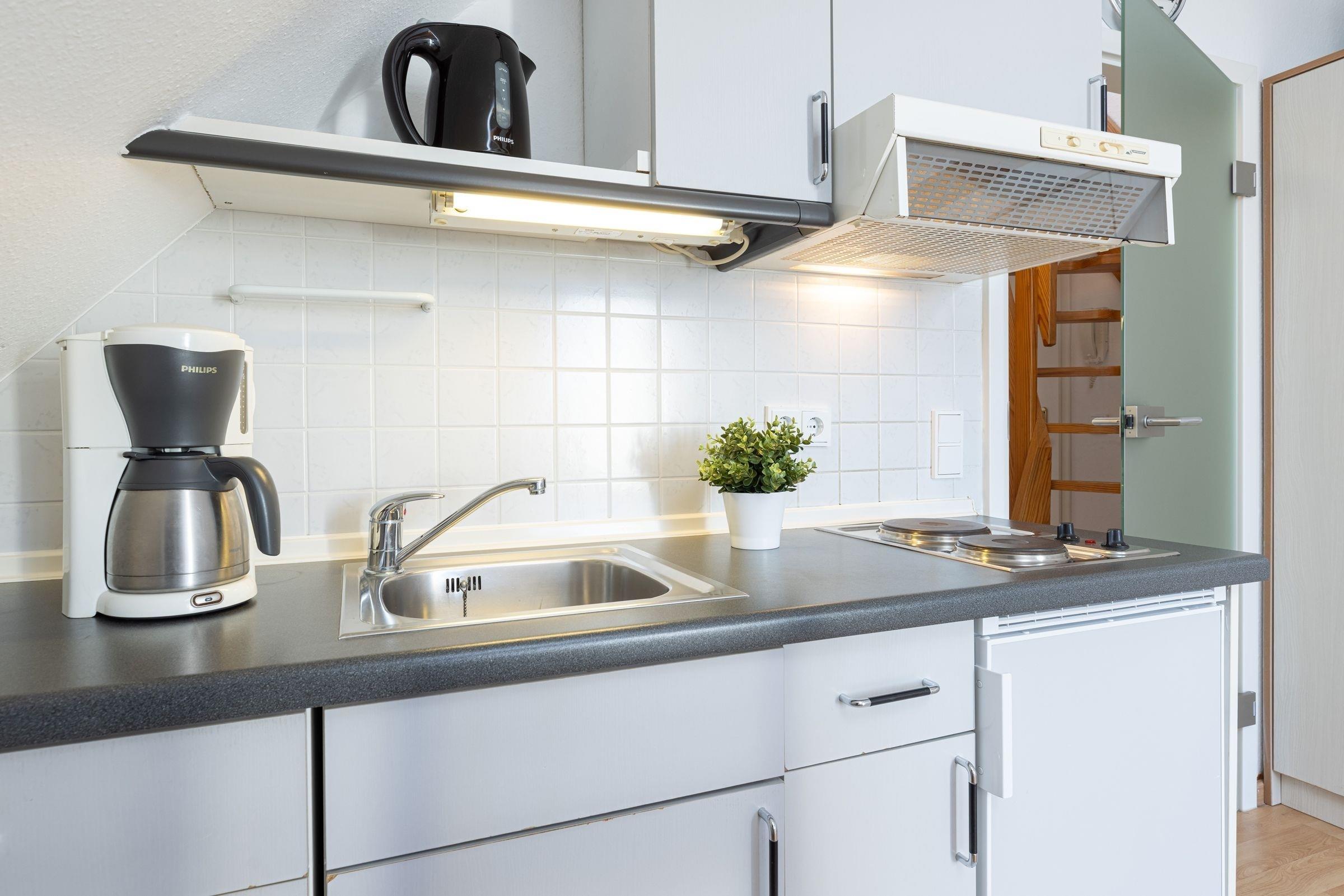 Es empfängt Sie ein gemütliches Wohnzimmer mit einer Küchenzeile. Die Wohnung ist mit einer komfortablen Schlafcouch ausgestattet. Mit nur einem Handgriff verwandeln Sie die Couch in ein bequemes Bett. Außerdem erwartet Sie ein Flachbildfernseher, DVD Player, Stereoanlage, Bücher und Gesellschaftsspiele. Vom Wohnzimmer gelangen Sie auf einen kleinen Balkon, auf dem Sie in der Morgensonne Ihren ersten Kaffee genießen können. Eine Raumspartreppe führt in die behagliche, obere Etage mit Doppelbett und einem großen Dachfenster, von dem aus Sie einen schönen Blick auf die Innenförde haben. Bitte beachten Sie, dass diese Treppe für kleine Kinder und gehbehinderte Menschen nicht geeignet ist.
