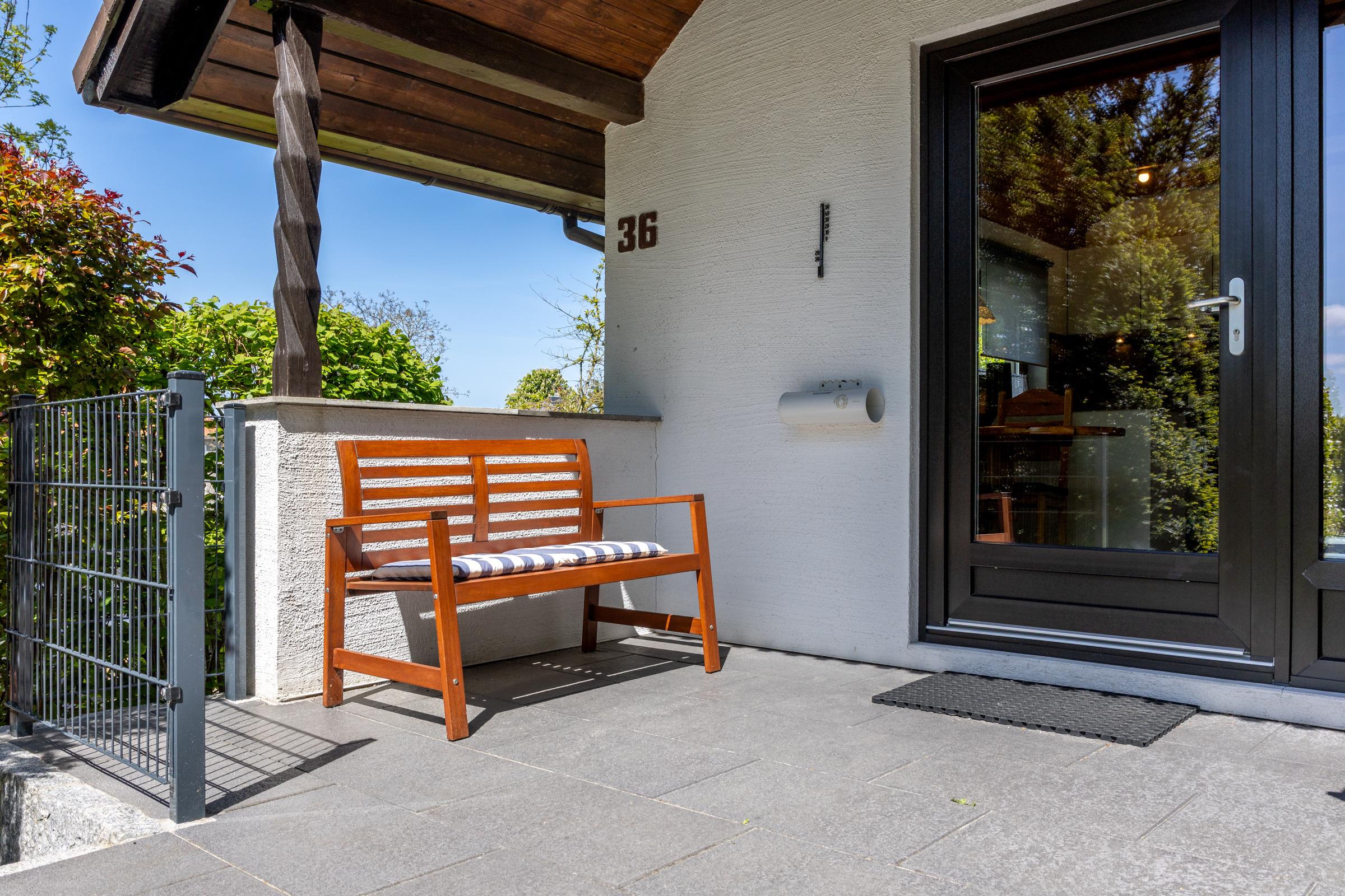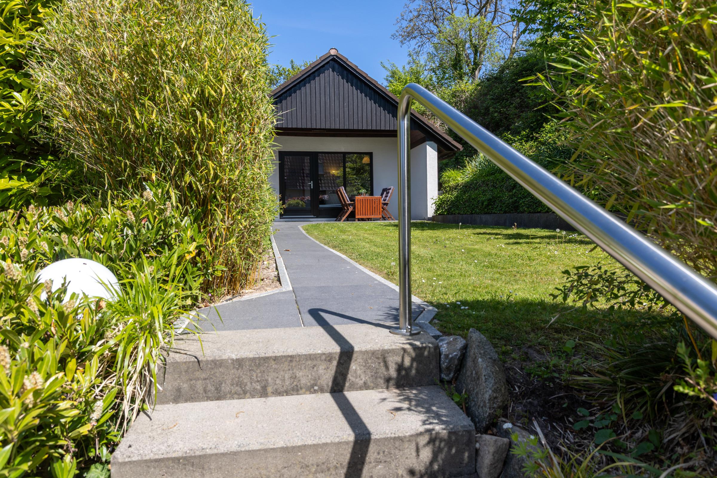 Ein PKW-Stellplatz direkt am Haus steht Ihnen zur Verfügung. Eine Treppe (ca. 12 Stufen) führt Sie zum Ferienhaus.