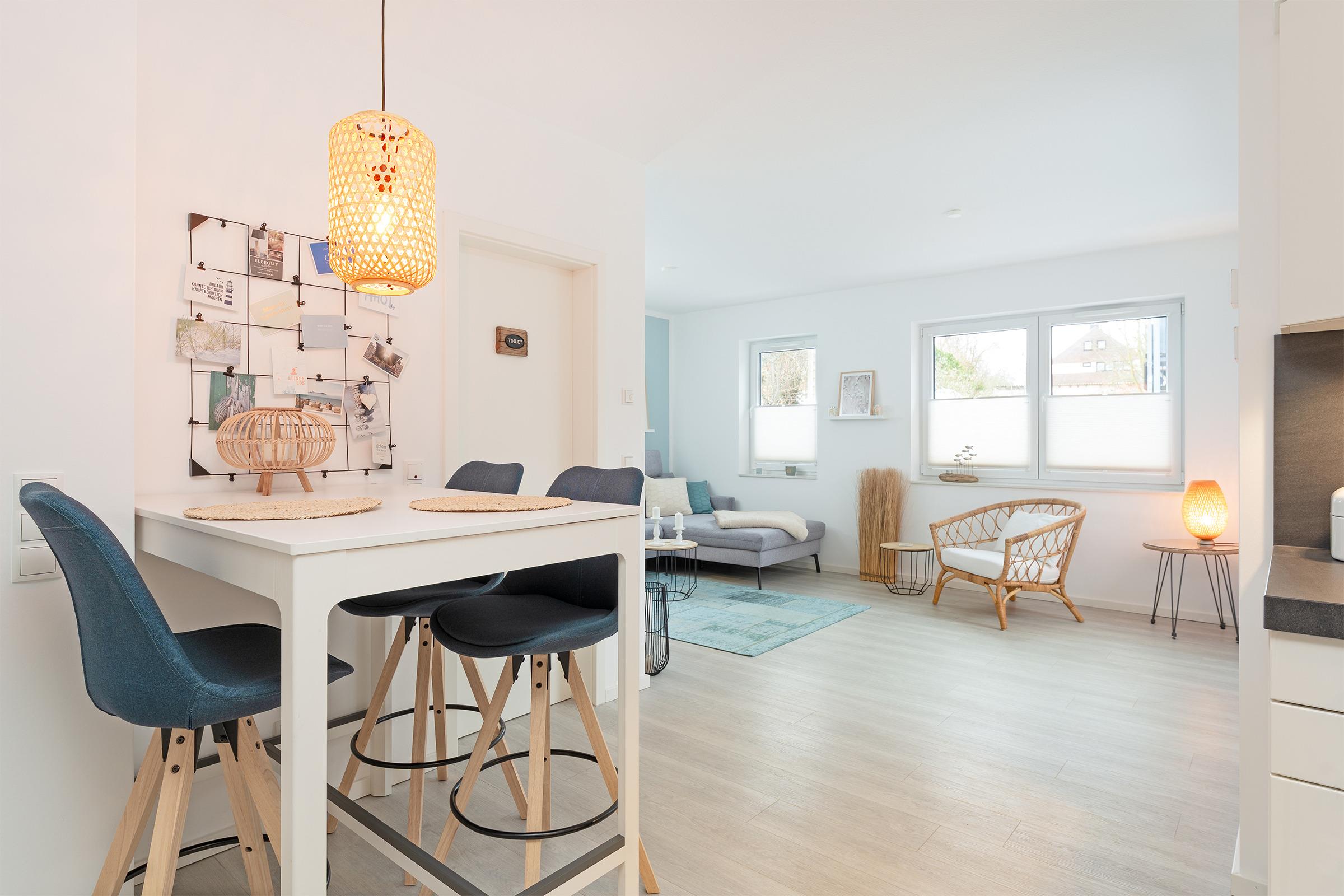 Die offene Küche ist umfassend ausgestattet mit Induktionskochfeld, Dampfgarer, extra Gefrierschrank, Kühlschrank, Spülmaschine, Kaffeemaschine, Toaster und Wasserkocher. Der angrenzende Essbereich lädt zu entspannten Mahlzeiten ein.