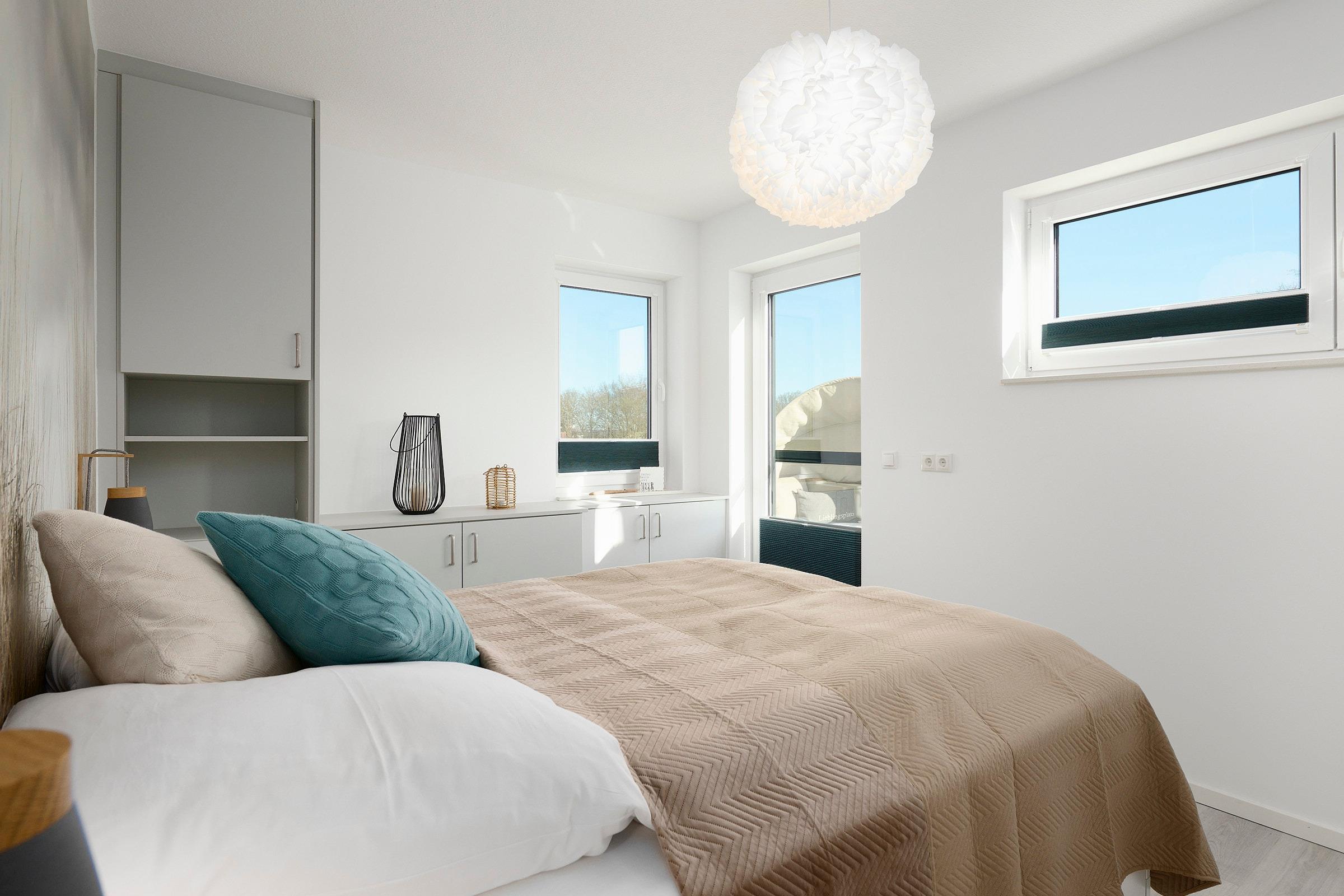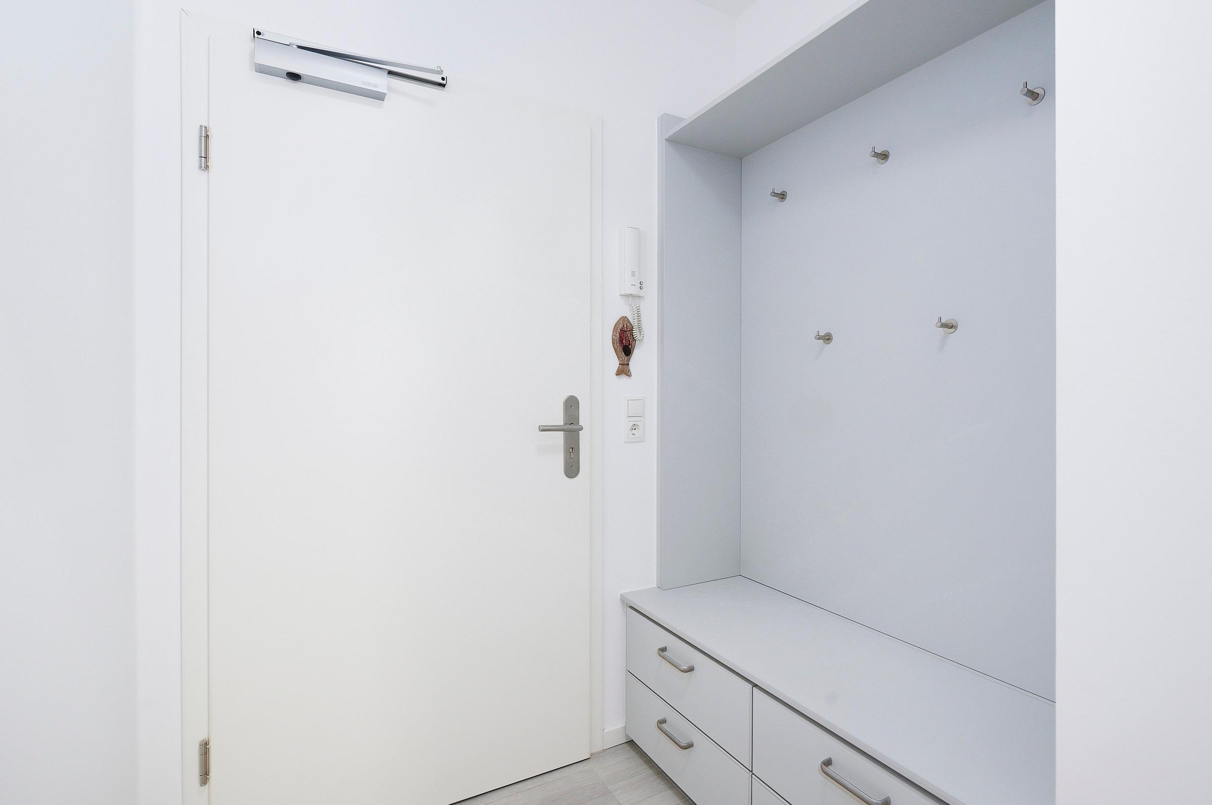 Das Schlafzimmer ist mit einem komfortablen Doppelbett eingerichtet und bietet erholsame Ruhe. Im Bad erwartet Sie eine bodengleiche Dusche mit Haltegriff, ein Handtuchheizkörper, WC und ein Waschbecken – alles modern gestaltet.