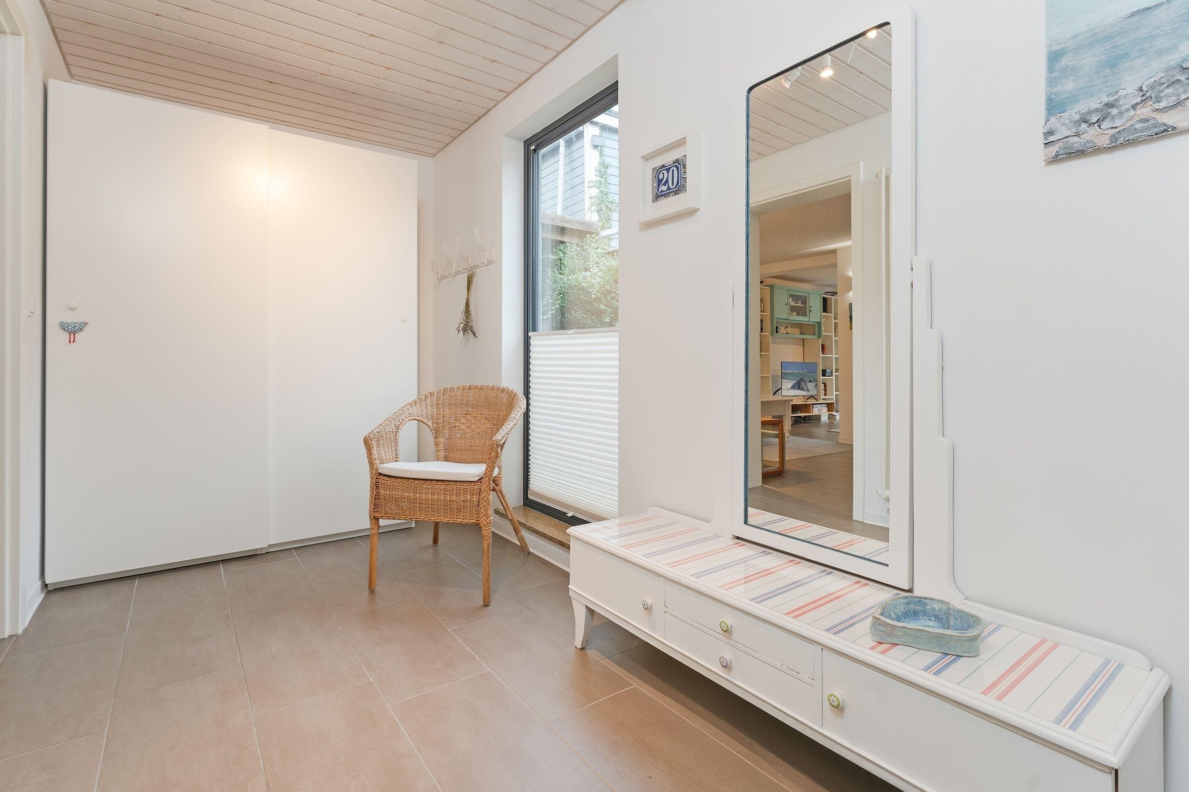 Diese stilvoll eingerichtete Doppelhaushälfte erstreckt sich über zwei Etagen und bietet den idealen Rahmen für einen entspannten Ostseeurlaub. Der helle Wohnbereich verfügt über ein Schlafsofa (ca. 140x200 cm), Kaminofen, Flachbild-TV und Bluetooth-Lautsprecher. Die möblierte Terrasse mit Grill lädt zum Verweilen ein.