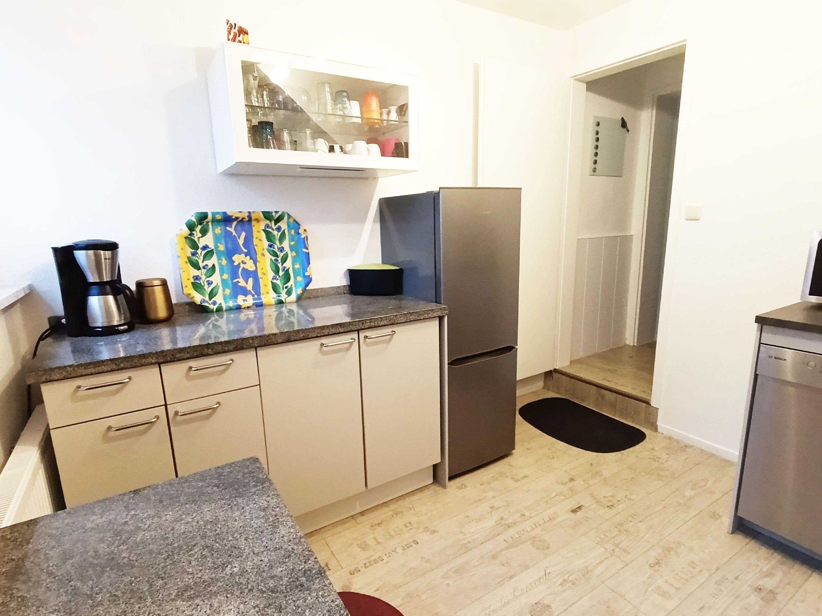 Die separate Küche ist modern eingerichtet und bietet Ihnen genügend Platz, um ein leckeres Essen zuzubereiten. Hierfür stehen Ihnen ein Induktionsherd, ein großer Kühlschrank mit Eisfach, ein Geschirrspüler, eine Mikrowelle und vieles vieles mehr zur Verfügung. Außerdem finden Sie ausreichend Geschirr und Besteck vor. Im Erdgeschoss finden Sie auch das Badezimmer mit Dusche und WC vor.