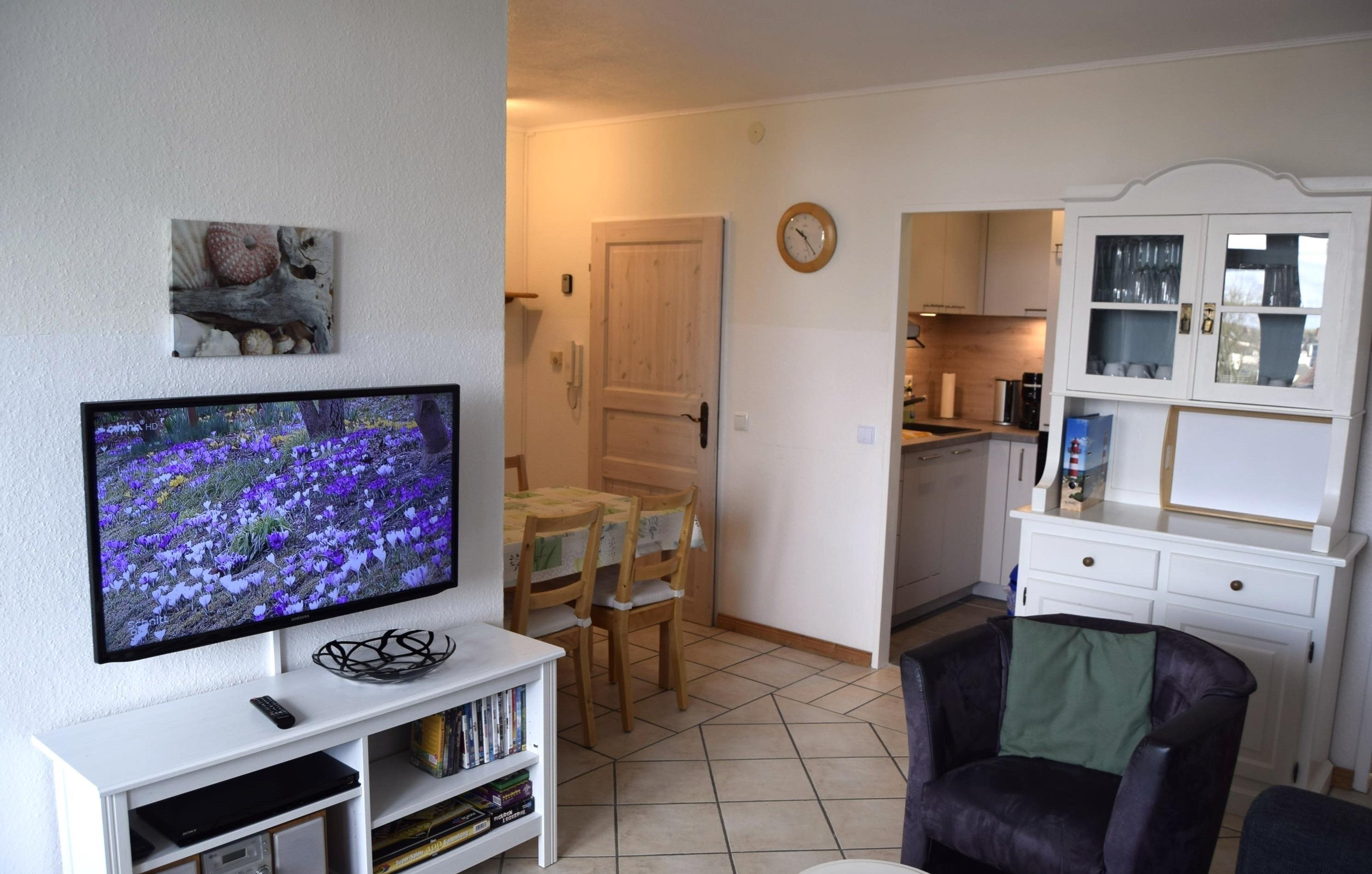 Durch den Flur erreichen Sie das Badezimmer und das modern eingerichtete Wohnzimmer, von dem die kleine Küche sowie die beiden Schlafzimmer abgehen. Die Wohnung bietet ausreichend Platz für vier Personen. Als Schlafgelegenheiten stehen in den beiden Schlafzimmern je zwei Einzelbetten zur Verfügung. Es stehen zwei Parkraumflächen neben dem Haus zur Verfügung. Die Plätze sind nicht fest zugeteilt (je nach Verfügbarkeit). Für Fahrräder stehen zwei abschließbare Räume zur gemeinschaftlichen Nutzung zur Verfügung.
