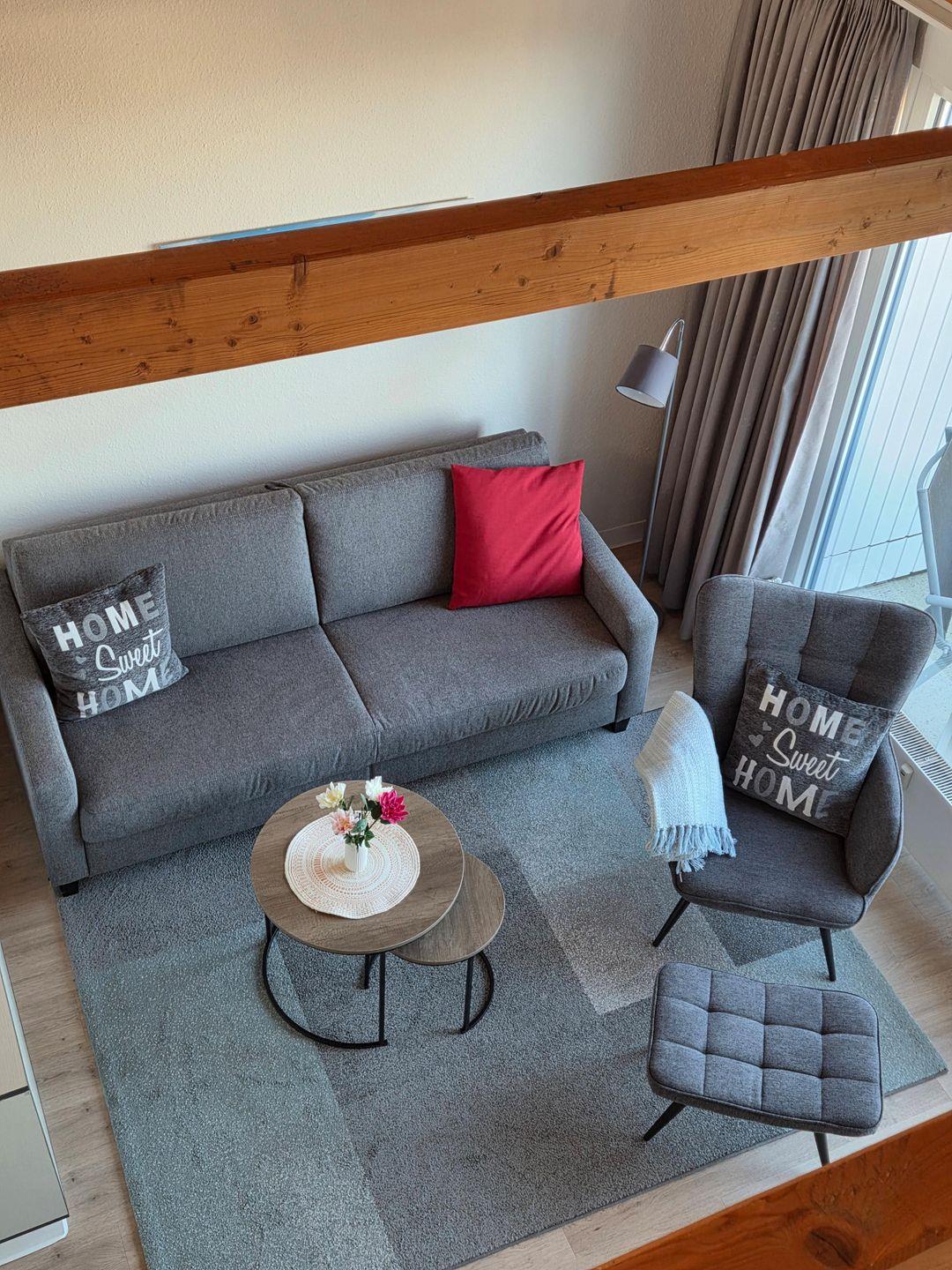 Das ca. 50 qm große Appartement ist für bis zu 4 Personen vorgesehen. Dieses Galerie Appartement ist im Maisonetten-Stil über 2 Etagen gehalten. Es ist mit einem Wohn-, Esszimmer mit Schlafcouch für 2 Personen und einem Doppelbett auf der offenen Galerie ausgestattet. Es verfügt über eine komplett ausgestattete Kitchenette, Mikrowelle, Bad mit Dusche und WC sowie Kabel- TV Flat-Screen), Radio und einen Dachbalkon. Tiere nur auf Anfrage. Kostenfreies WLAN, Parkplatzt vor dem Haus.