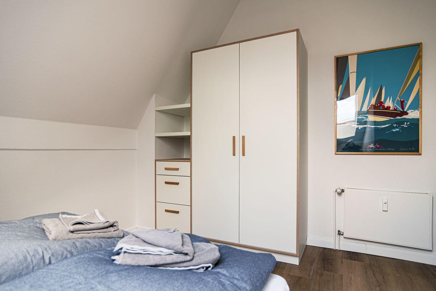Das Schlafzimmer ist mit einem komfortablen Teppichboden ausgestattet und sorgt für ein angenehmes Schlafklima. Hier können Sie sich nach einem aktiven Tag am Strand erholen und die Seele baumeln lassen. Das Badezimmer ist modern gestaltet und verfügt über eine bodengleiche Dusche, ein WC und einen großen Spiegel. Um Ihren Aufenthalt noch angenehmer zu gestalten, stellen wir Ihnen Handtücher, Bettwäsche und eine Erstausstattung bereit.