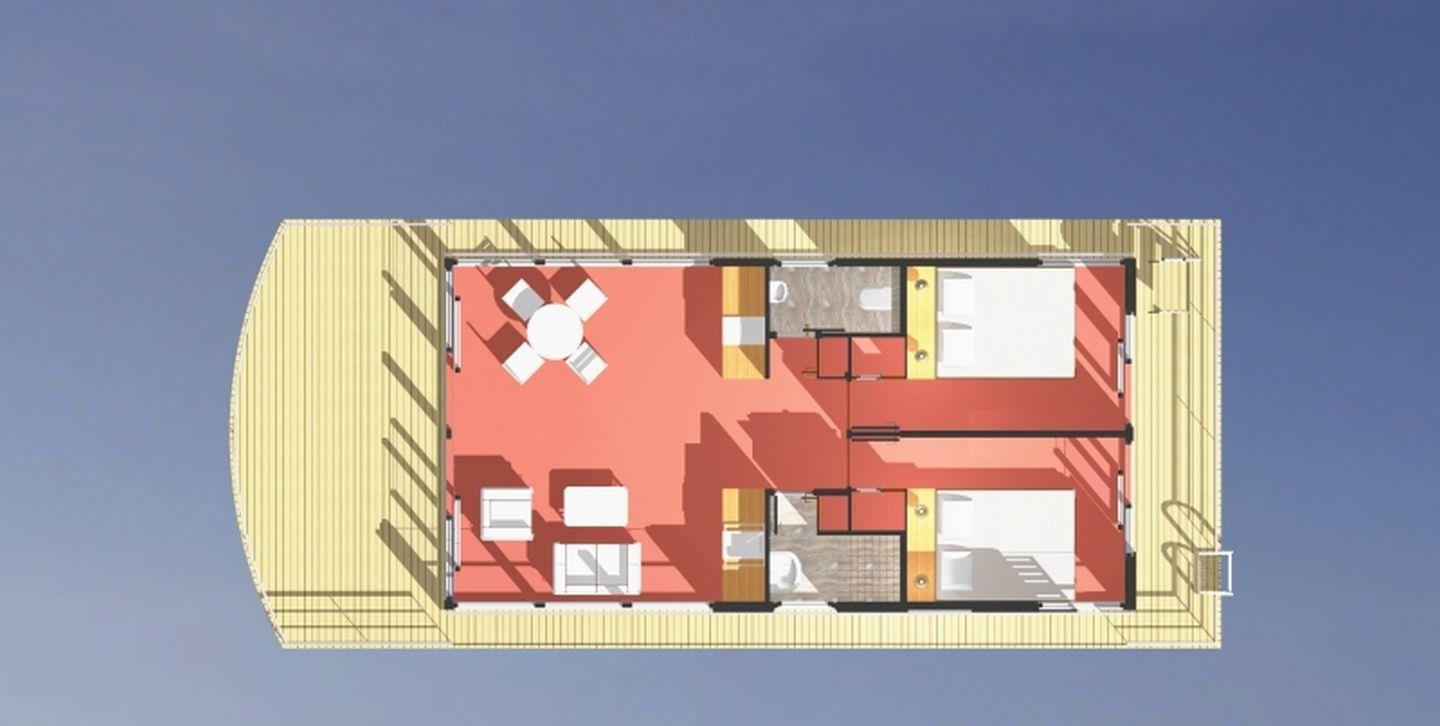 Das FLOATING 44 kann mit bis zu 4 Personen belegt werden. Neben dem großzügigen Wohnbereich mit integrierter Küchenzeile und direktem Zugang zur Terrasse am Bug verfügt das FLOATING 44 über zwei Schlafzimmer mit Doppelbetten. Das Bad mit Dusche und ein WC mit Waschtisch sind jeweils separat angeordnet. Auf dem Dach bietet eine 25 qm große Terrasse zusätzliche Sonnenplätze und einen weiten Blick.