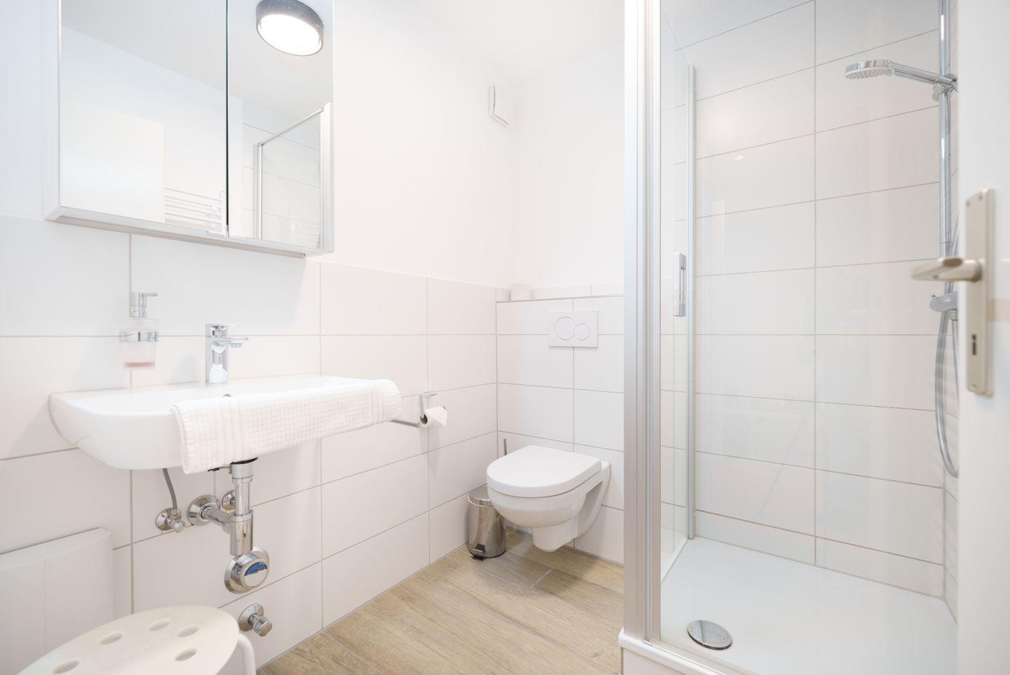Das Badezimmer ist funktional und freundlich eingerichtet und verfügt über eine Dusche und ein WC – ideal für einen belebenden Start in den Tag oder eine entspannte Auszeit nach dem Strandbesuch. Ein Föhn, ein Kosmetikspiegel und ausreichend Stauraum für deine persönlichen Dinge sind selbstverständlich vorhanden.