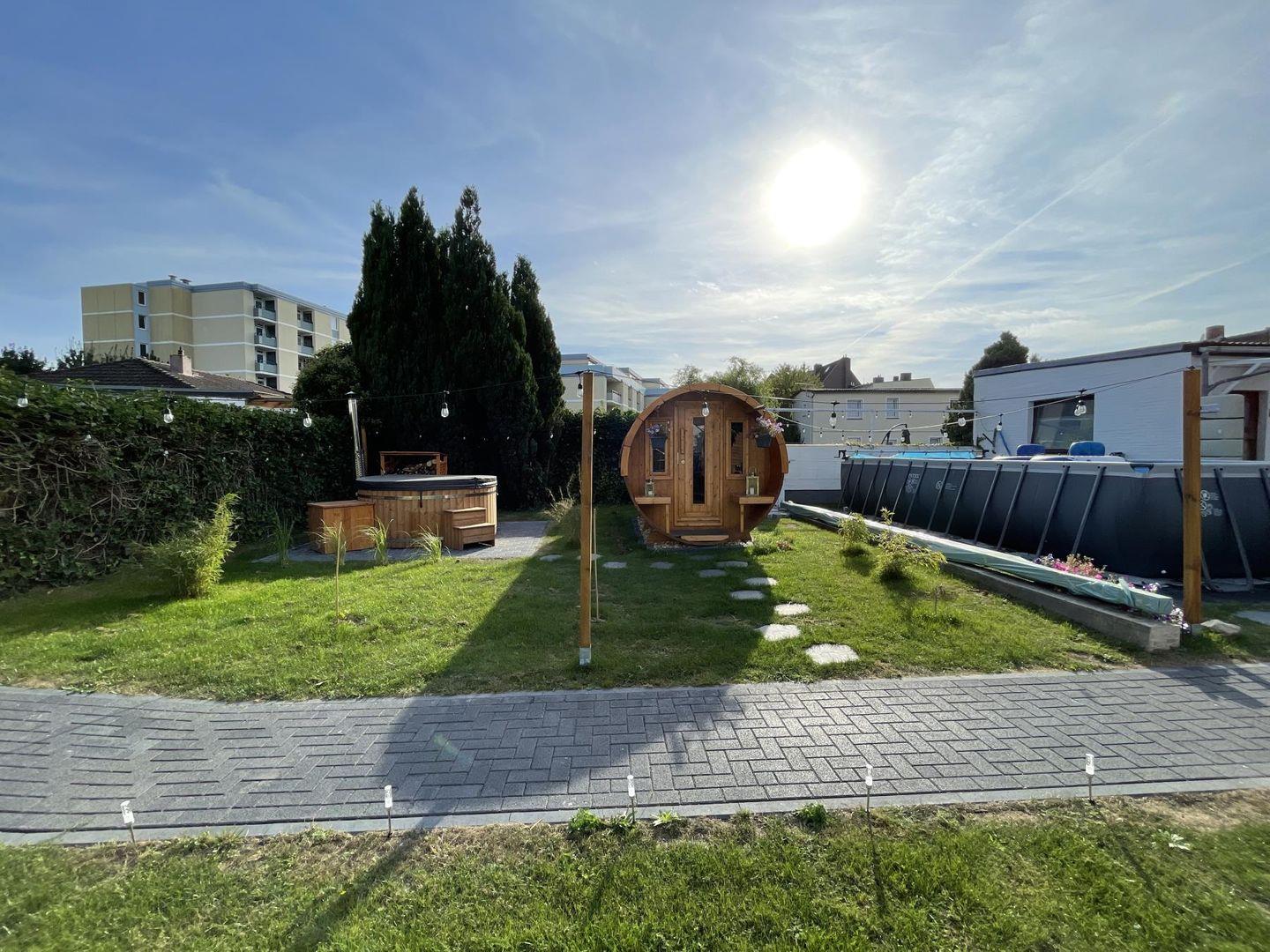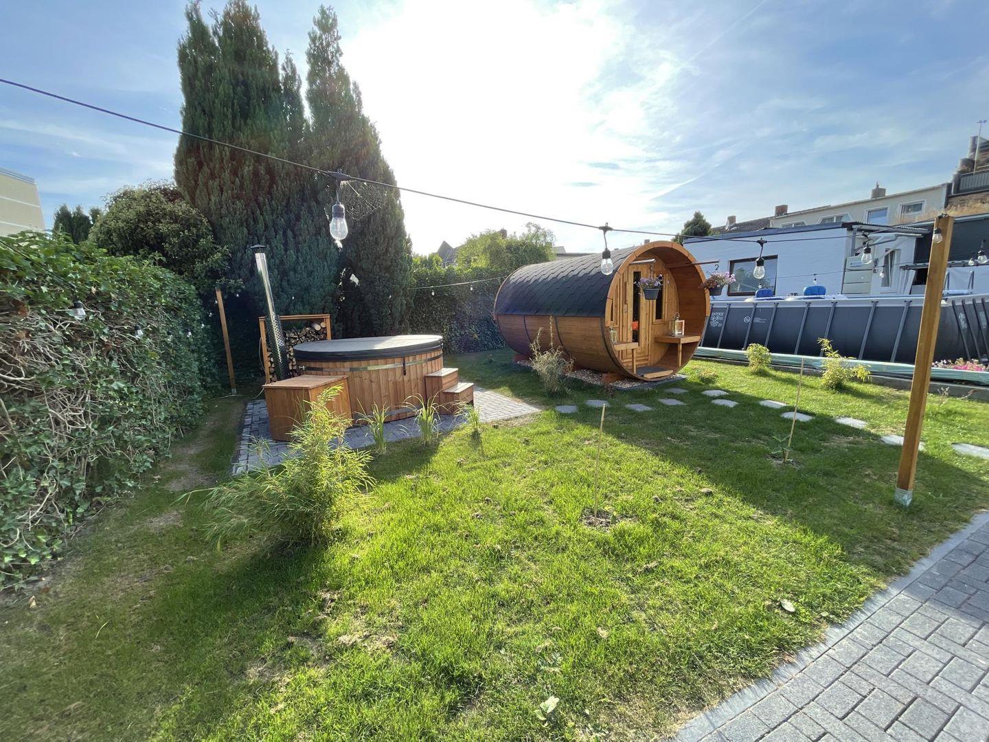 Als Gast der Parkpension kannst du natürlich auch alle weiteren Annehmlichkeiten im Haus nutzen: Auf der großen Dachterrasse im ersten Stock findest du Loungemöbel, Sonnenliegen, Tische und einen Holzkohlegrill. Der Wellnessgarten lädt mit Fass-Sauna, Hot-Tub und saisonalem Pool (Mai bis September) zum Entspannen ein.