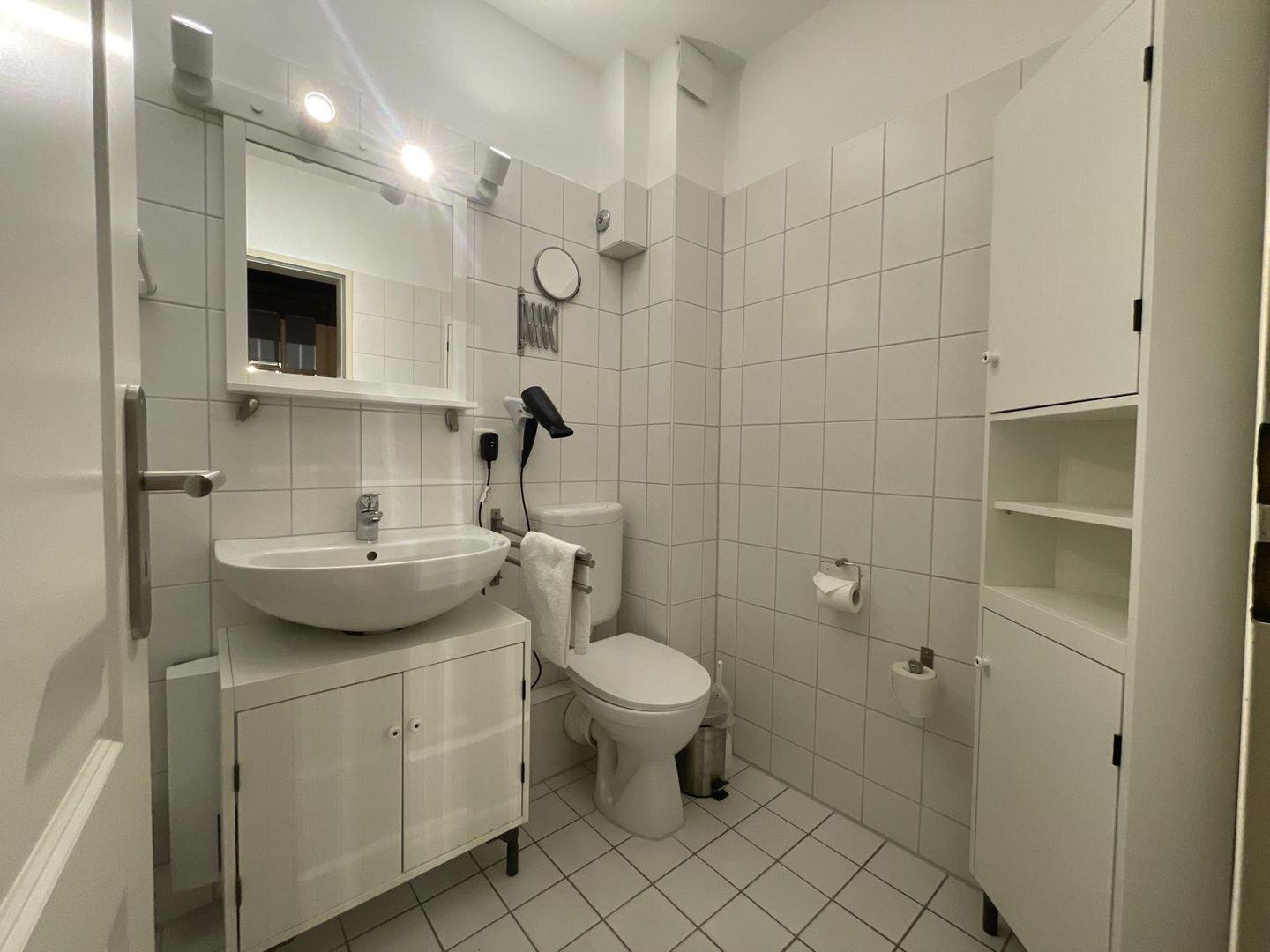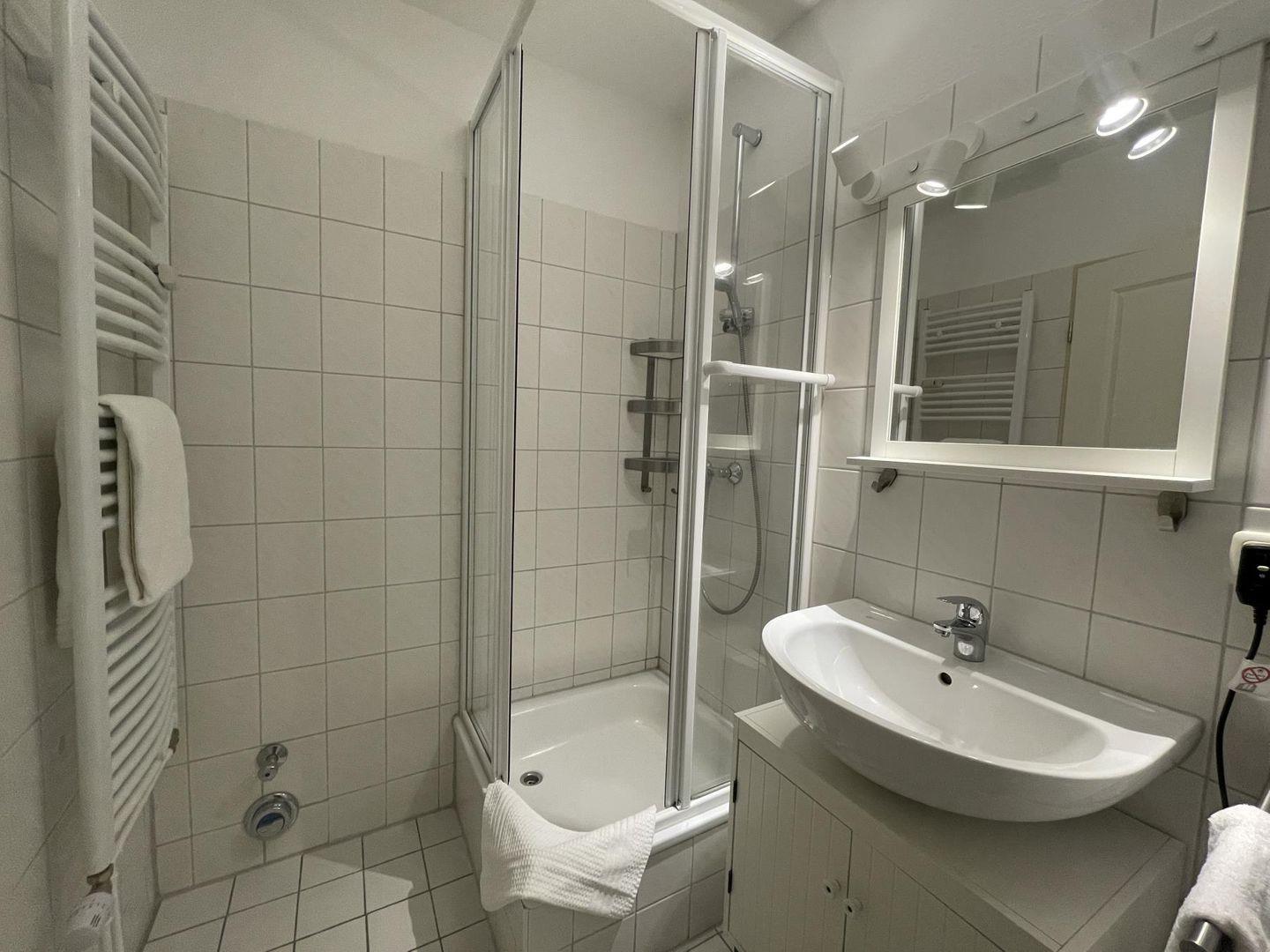 Das Badezimmer ist mit einer Dusche und WC ausgestattet, Haartrockner und Kosmetikspiegel stehen ebenfalls zur Verfügung.