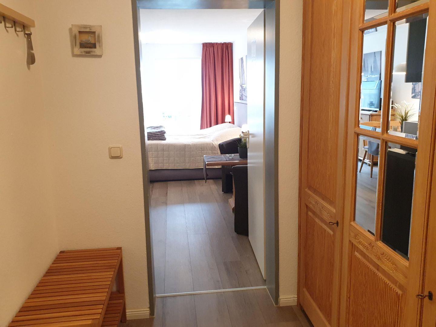 Die Wohnung ist offen und funktional gestaltet: Der kombinierte Wohn-, Schlaf- und Küchenbereich bietet dir ein gemütliches Doppelbett, eine kleine Sitzecke mit TV und eine gut ausgestattete Küchenzeile mit Ceranfeld, Backofen, Kühlschrank mit Gefrierfach und Geschirrspüler. Alles, was du für deine Selbstversorgung brauchst, ist vorhanden.