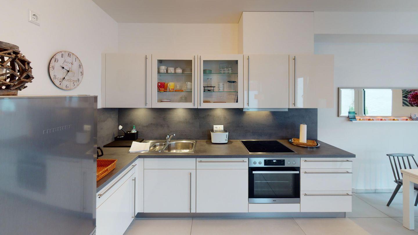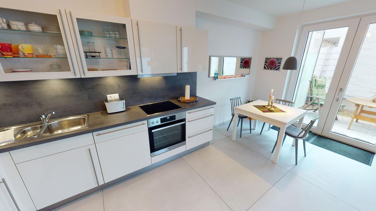 Im Wohnbereich erwartet dich eine gemütliche Sitzgruppe, ein Fernseher und kostenfreies WLAN – perfekt für entspannte Abende. Die offene Küchenzeile ist modern ausgestattet mit Ceranfeld, Backofen, Spülmaschine, Kühlschrank und allem, was du zum Kochen brauchst. Ein praktischer Essplatz ist direkt integriert.