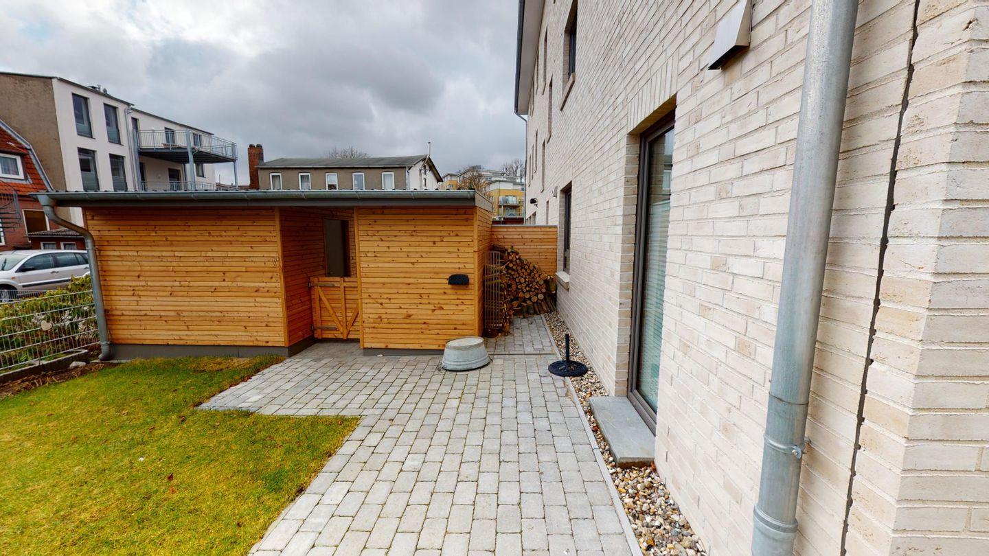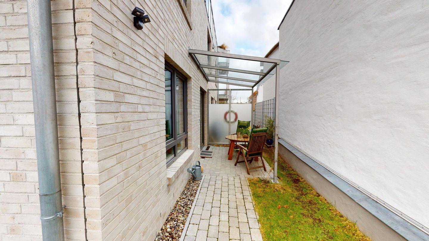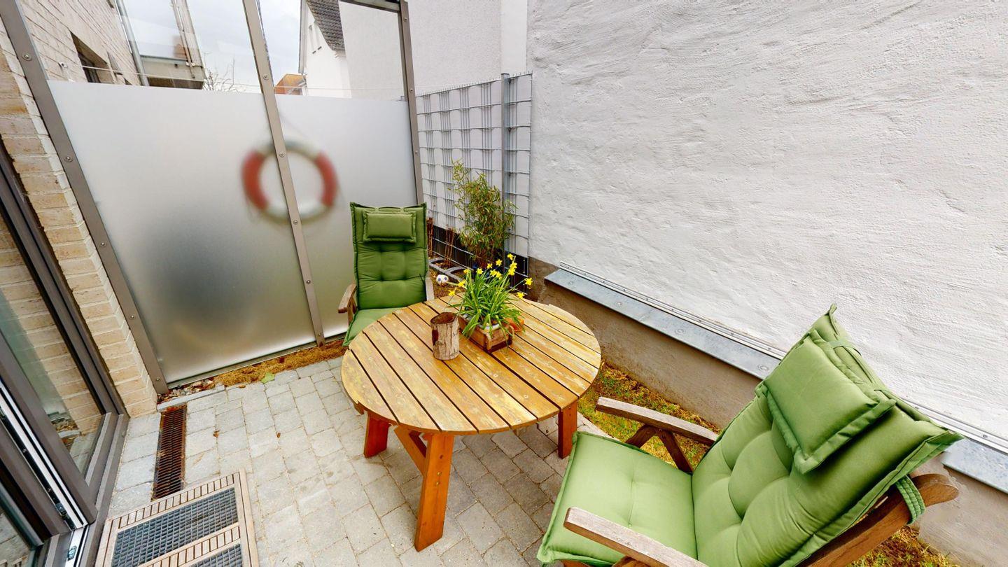 Die möblierte Terrasse mit Blick ins Grüne lädt bei schönem Wetter zum Frühstück, Lesen oder einfach zum Abschalten ein. Versehen mit Glasdach und durch Palisaden geschützt, lädt sie zum Frühstück, Lesen oder einfach zum Abschalten ein. Die direkt anschließende Rasenfläche mit Blumen und Stauden geben der privaten Atmosphäre einen besonderen Charakter.