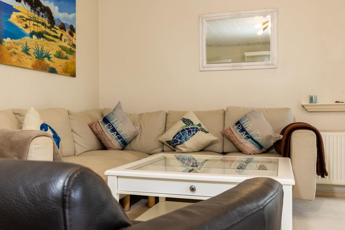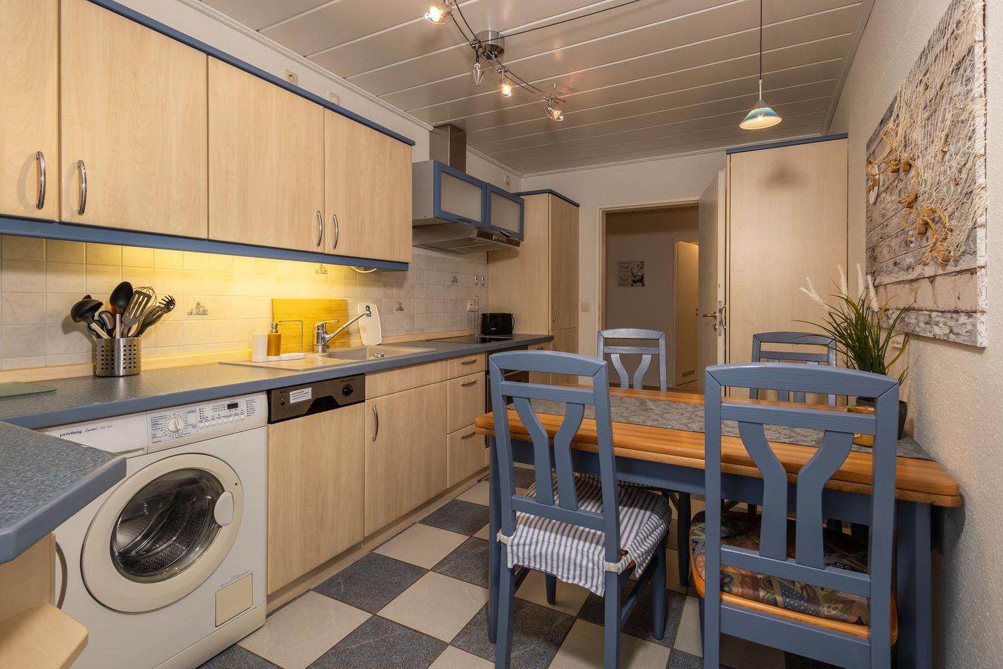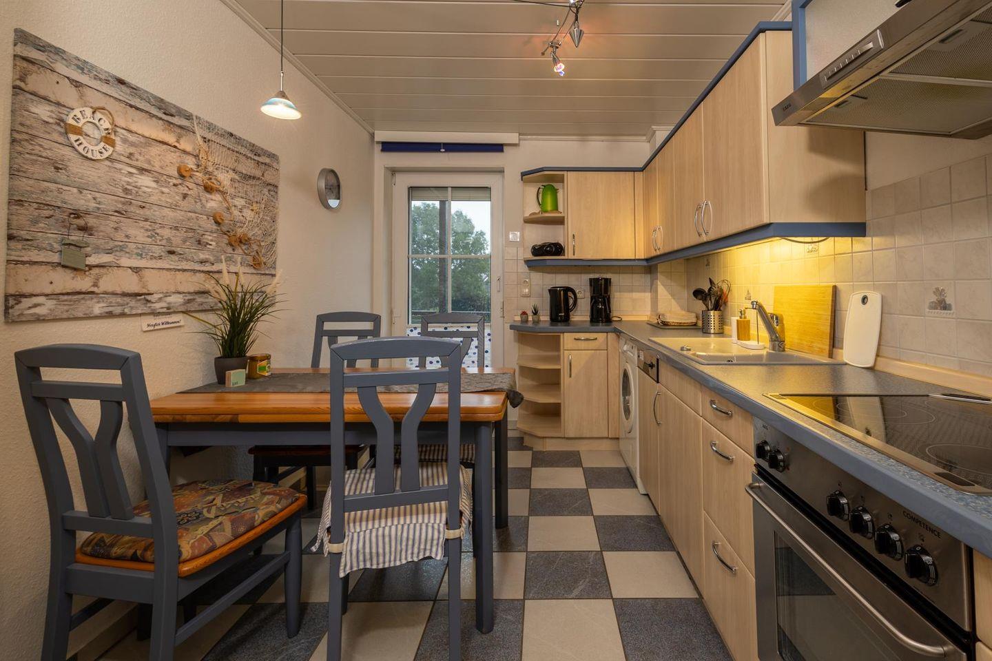 Die Wohnung empfängt dich mit einem hellen Wohnzimmer, in dem eine große Sofaecke zum Ausruhen einlädt – ob mit einem guten Buch, einem Film oder einfach bei einem ruhigen Moment mit Blick nach draußen. Die separate Küche ist voll ausgestattet, damit du dich ganz einfach selbst versorgen kannst: Cerankochfeld, Backofen, Kühlschrank, Spülmaschine, Mikrowelle, Kaffeemaschine und alles, was sonst noch dazugehört. Am Esstisch ist Platz für ausgedehnte Mahlzeiten oder ein schnelles Frühstück, bevor es raus ans Wasser geht.