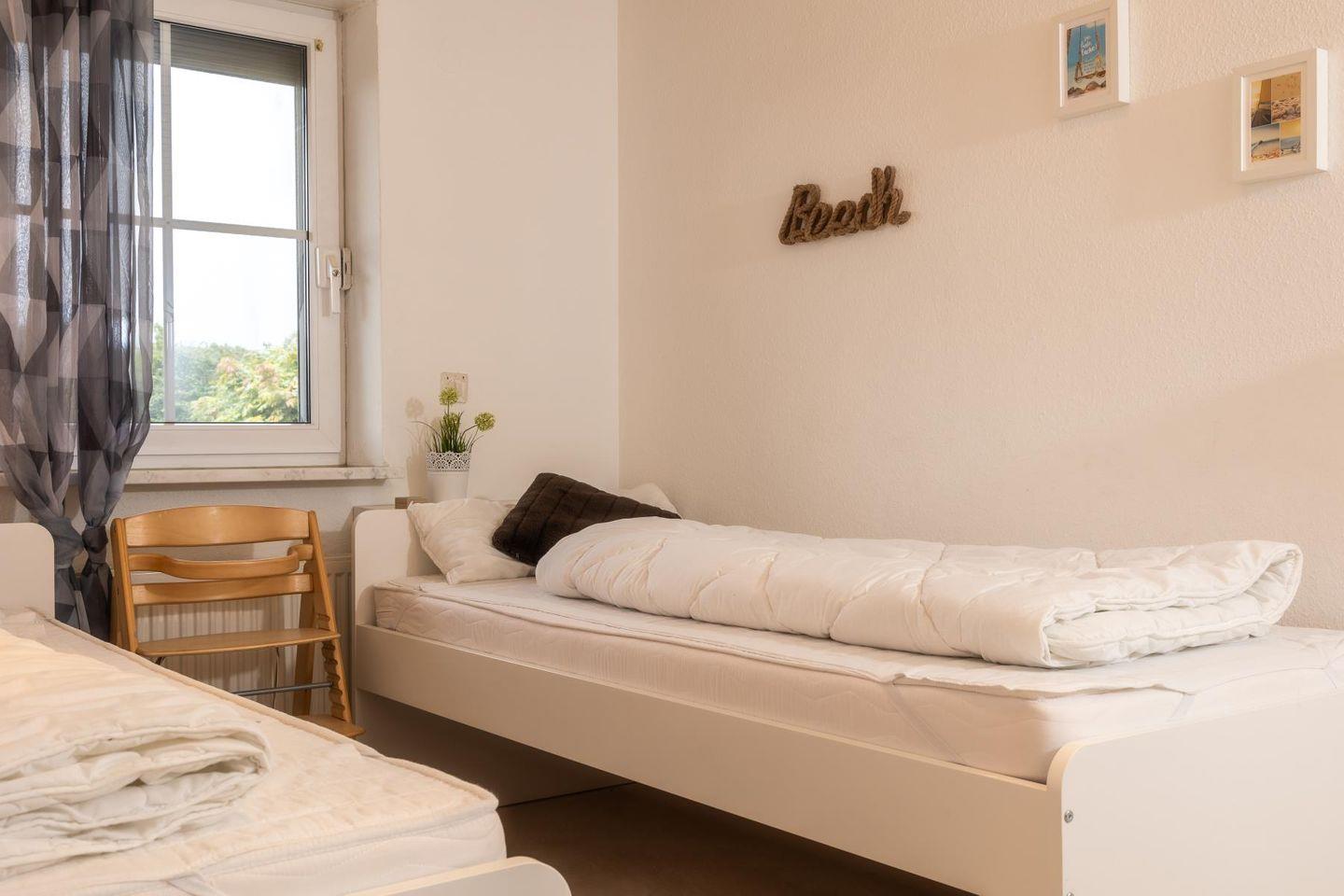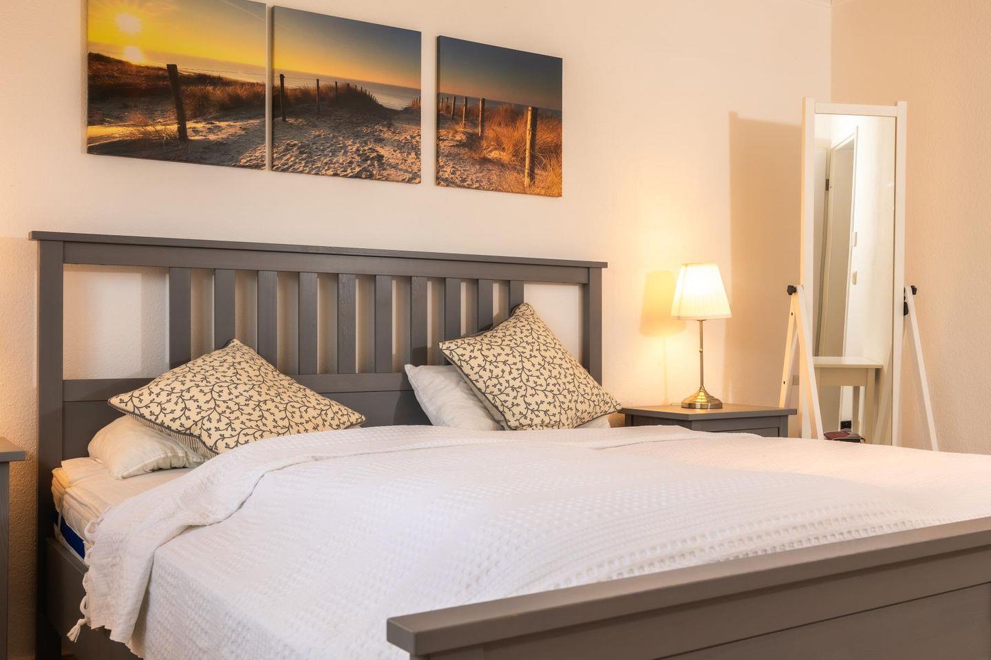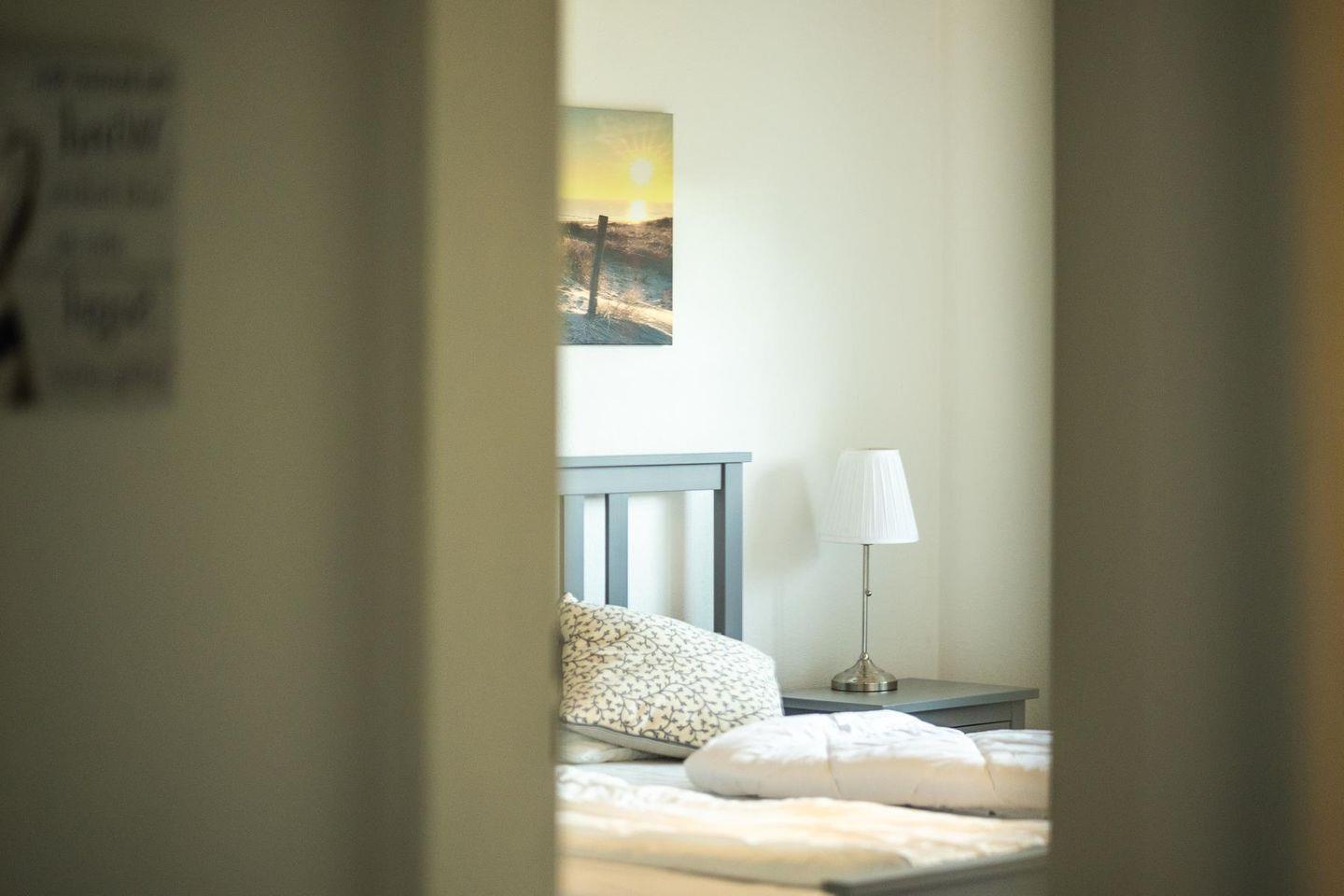 Die beiden Schlafzimmer sind klar und gemütlich eingerichtet. Im einen schläfst du im bequemen Doppelbett, im anderen in zwei Einzelbetten – so hat jeder seinen eigenen Rückzugsort. Das Badezimmer bietet sowohl Dusche als auch Badewanne und ist damit ideal, um sich nach einem Tag am Strand zu erfrischen oder einfach mal abzutauchen. Eine Waschmaschine steht ebenfalls zur Verfügung, falls der Aufenthalt etwas länger dauert.