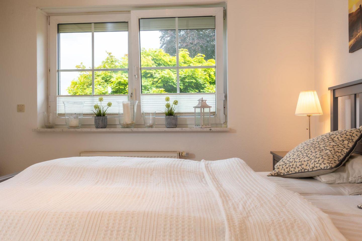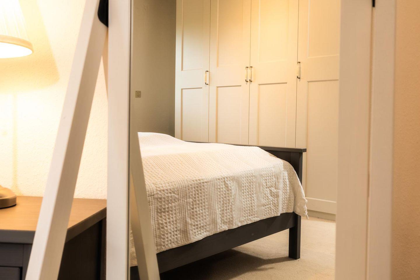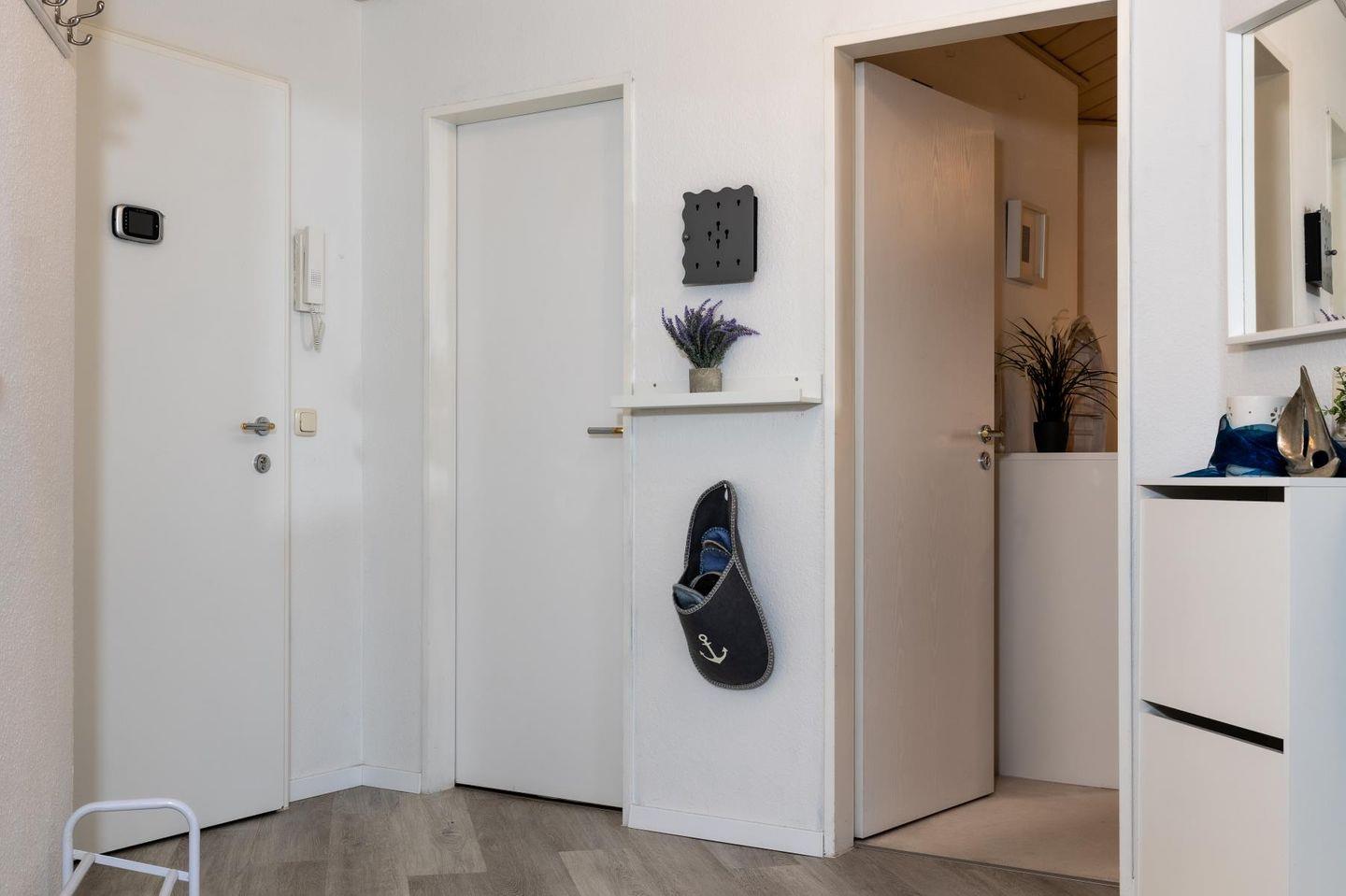 Die beiden Schlafzimmer sind klar und gemütlich eingerichtet. Im einen schläfst du im bequemen Doppelbett, im anderen in zwei Einzelbetten – so hat jeder seinen eigenen Rückzugsort. Das Badezimmer bietet sowohl Dusche als auch Badewanne und ist damit ideal, um sich nach einem Tag am Strand zu erfrischen oder einfach mal abzutauchen. Eine Waschmaschine steht ebenfalls zur Verfügung, falls der Aufenthalt etwas länger dauert.