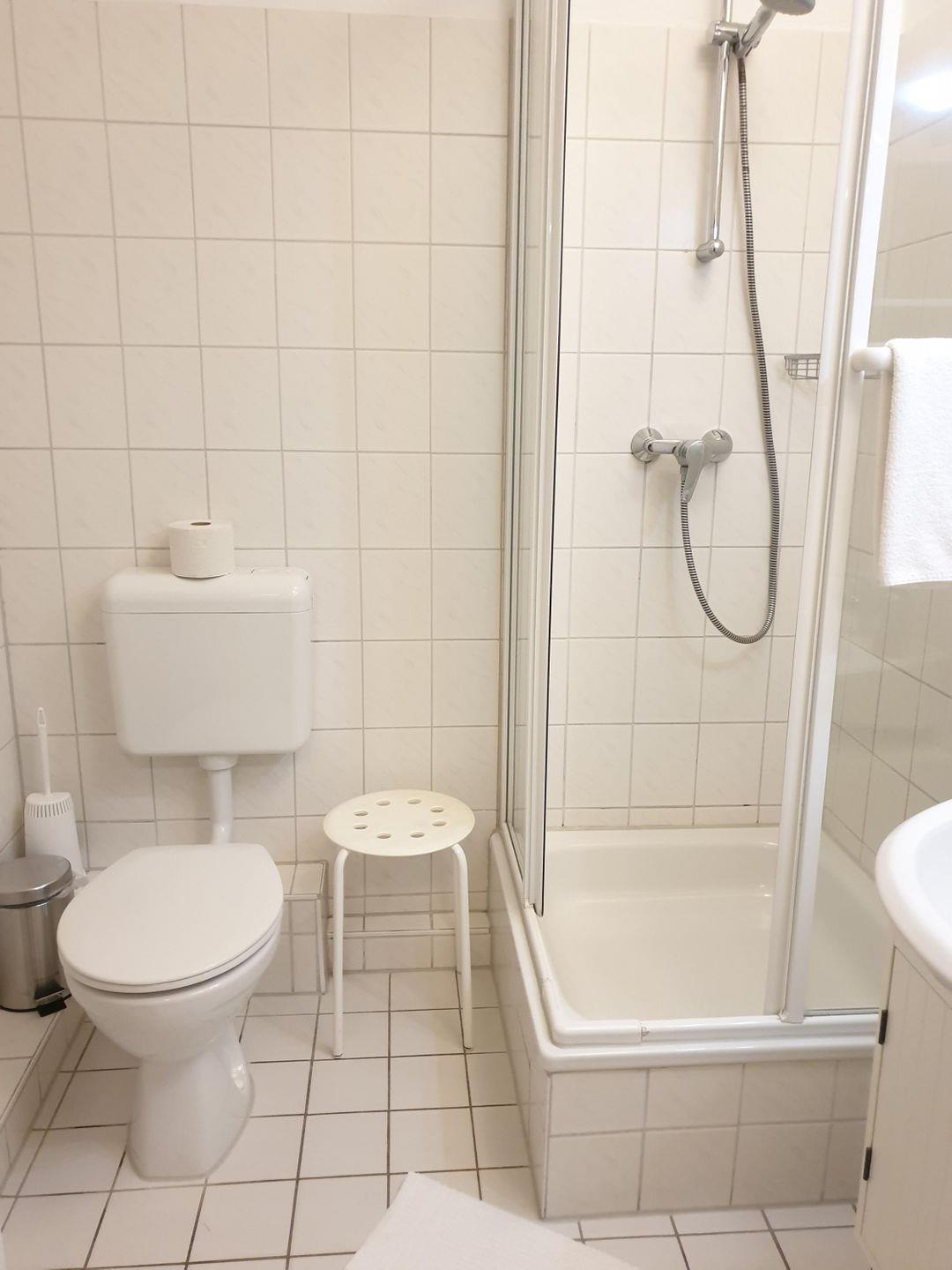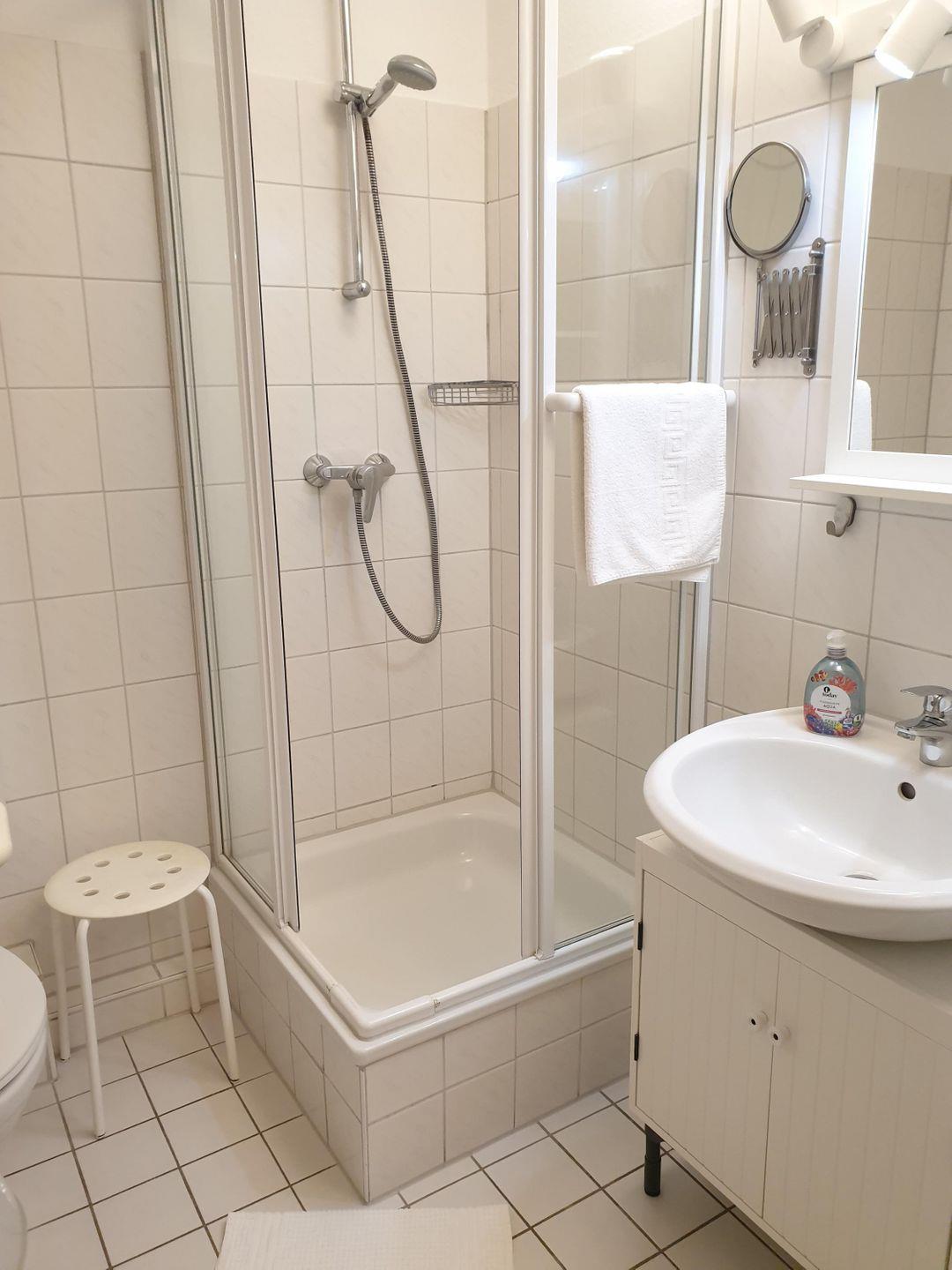 Das Badezimmer verfügt über eine Dusche und WC, außerdem stehen dir ein Haartrockner und ein Kosmetikspiegel zur Verfügung.