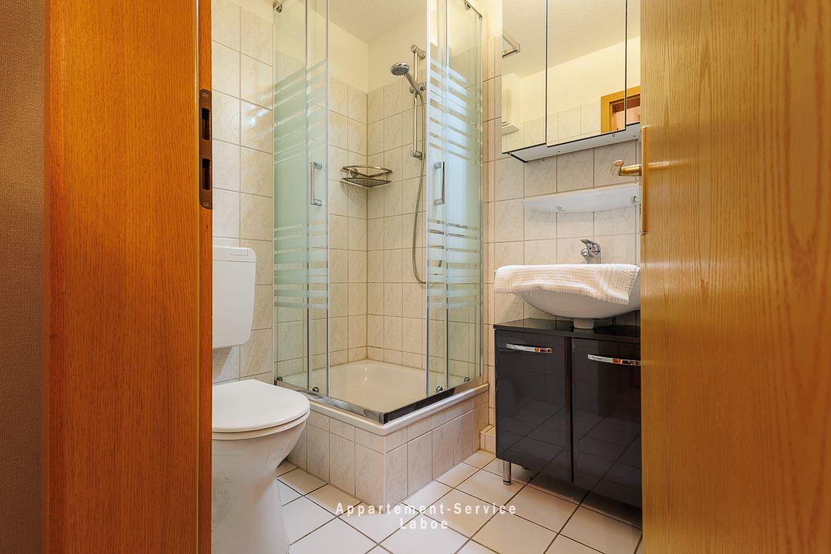 Im unteren Bereich der Wohnung erwartet dich ein heller Wohnraum mit direktem Zugang zum ersten Balkon. Die offene Küchenzeile mit Essplatz fügt sich harmonisch ein und lädt zum Kochen, Plaudern und Genießen ein. Ein kleines Duschbad liegt direkt neben dem Flur. Der Wohnbereich ist zugleich Schlafraum. Hier steht ein komfortables Schrankbett bereit, das sich abends mit wenigen Handgriffen öffnen lässt und dir eine erholsame Nacht verspricht.