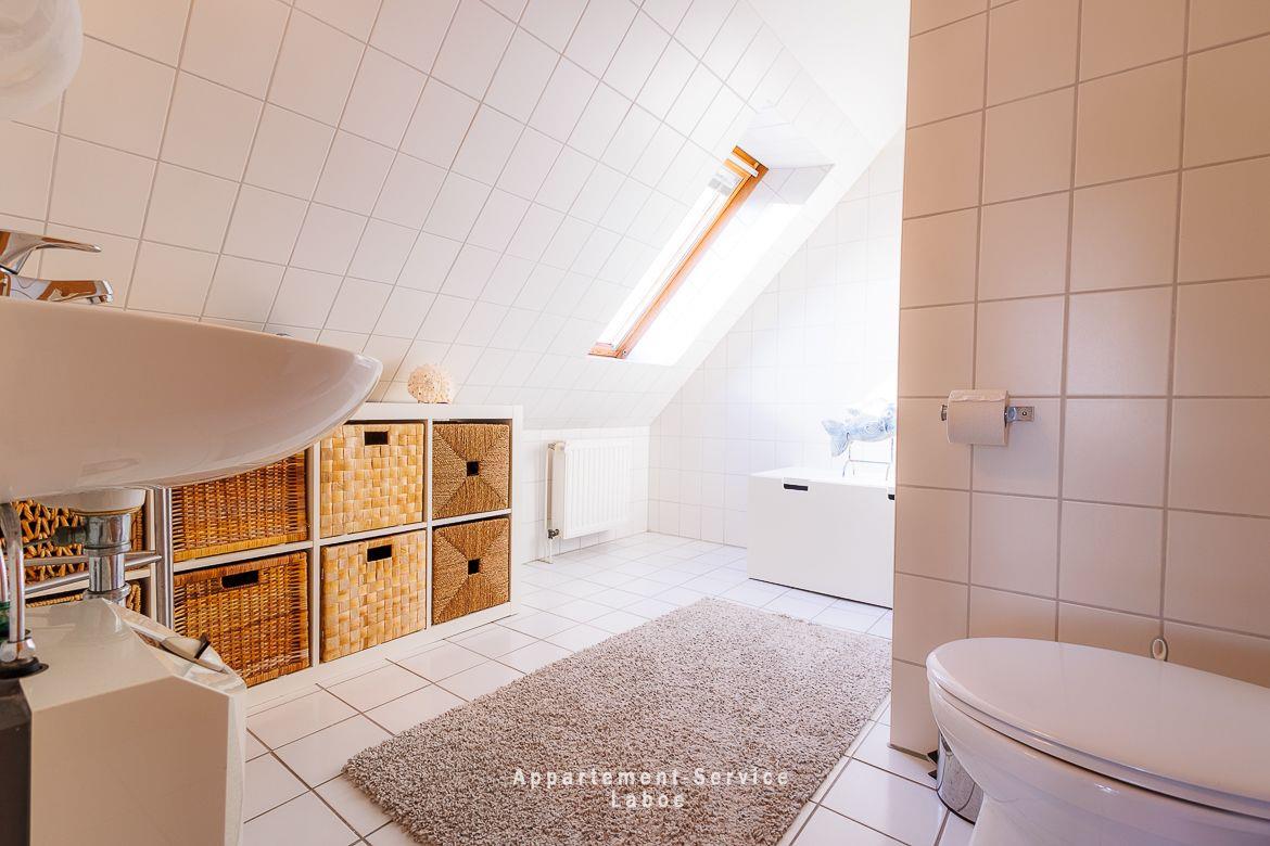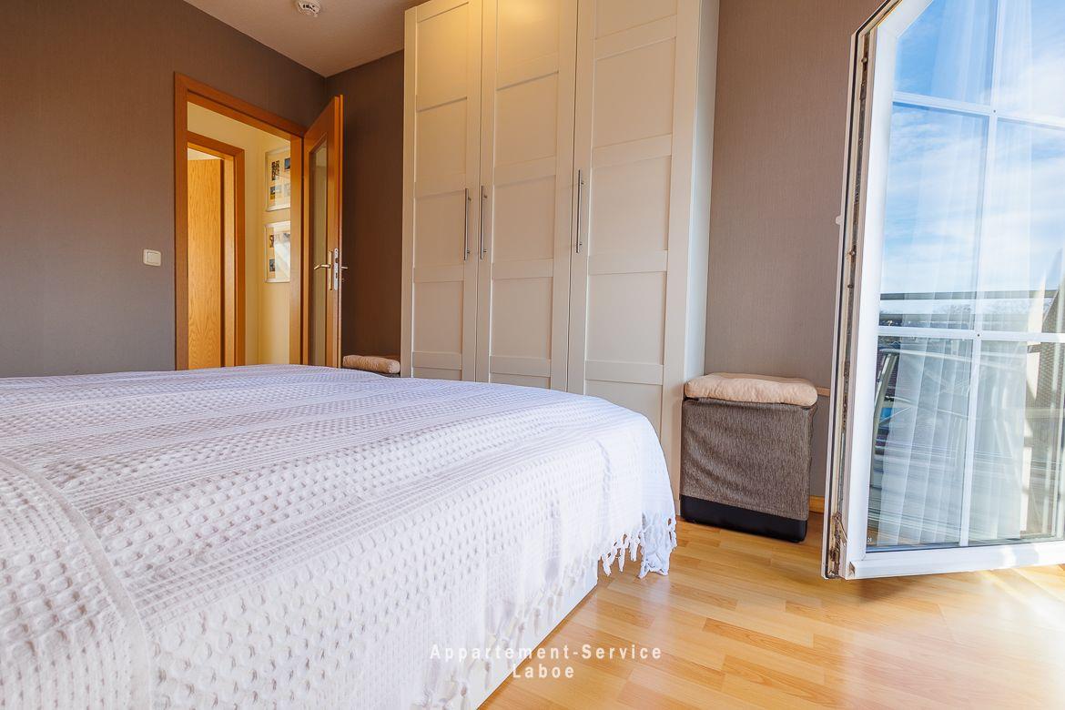 Über eine Treppe gelangst du in die obere Etage. Dort befindet sich das geräumige Schlafzimmer mit Doppelbett und Zugang zum zweiten Balkon. Direkt daneben liegt ein weiteres Badezimmer.