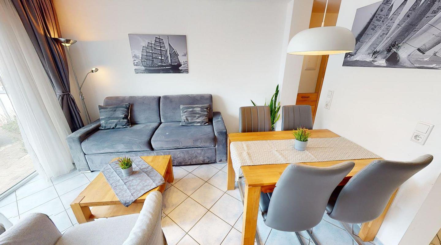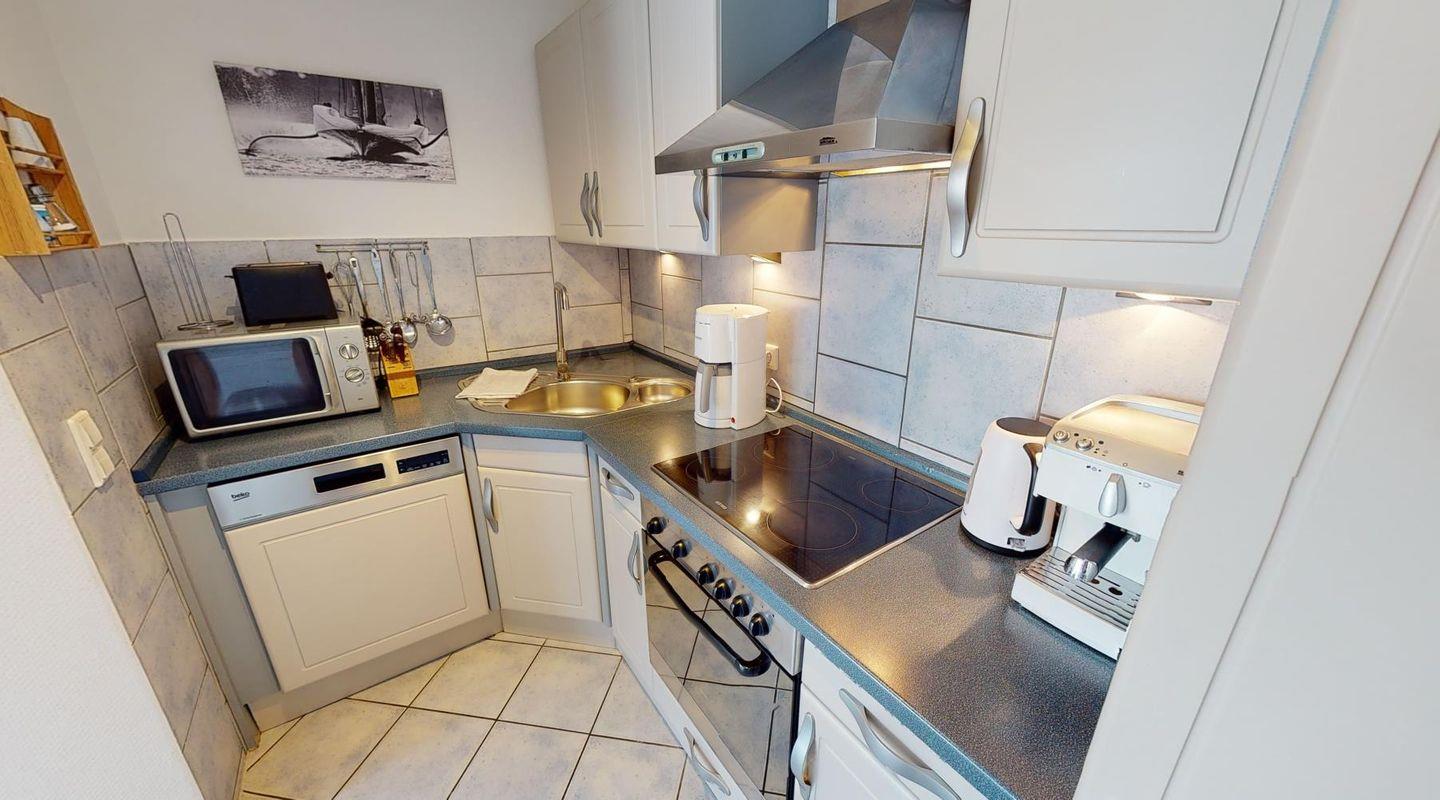 Mit 48 m² bietet die Wohnung genügend Raum für bis zu vier Personen – ideal für Paare, kleine Familien oder alle, die es sich einfach gutgehen lassen wollen. Der helle Wohnbereich verbindet eine gemütliche Sofaecke mit einem Esstisch und einer offenen Küche. Die Ausstattung lässt keine Wünsche offen: Cerankochfeld, Backofen, Spülmaschine und eiine Kaffeemaschine sorgen für Komfort und Genuss.