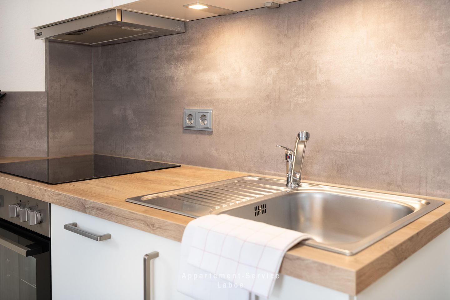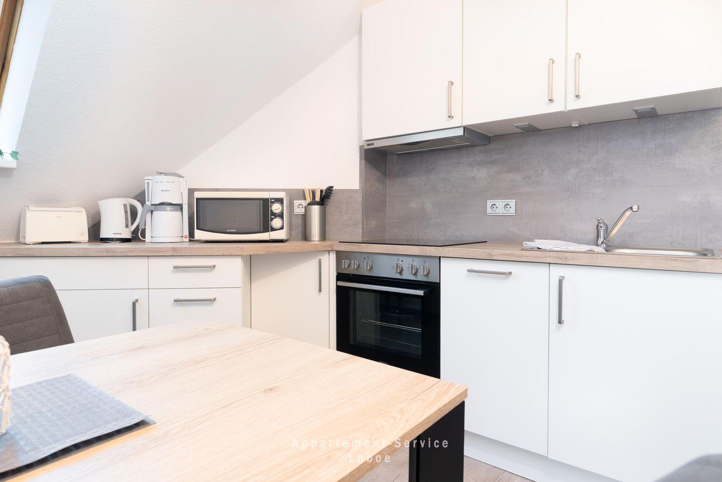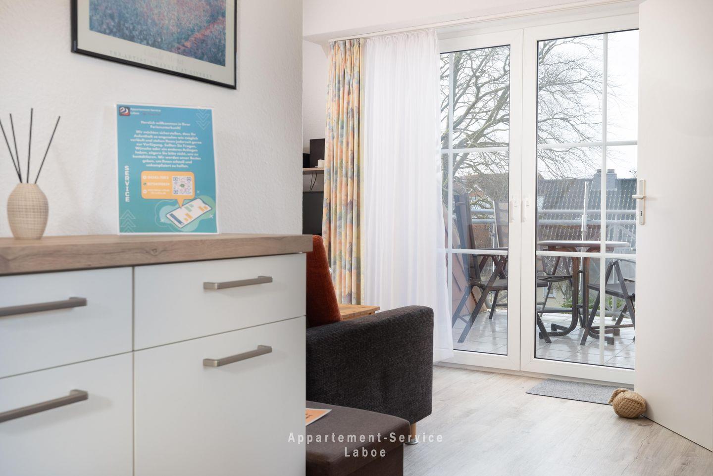 FeWo Kapitänshaus W13: 2-Zimmer-Wohnung, 40 m², im 1. Obergeschoss, für bis zu 4 Personen. Wohnbereich mit Schlafcouch, TV, HiFi-Anlage, Essplatz und Zugang zum Balkon. Offene Küche mit Ceranfeld, Backofen, Mikrowelle, Geschirrspüler und Kühlschrank. Schlafzimmer mit Doppelbett. Badezimmer mit Dusche und WC. WLAN. Balkon. Tiefgaragenstellplatz (Durchfahrtshöhe max. 1,90 m). Fahrradabstellplatz und Waschraum mit Waschmaschine und Trockner (Münzeinwurf) im Haus. Zentrale Lage im Ortszentrum von Laboe, ca. 120 m zum Strand, fußläufig zum Hafen und Kurpark.