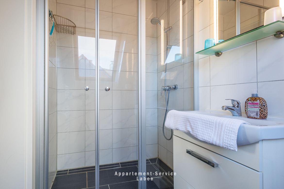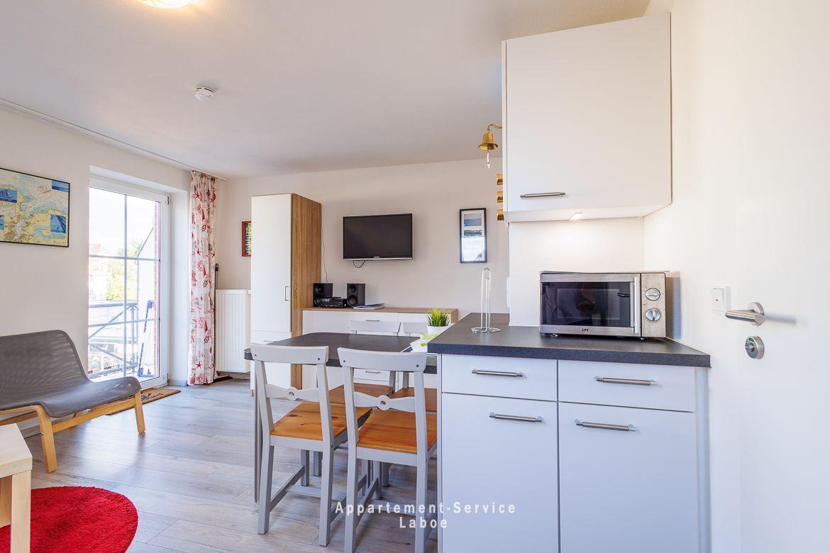 FeWo Kapitänshaus W17 „Seemann Budle“: 2-Zimmer-Wohnung, ca. 40 m², im 2. Obergeschoss, für bis zu 4 Personen. Wohnbereich mit Schlafcouch, TV, HiFi-Anlage, WLAN, Essplatz und Zugang zum Balkon mit seitlichem Meerblick. Offene Küche mit Cerankochfeld, Backofen, Mikrowelle, Kühlschrank mit Gefrierfach und Spülmaschine. Schlafzimmer mit Doppelbett. Badezimmer mit bodengleicher Dusche und WC. Tiefgaragenstellplatz (Durchfahrtshöhe max. 1,90 m). Fahrradabstellplatz und Waschraum mit Waschmaschine und Trockner (Münzeinwurf) im Haus. Ca. 120 m zum Strand, fußläufig zum Hafen, Promenade und Kurpark