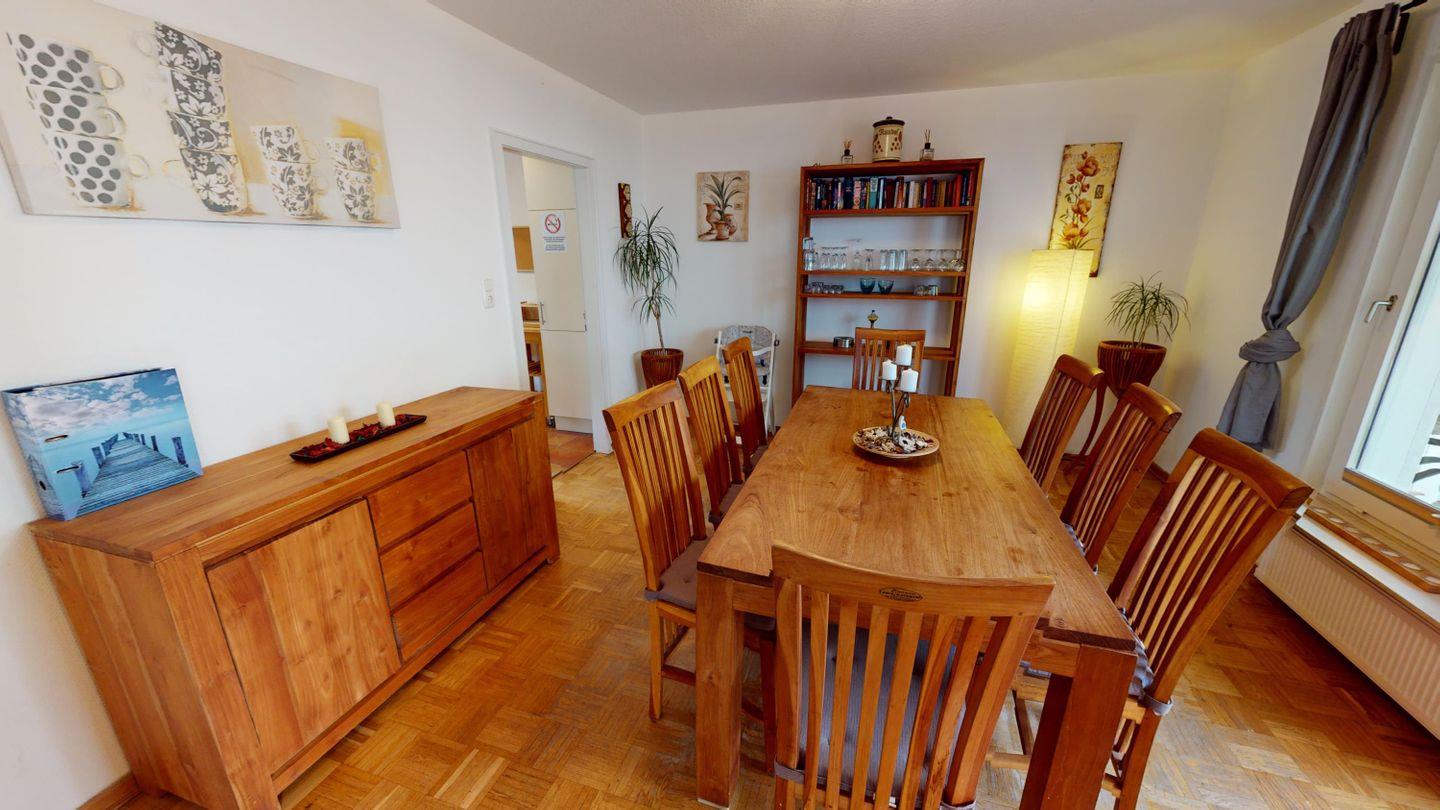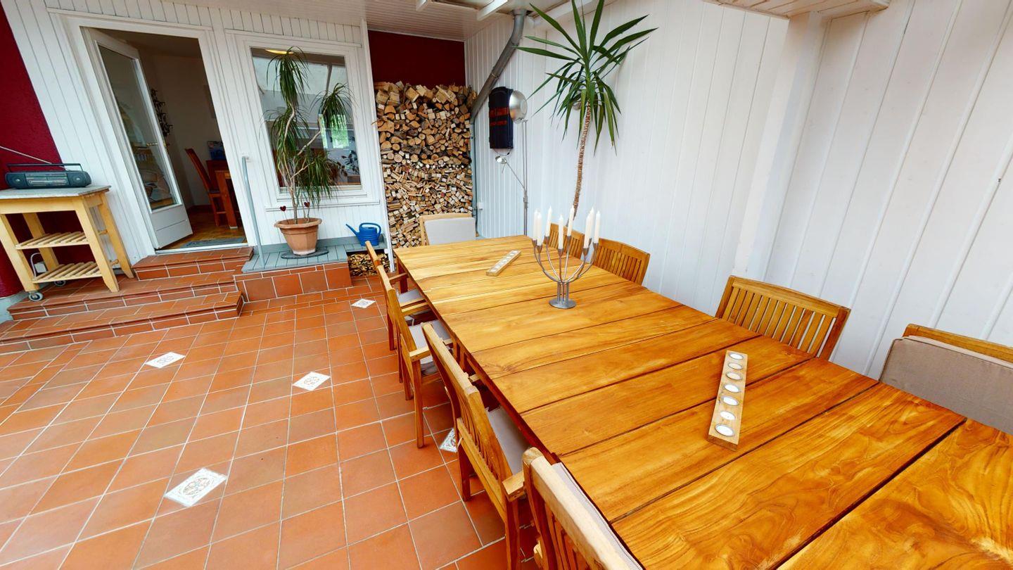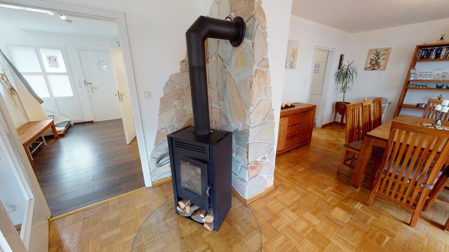 Das Haus bietet Platz für bis zu 12 Personen und überzeugt durch eine durchdachte Raumaufteilung auf drei Ebenen. Das Herzstück ist das helle Wohnzimmer mit Kaminofen und gemütlicher Sitzgruppe, in dem ihr gemeinsam entspannen, lesen oder bei einem Filmabend zusammenkommen könnt. Direkt vom Wohnzimmer aus erreichst du die überdachte Terrasse. Ein idealer Ort für Frühstück im Freien oder einen geselligen Abend.