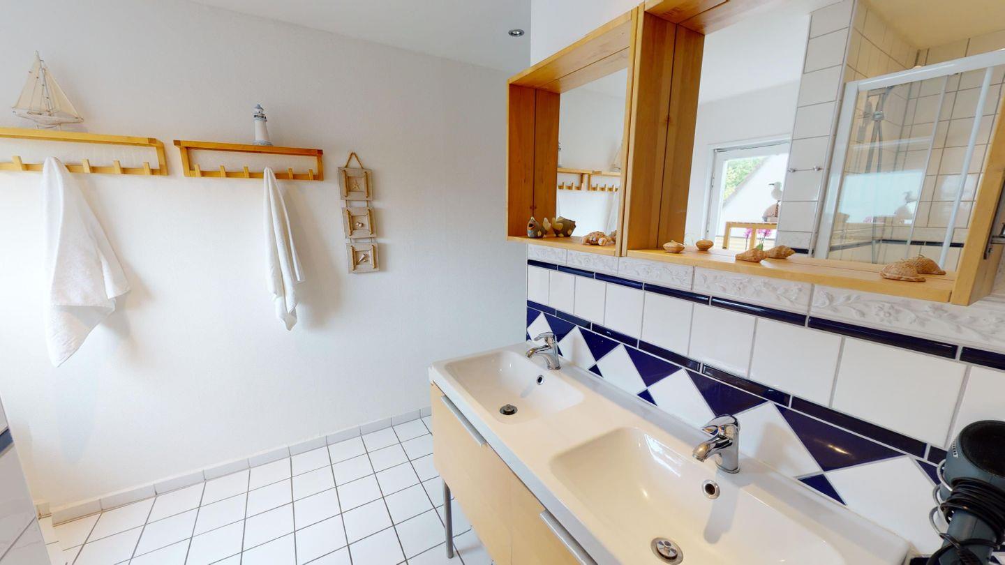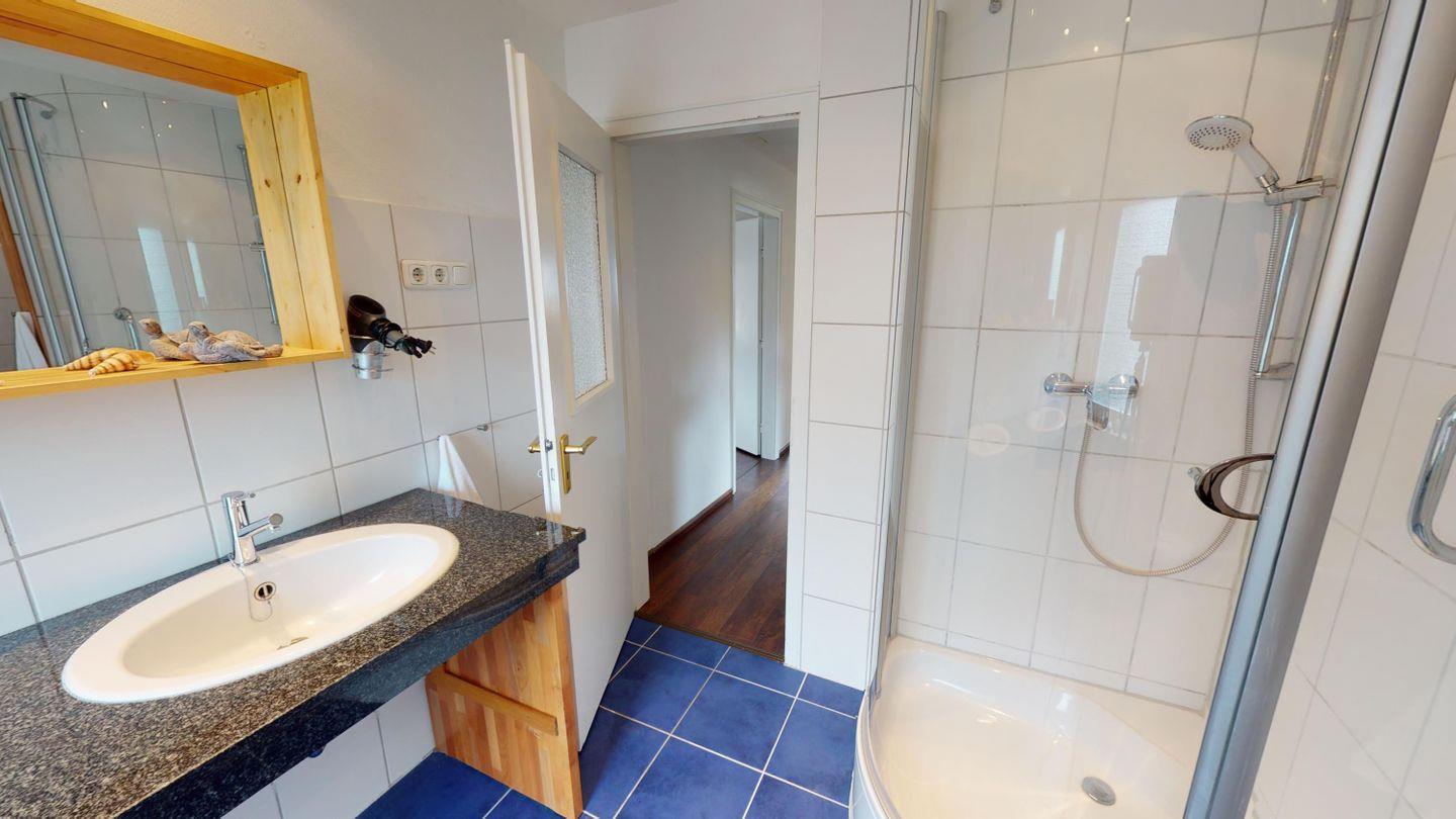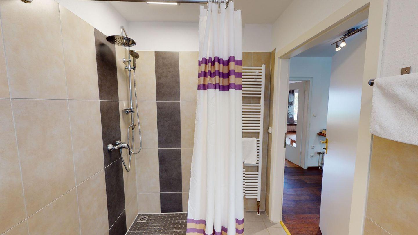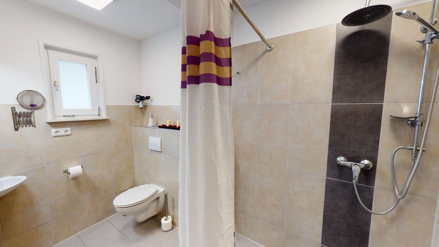 Im Erdgeschoss des Haupthauses befinden sich ein Schlafzimmer mit Doppelbett und ein modernes, barrierearmes Badezimmer mit ebenerdiger Dusche, komfortabel auch für Gäste mit eingeschränkter Mobilität.
