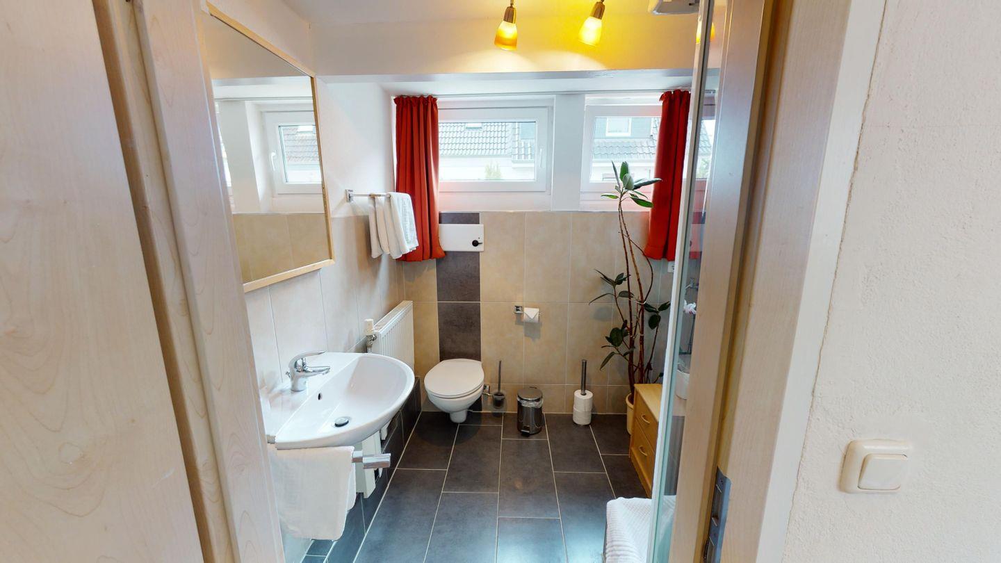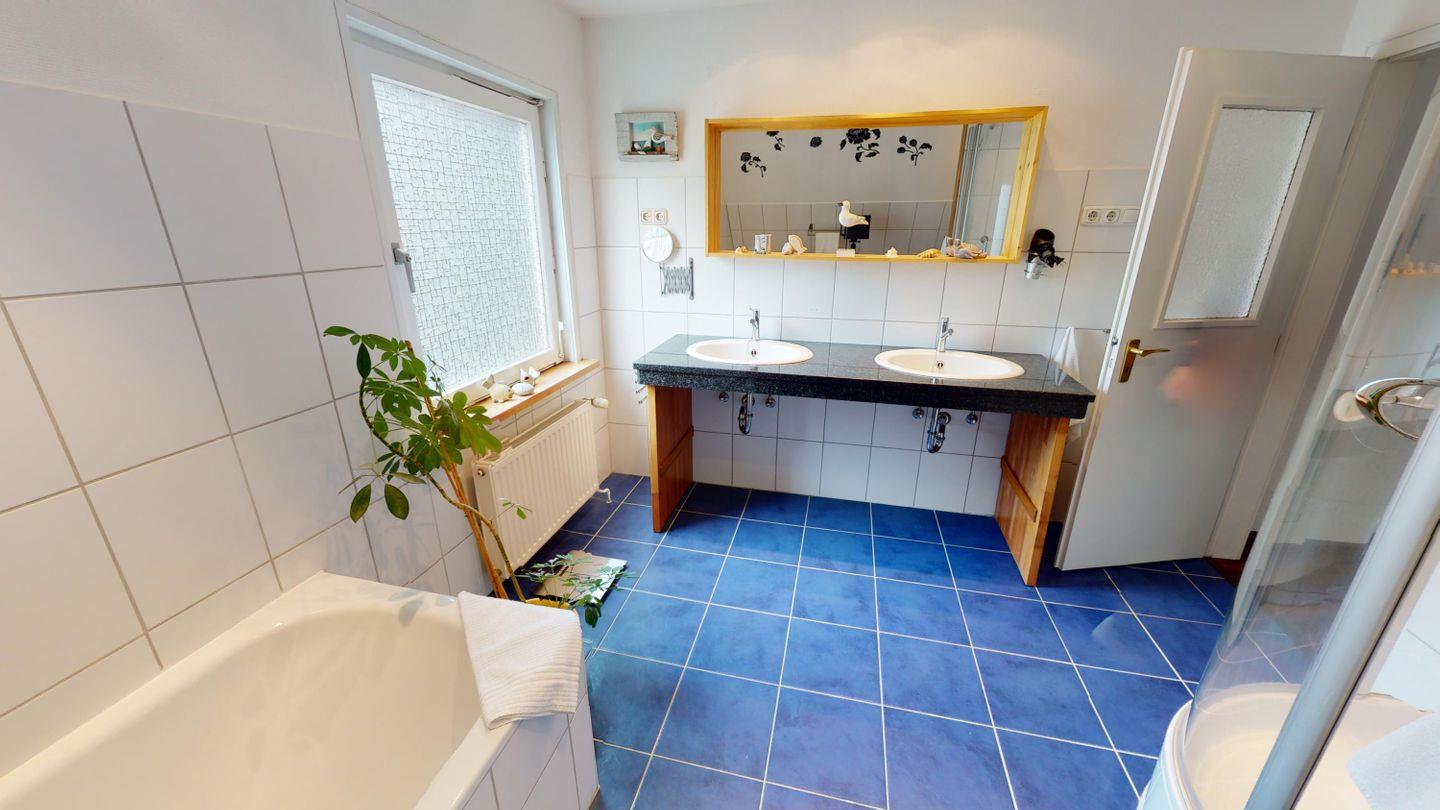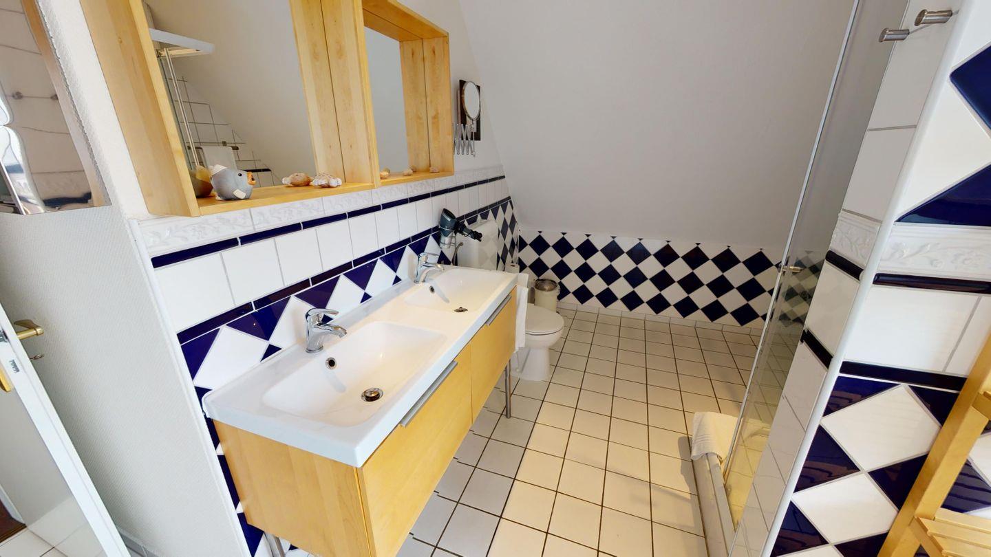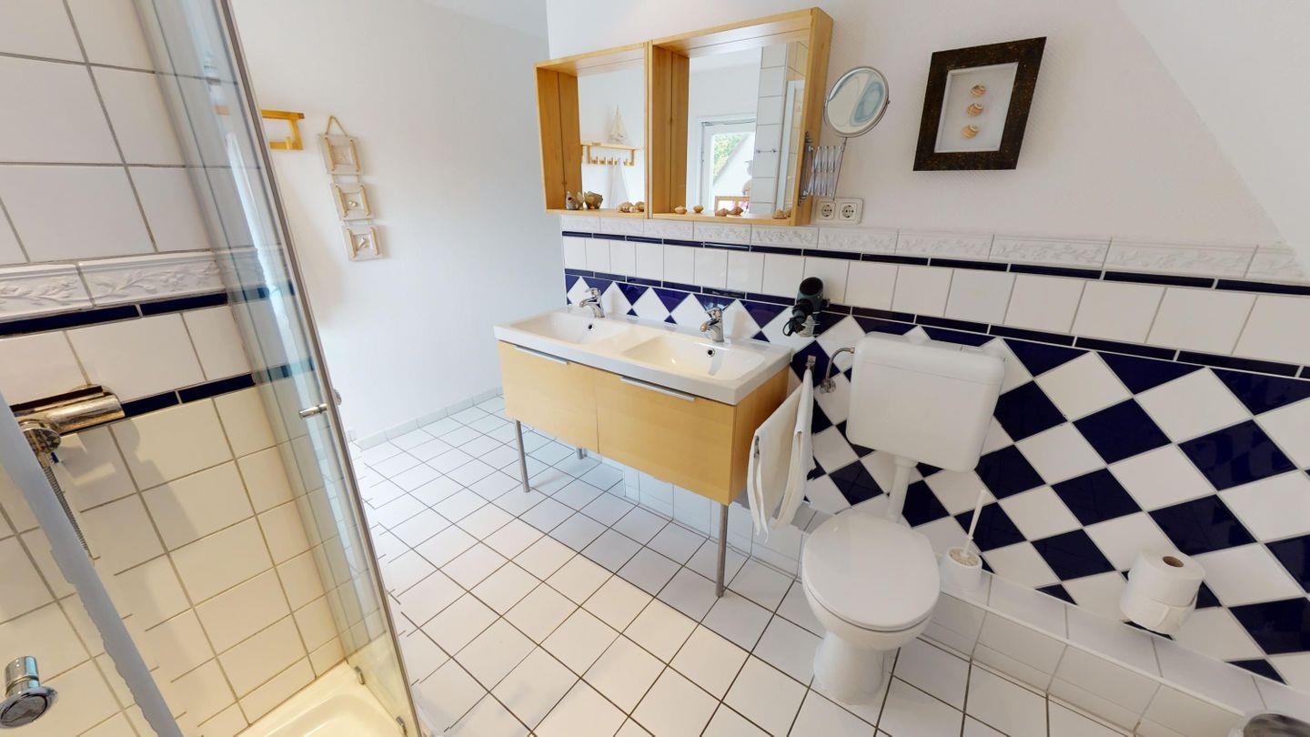 Im Erdgeschoss des Haupthauses befinden sich ein Schlafzimmer mit Doppelbett und ein modernes, barrierearmes Badezimmer mit ebenerdiger Dusche, komfortabel auch für Gäste mit eingeschränkter Mobilität.