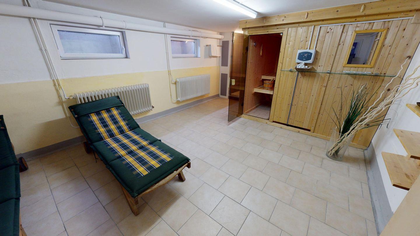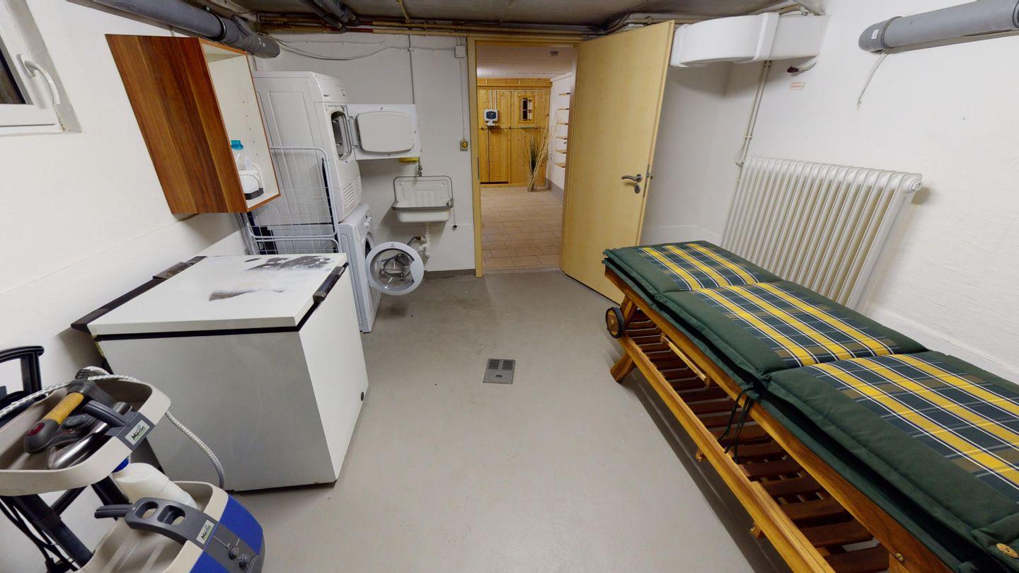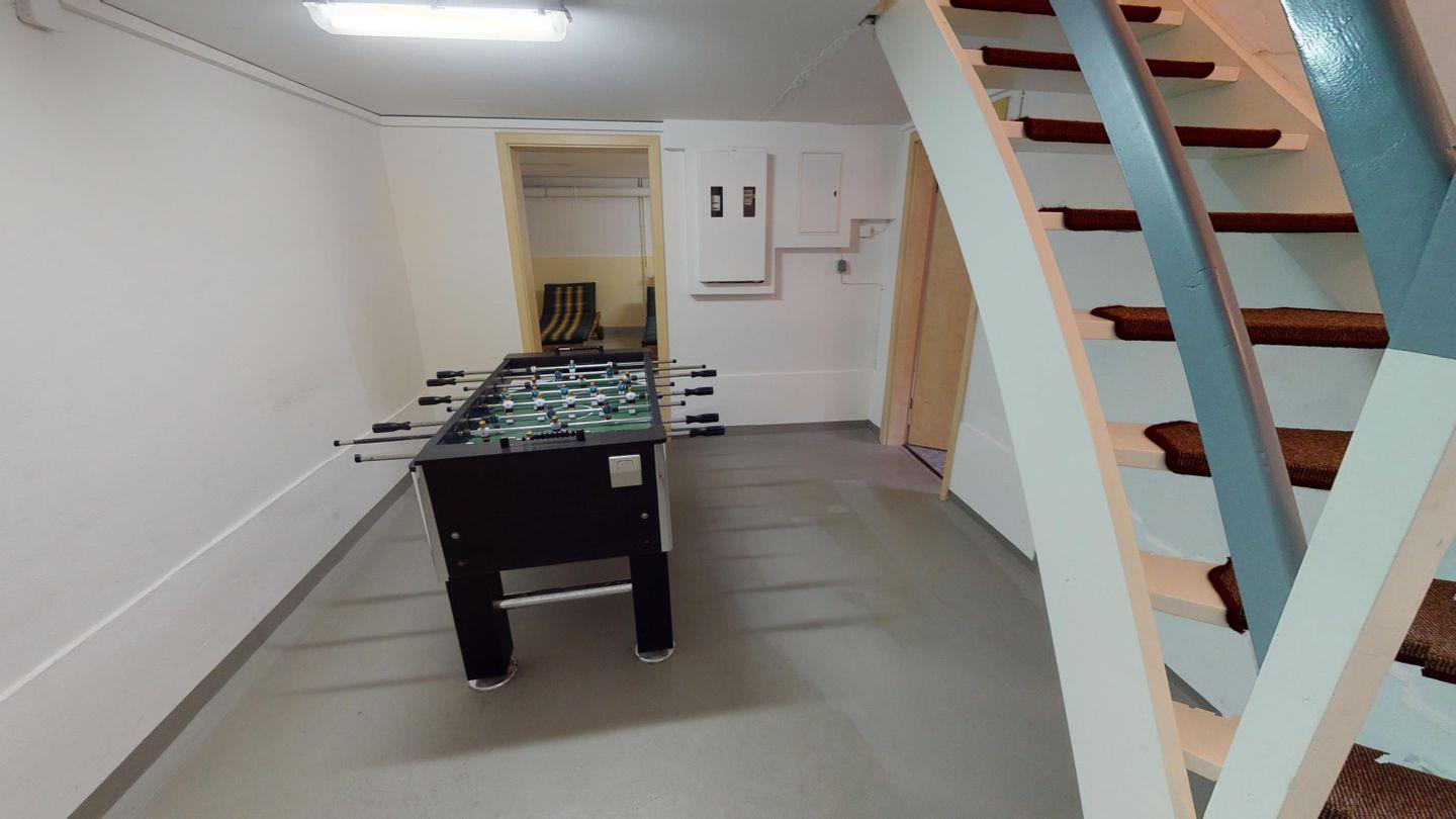 Das Untergeschoss bietet dir zusätzliche Rückzugsmöglichkeiten: ein weiteres Schlafzimmer mit Doppelbett, ein Saunabereich mit Dusche und Liegen, ein Hauswirtschaftsraum mit Waschmaschine und Trockner sowie ein Kickertisch im Flur für gesellige Runden.