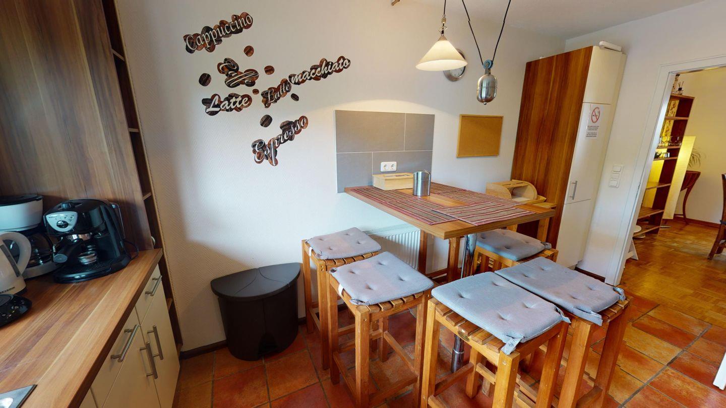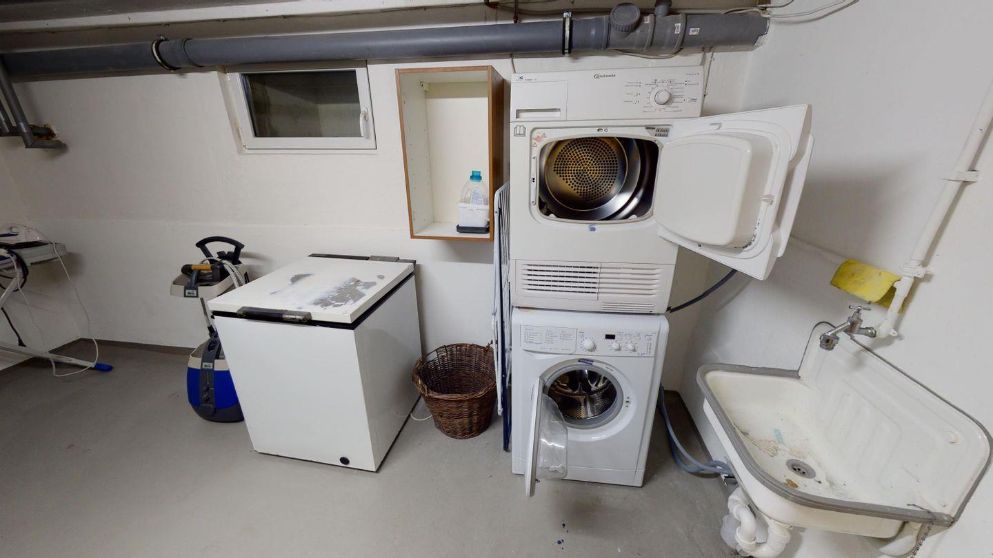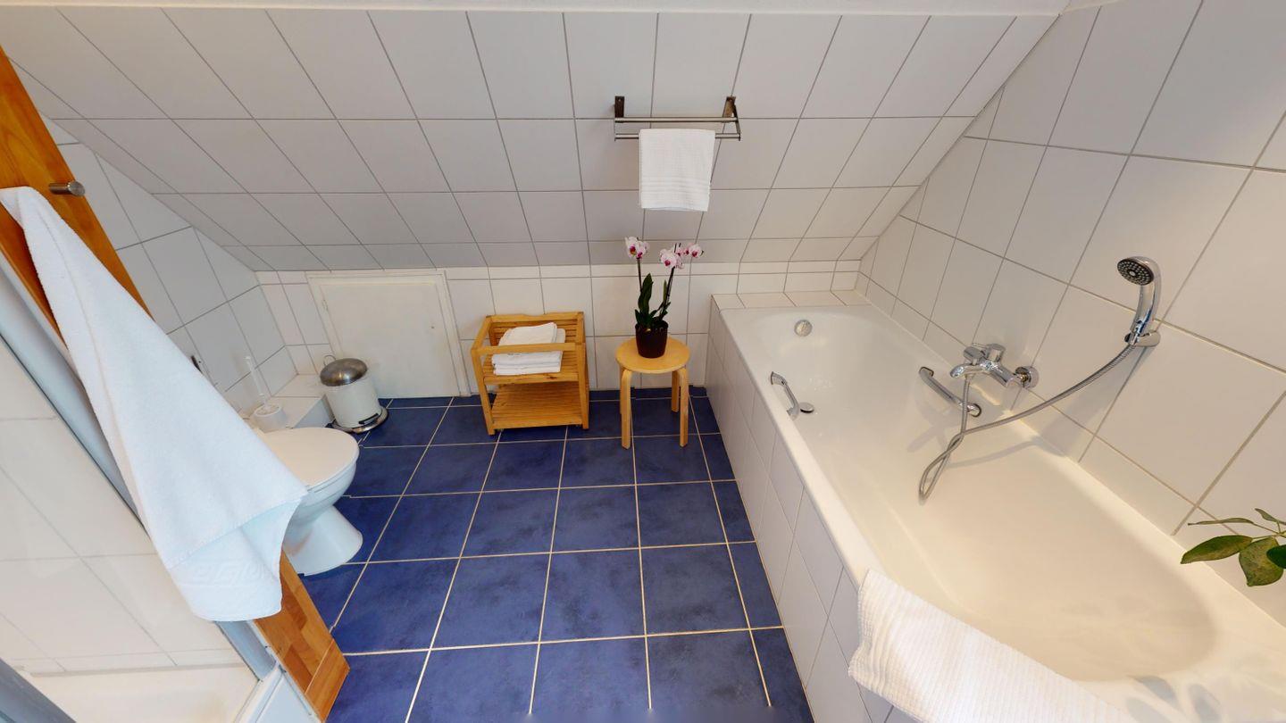 Das Untergeschoss bietet dir zusätzliche Rückzugsmöglichkeiten: ein weiteres Schlafzimmer mit Doppelbett, ein Saunabereich mit Dusche und Liegen, ein Hauswirtschaftsraum mit Waschmaschine und Trockner sowie ein Kickertisch im Flur für gesellige Runden.