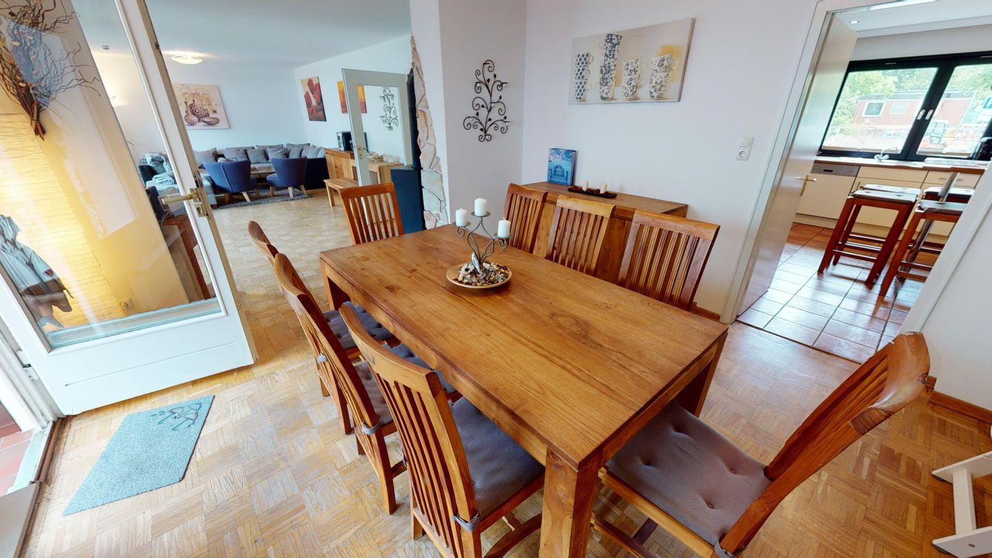 Ferienhaus Wiesenweg 14: Großzügiges Ferienhaus mit ca. 180 m² Wohnfläche über drei Etagen plus Gartenhäuschen, für bis zu 12 Personen. 6 Schlafzimmer, 4 Bäder (inkl. barrierearmem Bad im EG), Wohnzimmer mit Kaminofen, separate Küche, WLAN und TV in allen Schlafzimmern. UG mit Sauna, Dusche, Waschmaschine, Trockner und Kickertisch. Garten mit Terrasse, Strandkorb, Liegen, Schaukel und Gasgrill. Gartenhäuschen mit Küchenzeile, Schlafcouch und Duschbad. 3 Pkw-Stellplätze und Wallbox am Haus. Ruhige Lage, ca. 250?m zum Strand, 450?m zum Hafen, fußläufig zu Zentrum, Kurpark und Einkaufsmöglichkeiten. Haustiere erlaubt.