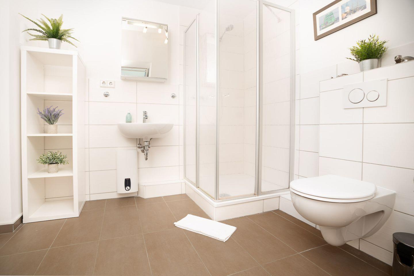 Die dritte Etage bietet ein weiteres Schlafzimmer mit Doppelbett, ideal für etwas mehr Privatsphäre. Direkt gegenüber liegt das zweite Badezimmer mit Dusche und WC – ideal für Familien oder kleine Gruppen, die sich auch im Urlaub den Komfort von zwei Bädern wünschen.