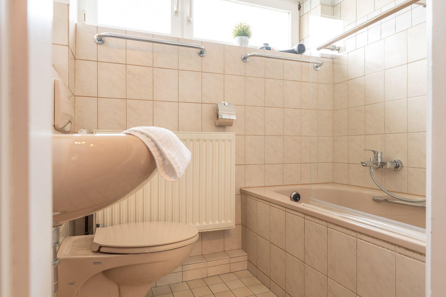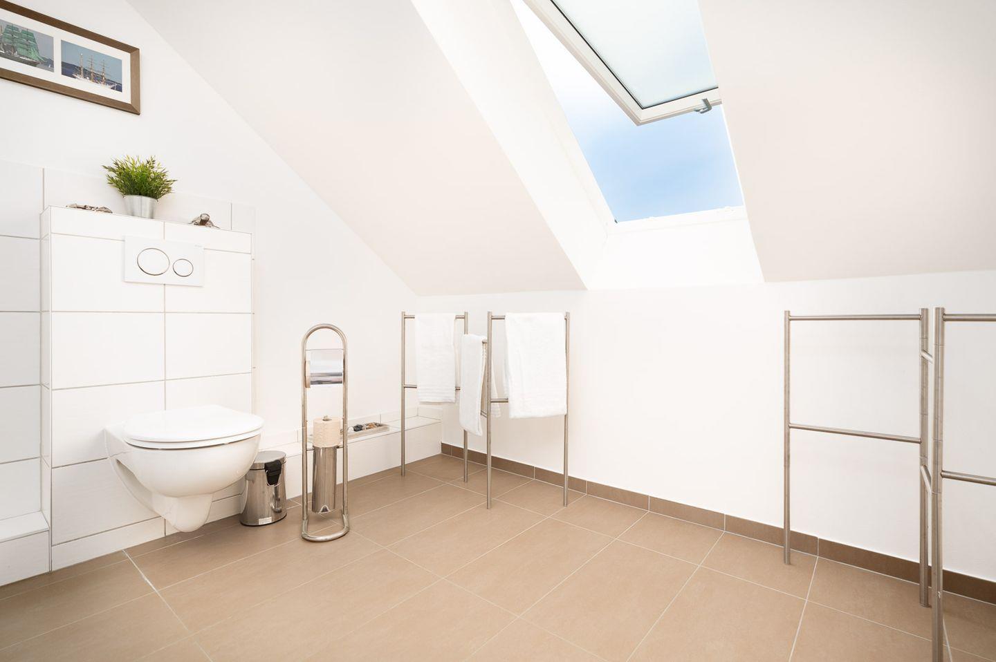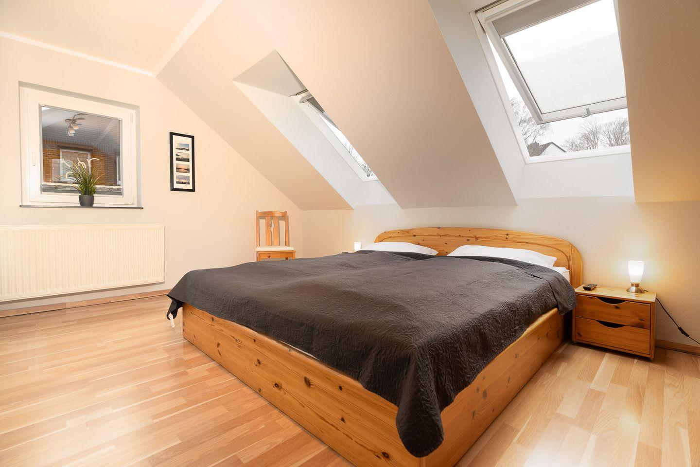 In der ersten Etage befinden sich zwei helle und geräumige Schlafzimmer, beide ausgestattet mit komfortablen Doppelbetten und großen Kleiderschränken, sodass ausreichend Stauraum für dein Gepäck vorhanden ist. Das Vollbad mit Dusche bietet hier zusätzlichen Komfort und lädt zur Entspannung ein.