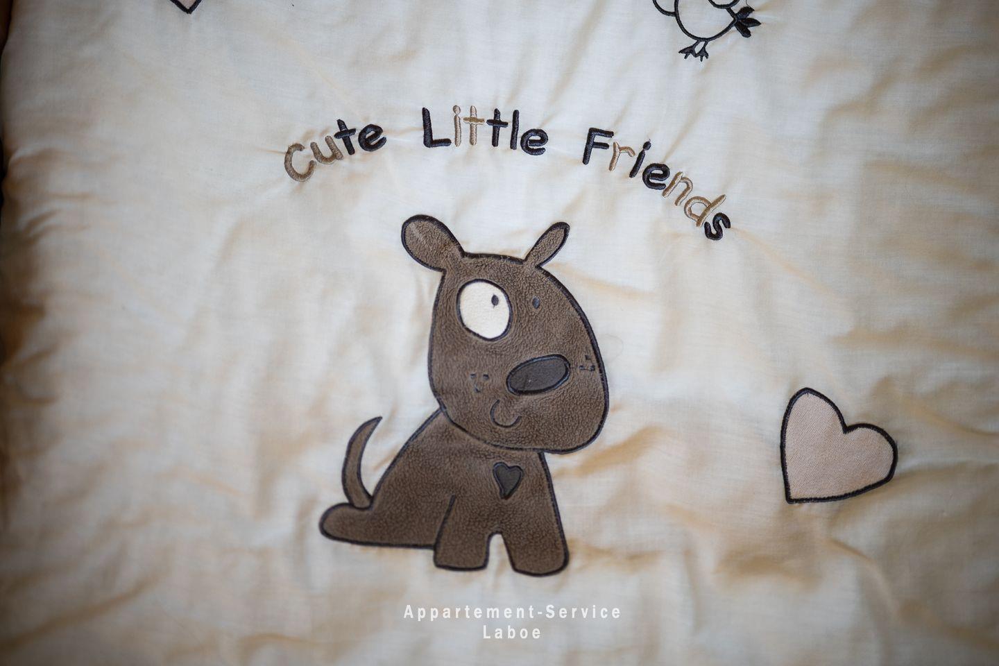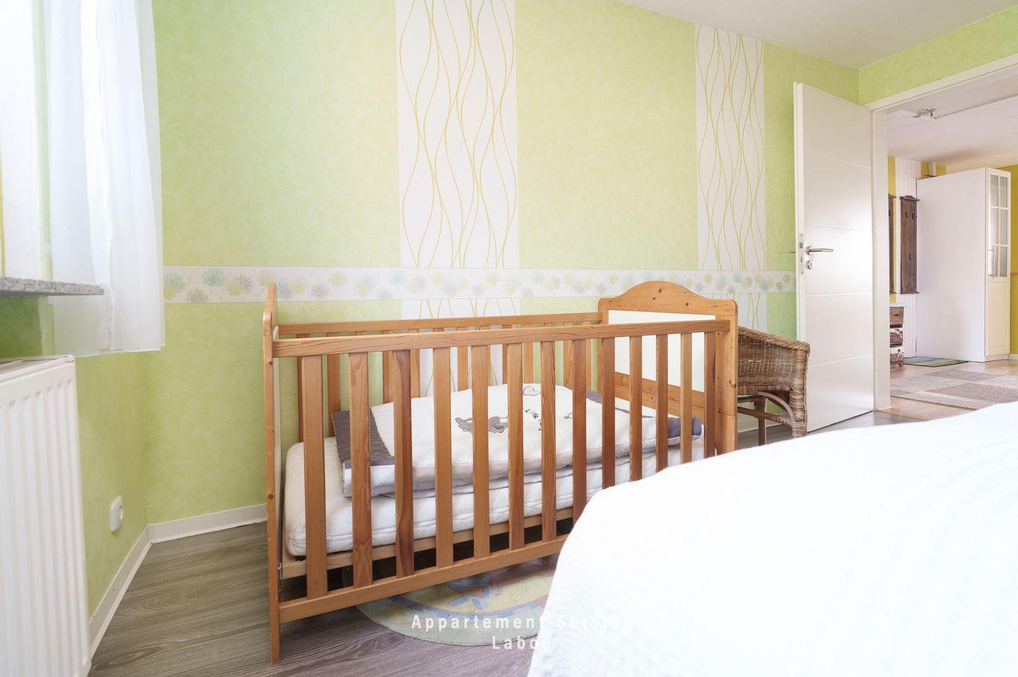Drei Schlafzimmer sorgen für erholsamen Schlaf. Ein Zimmer ist mit einem Doppelbett und einem Kinderbett eingerichtet, das zweite verfügt über zwei Einzelbetten, während das dritte ein weiteres Einzelbett bietet. Die Räume sind hell, freundlich und laden zum Rückzug ein.