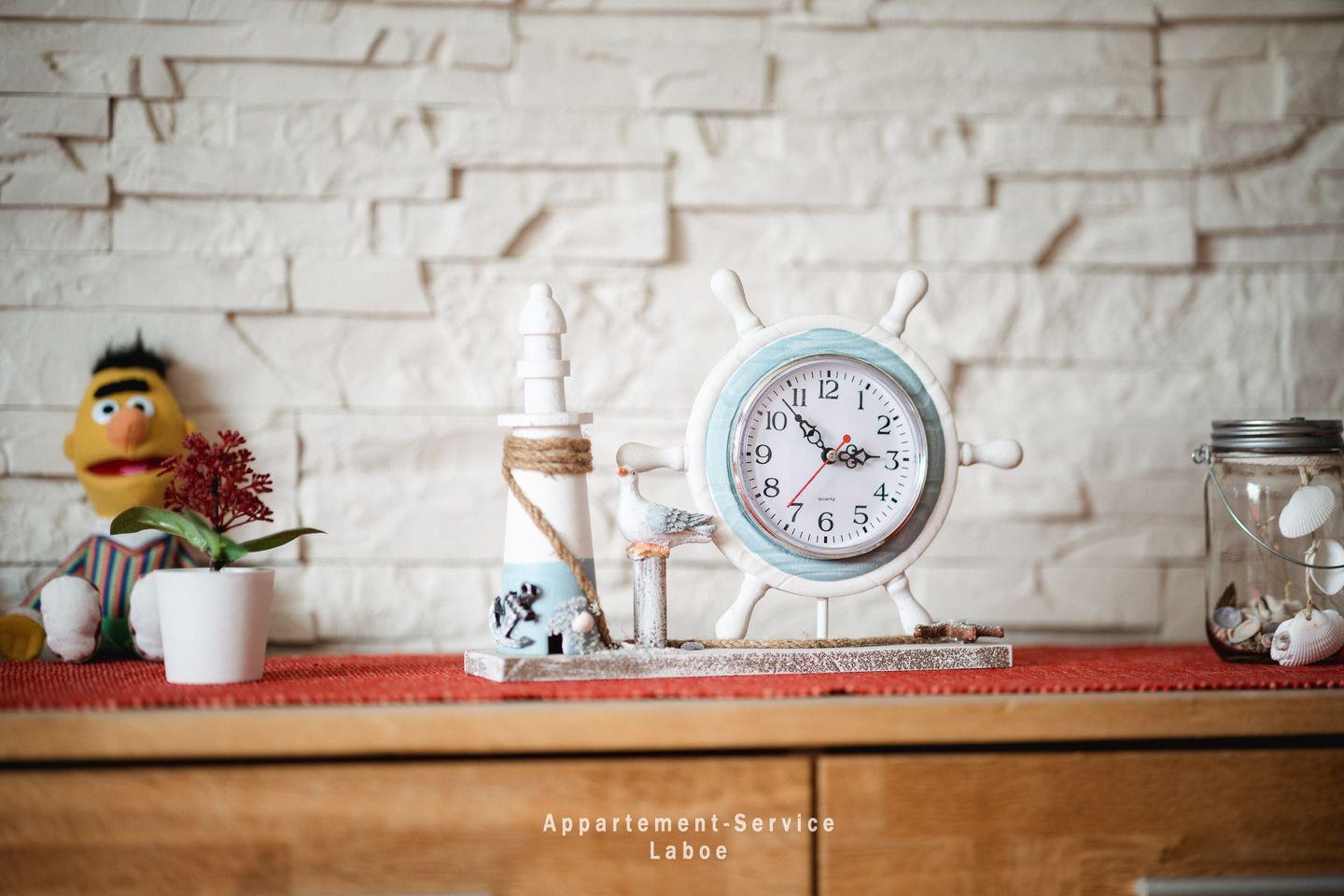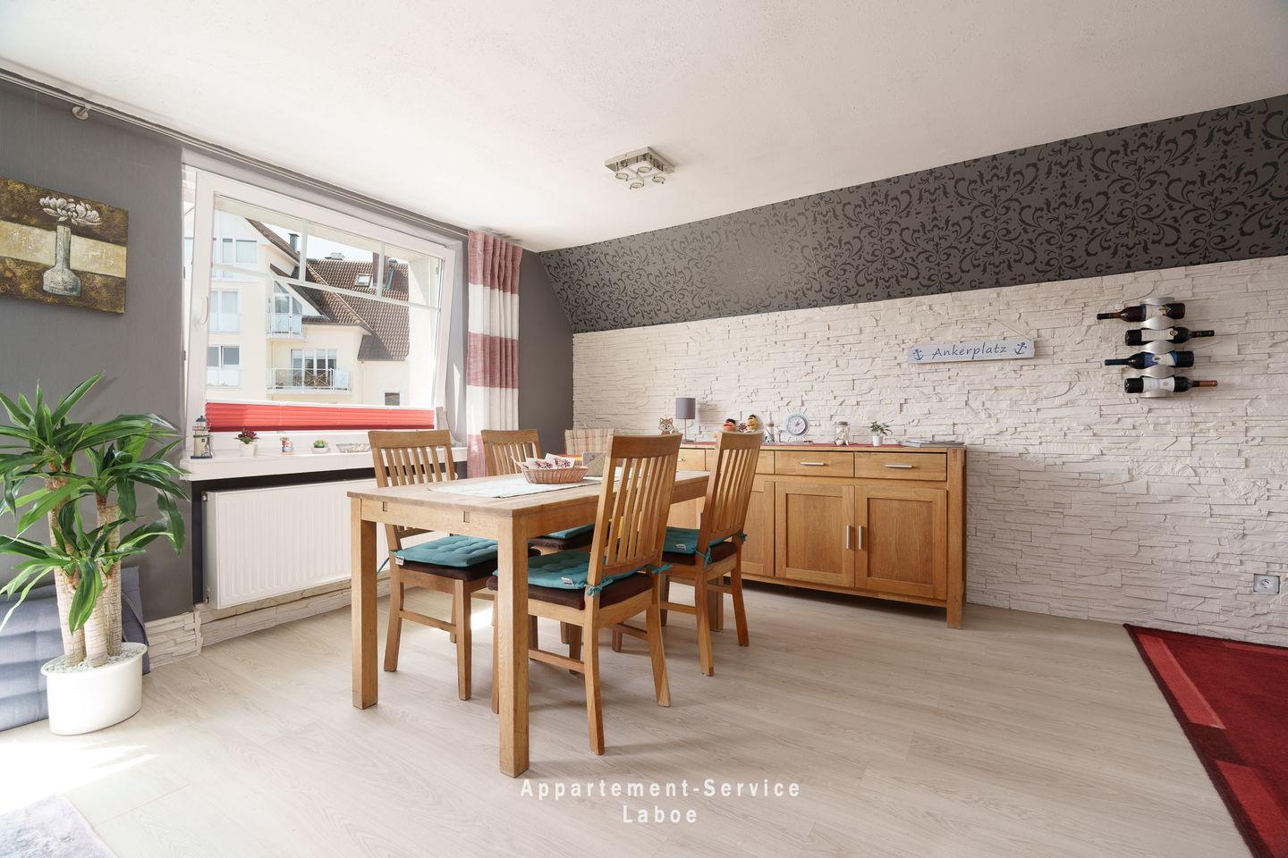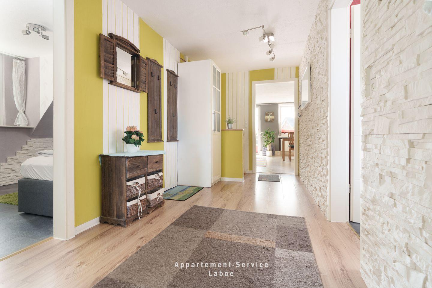 FeWo Kuhnert: 4-Zimmer-Wohnung, ca. 80 m², im 1. Obergeschoss, für bis zu 5 Erwachsene und 1 Kleinkind. Drei Schlafzimmer: eins mit Doppelbett und Kinderbett, eins mit zwei Einzelbetten, eins mit einem Einzelbett. Wohnzimmer mit Sitzgruppe, Essbereich, Sat-TV, Stereoanlage, DVD-Player und WLAN. Offene Küchenzeile mit Ceranfeld, Backofen, Geschirrspüler und Küchenutensilien. Badezimmer mit Dusche, Badewanne und WC. Kleiner Balkon. Pkw-Stellplatz direkt an der Unterkunft. Zentrale Lage in Laboe, ca. 50?m zur Strandpromenade, fußläufig zu Hafen, Einkaufsmöglichkeiten, Gastronomie und Bäcker.
