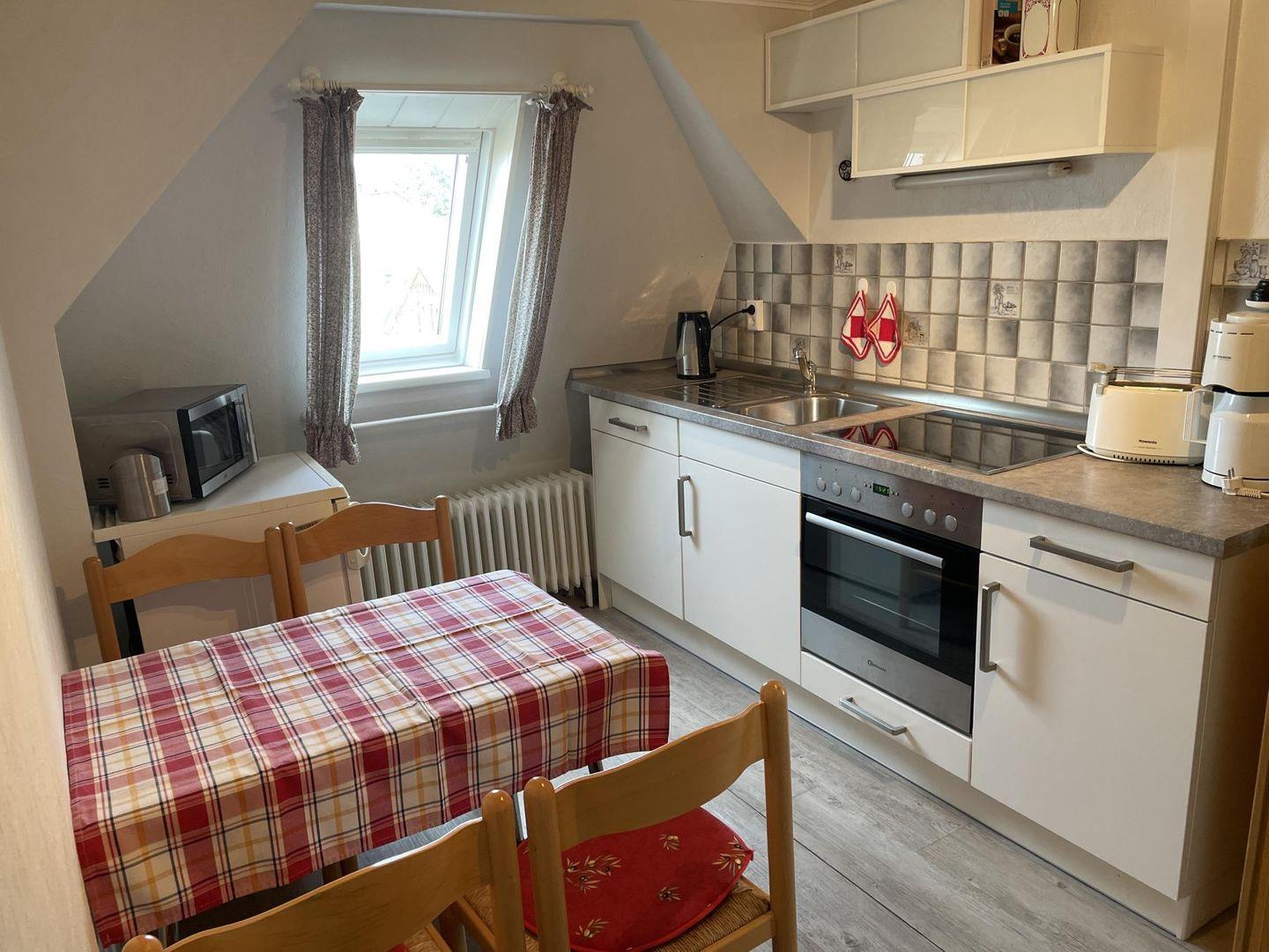 Die geschlossene Küche ist mit allem ausgestattet, was du brauchst – Ceranfeld, Backofen, Mikrowelle, Kühlschrank, Kaffeemaschine, Toaster und Wasserkocher. Ein kleiner Tisch mit vier Stühlen befindet sich ebenfalls dort – praktisch für einen schnellen Snack oder als zusätzliche Arbeitsfläche beim Kochen.
