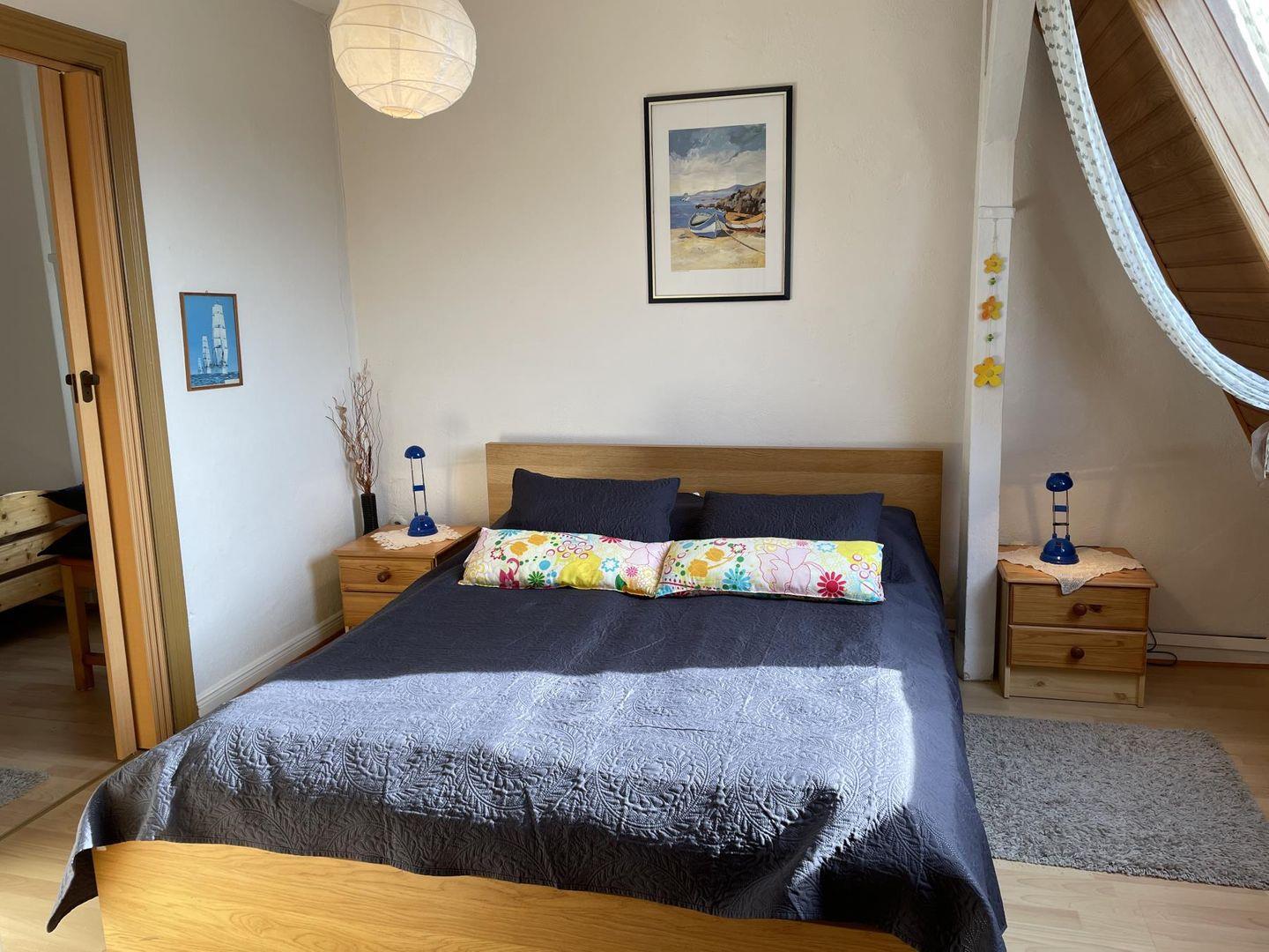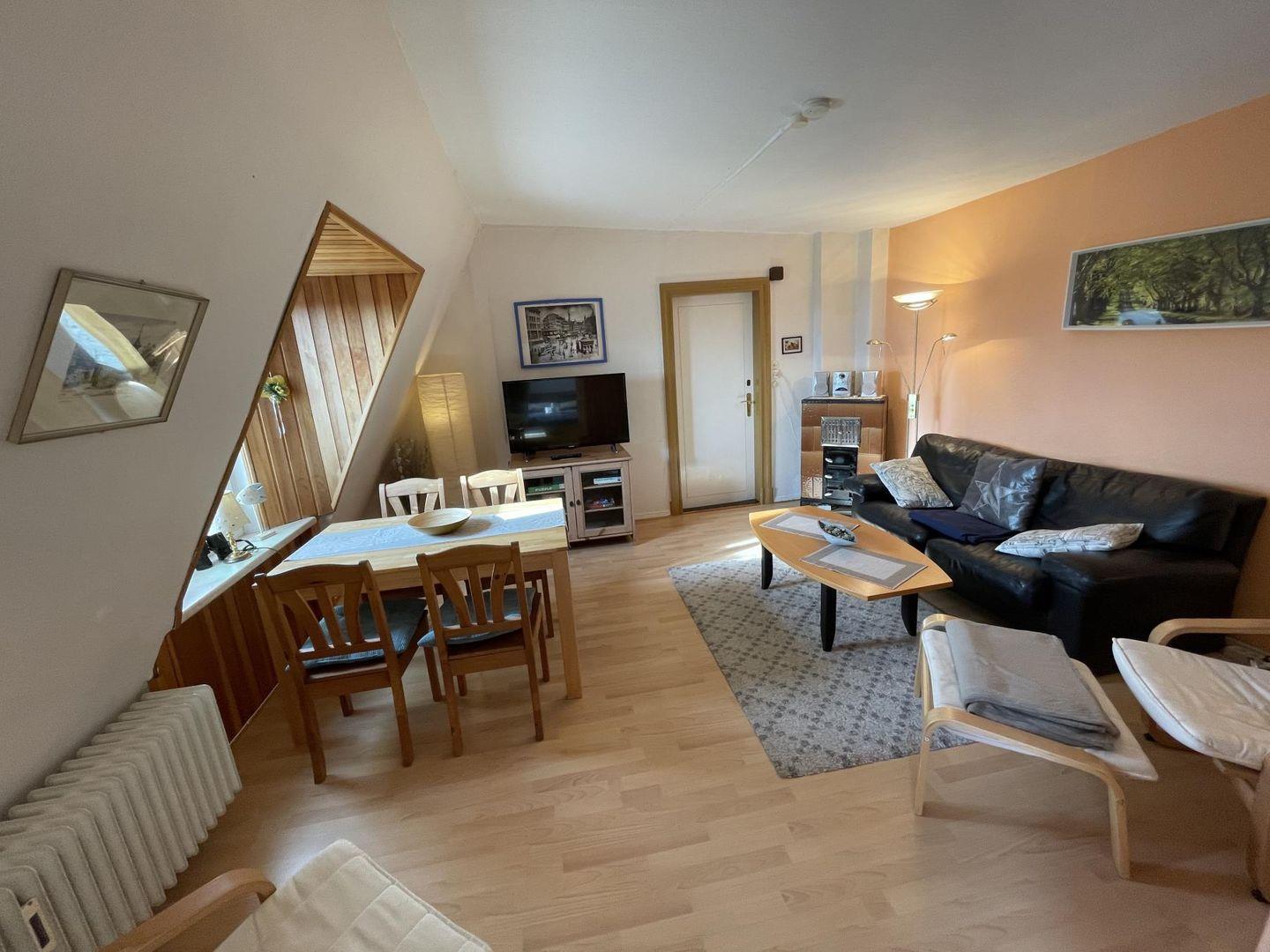 Die Wohnung befindet sich im Dachgeschoss eines Altbaus und bietet auf etwa 65?m² Platz für bis zu vier Personen. Dachschrägen verleihen der Wohnung eine gemütliche Atmosphäre. Die Einrichtung ist teilweise älter, doch funktional und gepflegt – ideal für alle, die eine schlichte, bodenständige Unterkunft mit Charakter suchen.