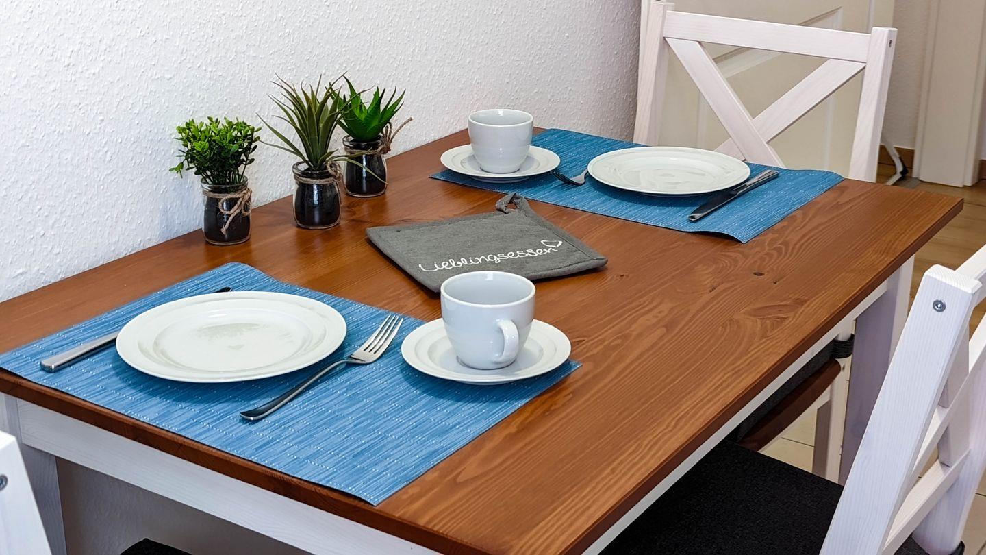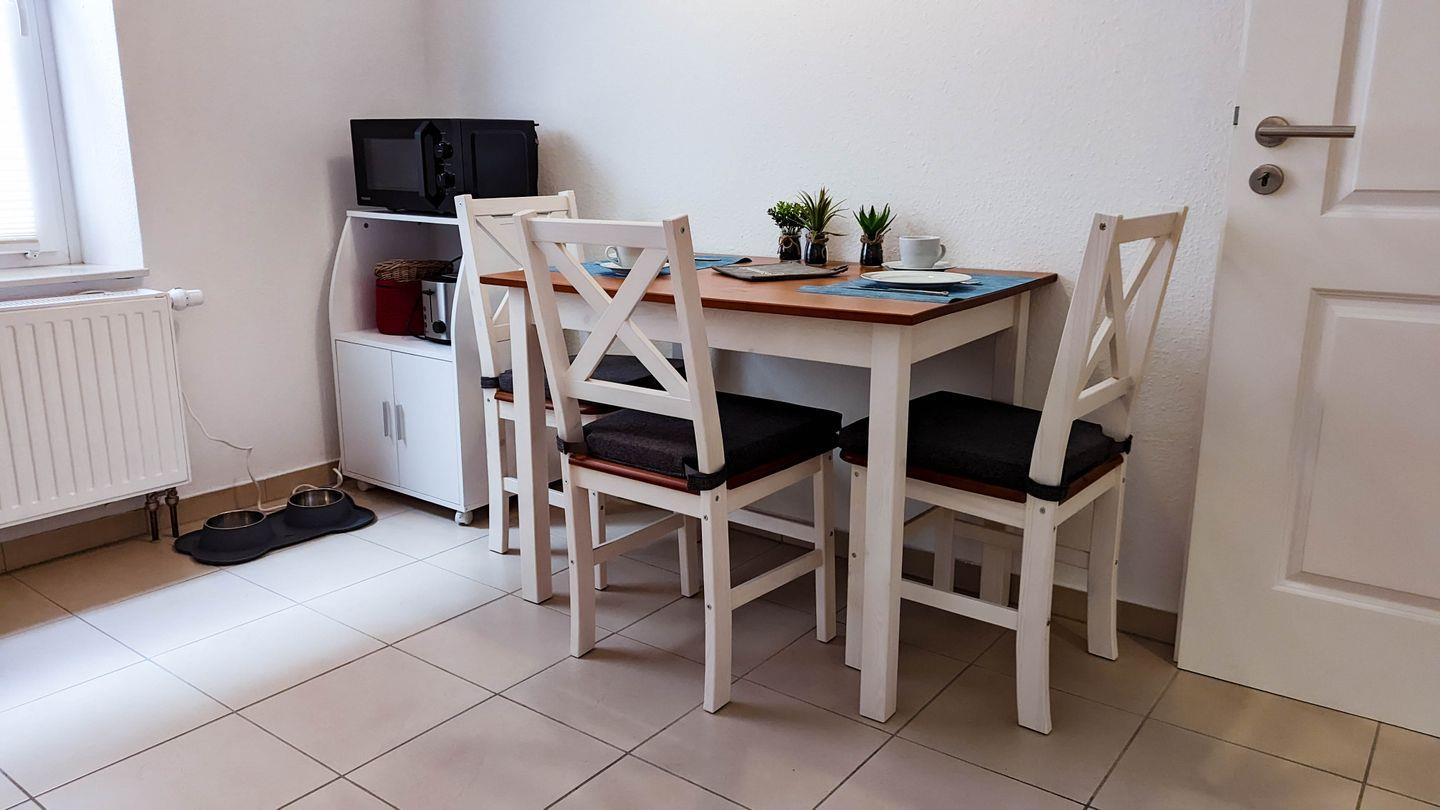 Die Küche liegt separat und ist mit allem ausgestattet, was du brauchst, um dich auch im Urlaub selbst zu versorgen. Am Esstisch finden alle bequem Platz, ob zum Frühstück, zum Abendessen oder einfach für eine kleine Pause zwischendurch.