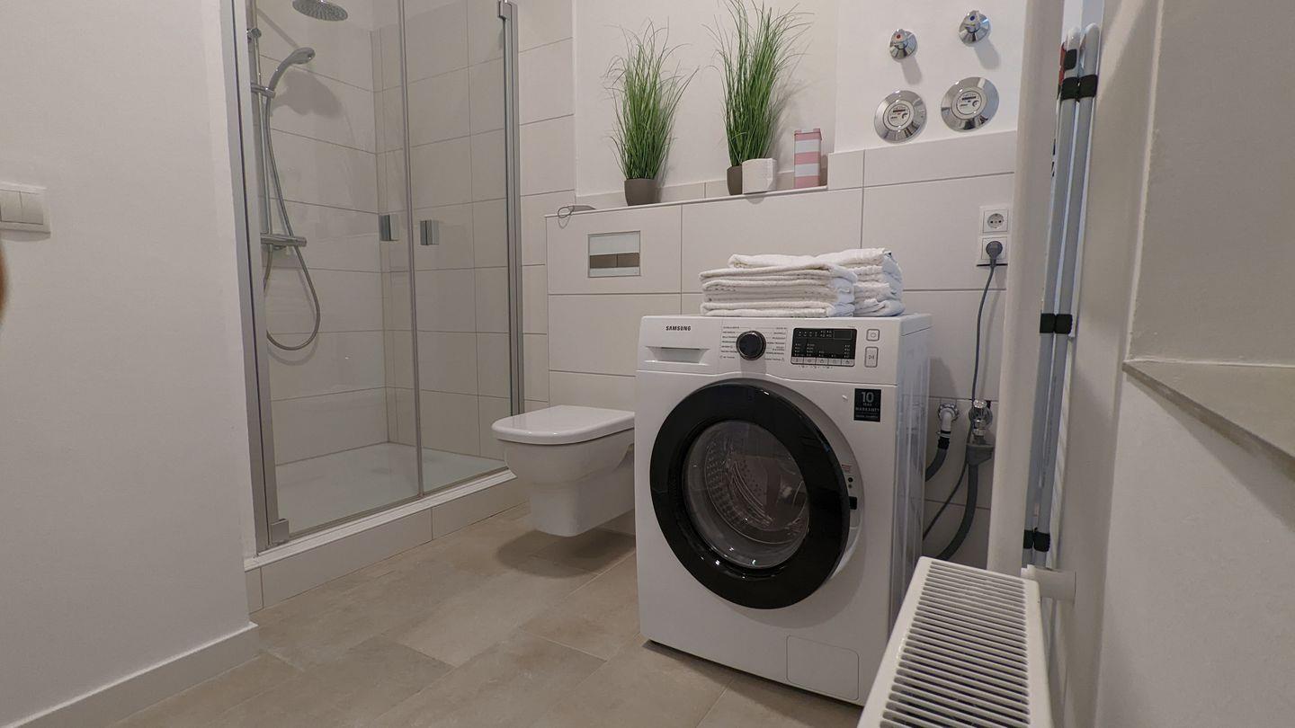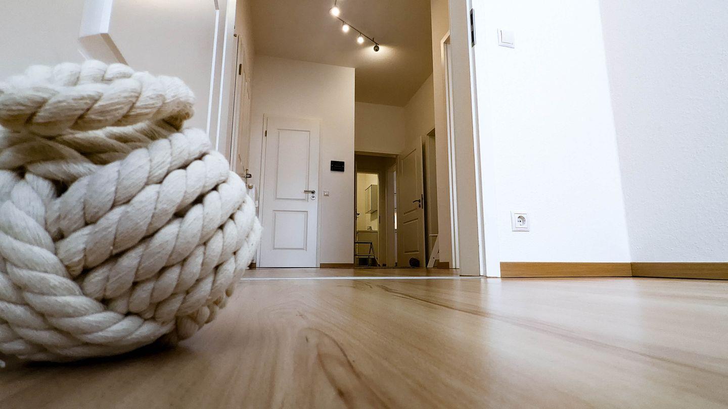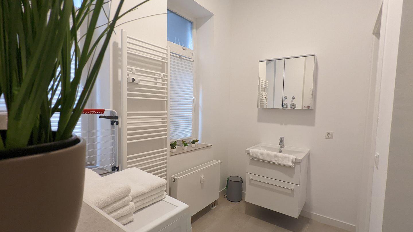 Das Tageslichtbad ist modern und klar gestaltet. Eine Dusche, angenehmes Licht und genügend Platz sorgen dafür, dass du dich auch hier sofort wohlfühlst. Im Flur gibt es viel Stauraum, damit alles seinen Platz hat und die Wohnung aufgeräumt bleibt.