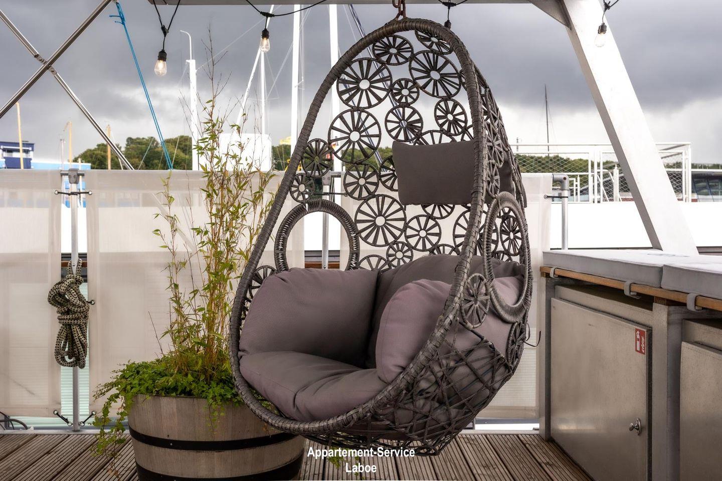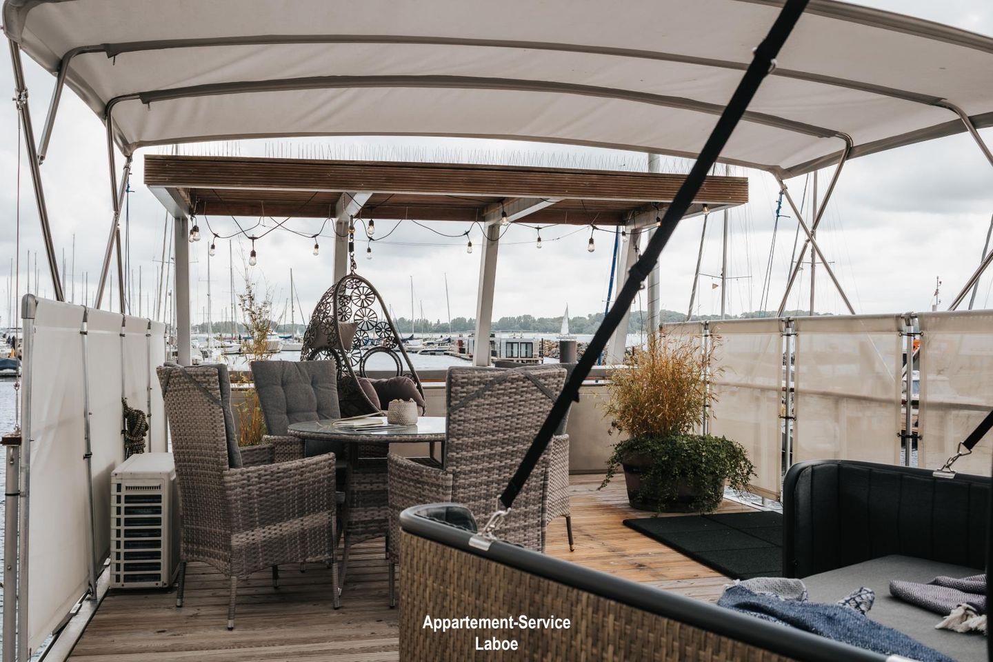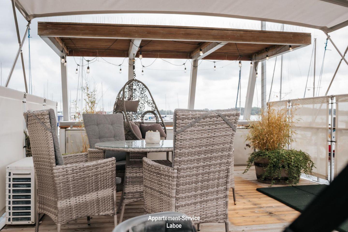 Das Hausboot verfügt über zwei Terrassen, die das Outdoor-Erlebnis besonders machen. Eine kleinere Terrasse auf Wasserhöhe lädt zu romantischen Dinnern bei Sonnenuntergang ein. Die großzügige Dachterrasse mit 40 m² bietet dir ein Highlight mit Deutschlands einzigem Schlafstrandkorb auf dem Wasser, einer Yoga-Ecke, Hängesesseln und Bambuspflanzen. Hier kannst du die Seele baumeln lassen und die Weite der Förde genießen.