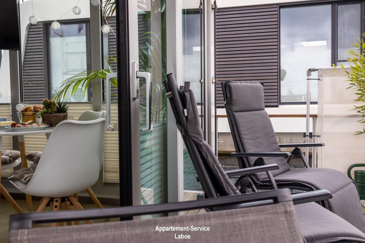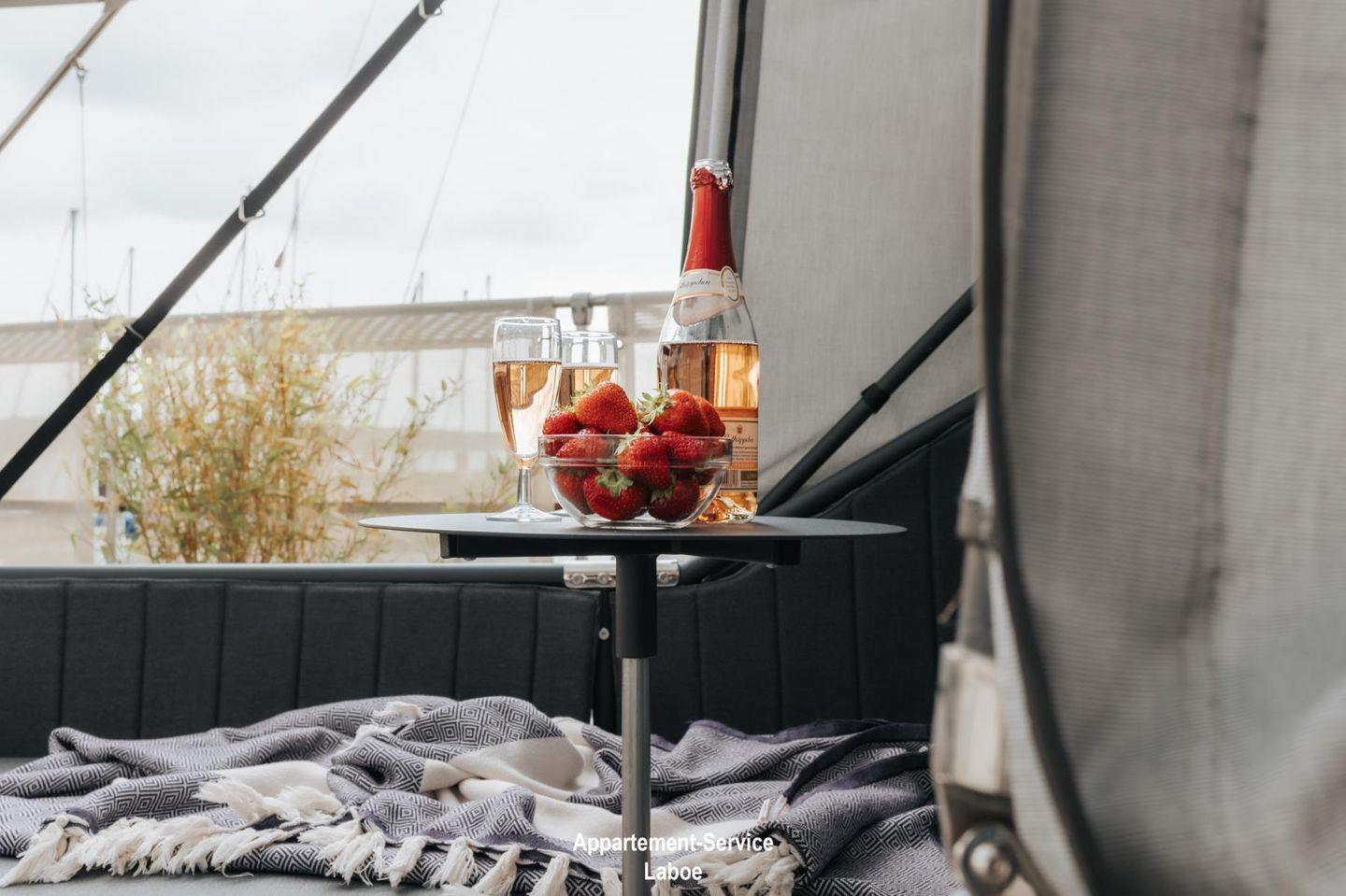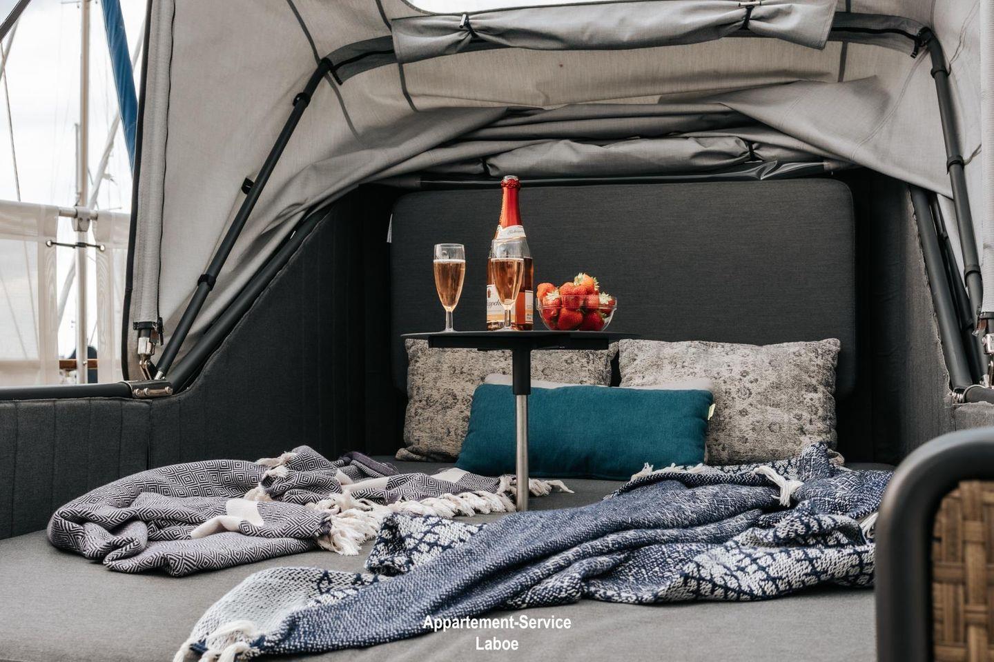 Das Hausboot verfügt über zwei Terrassen, die das Outdoor-Erlebnis besonders machen. Eine kleinere Terrasse auf Wasserhöhe lädt zu romantischen Dinnern bei Sonnenuntergang ein. Die großzügige Dachterrasse mit 40 m² bietet dir ein Highlight mit Deutschlands einzigem Schlafstrandkorb auf dem Wasser, einer Yoga-Ecke, Hängesesseln und Bambuspflanzen. Hier kannst du die Seele baumeln lassen und die Weite der Förde genießen.