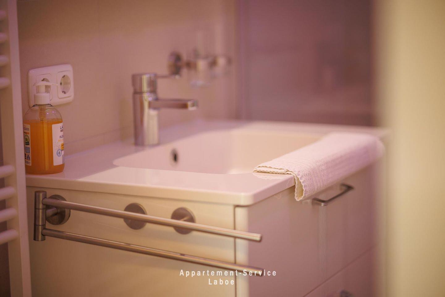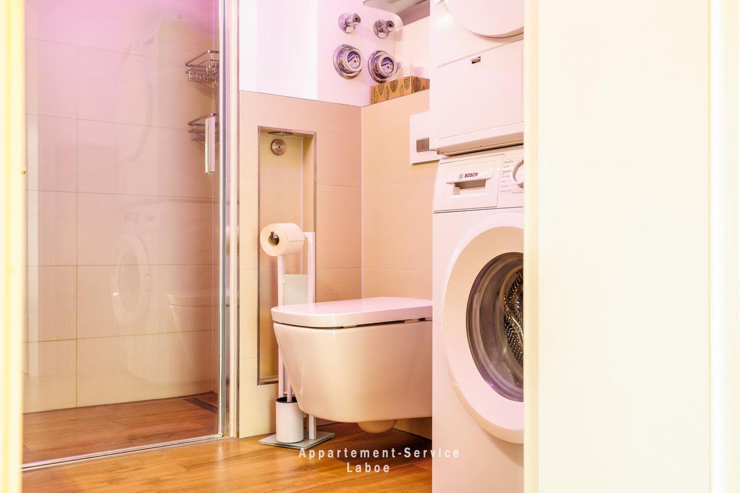 Das moderne Badezimmer verfügt über eine bodengleiche Dusche und ein WC – gepflegt und funktional.