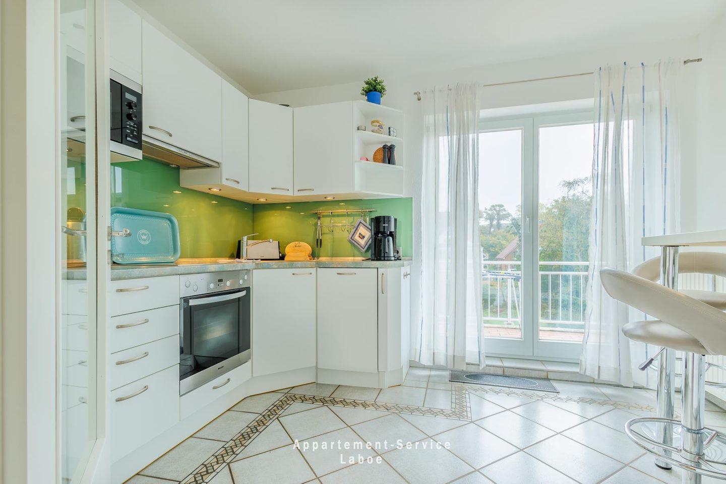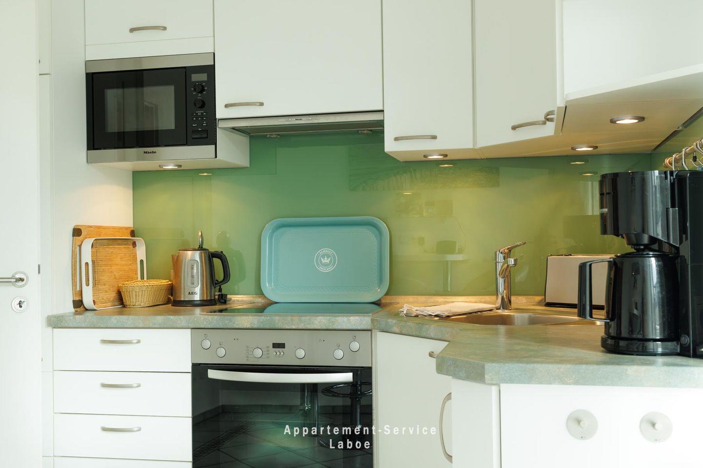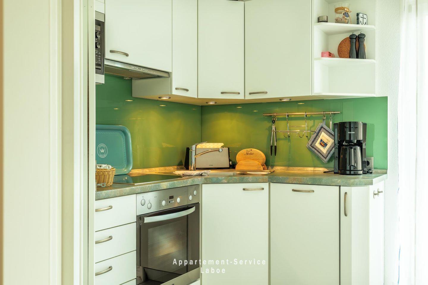 Die separate Küche ist vollständig ausgestattet mit Geschirrspüler, Herd, Kühlschrank und allen wichtigen Küchenutensilien. Ein kleiner Bartisch mit zwei Hockern lädt zum Frühstück oder schnellen Snack ein.