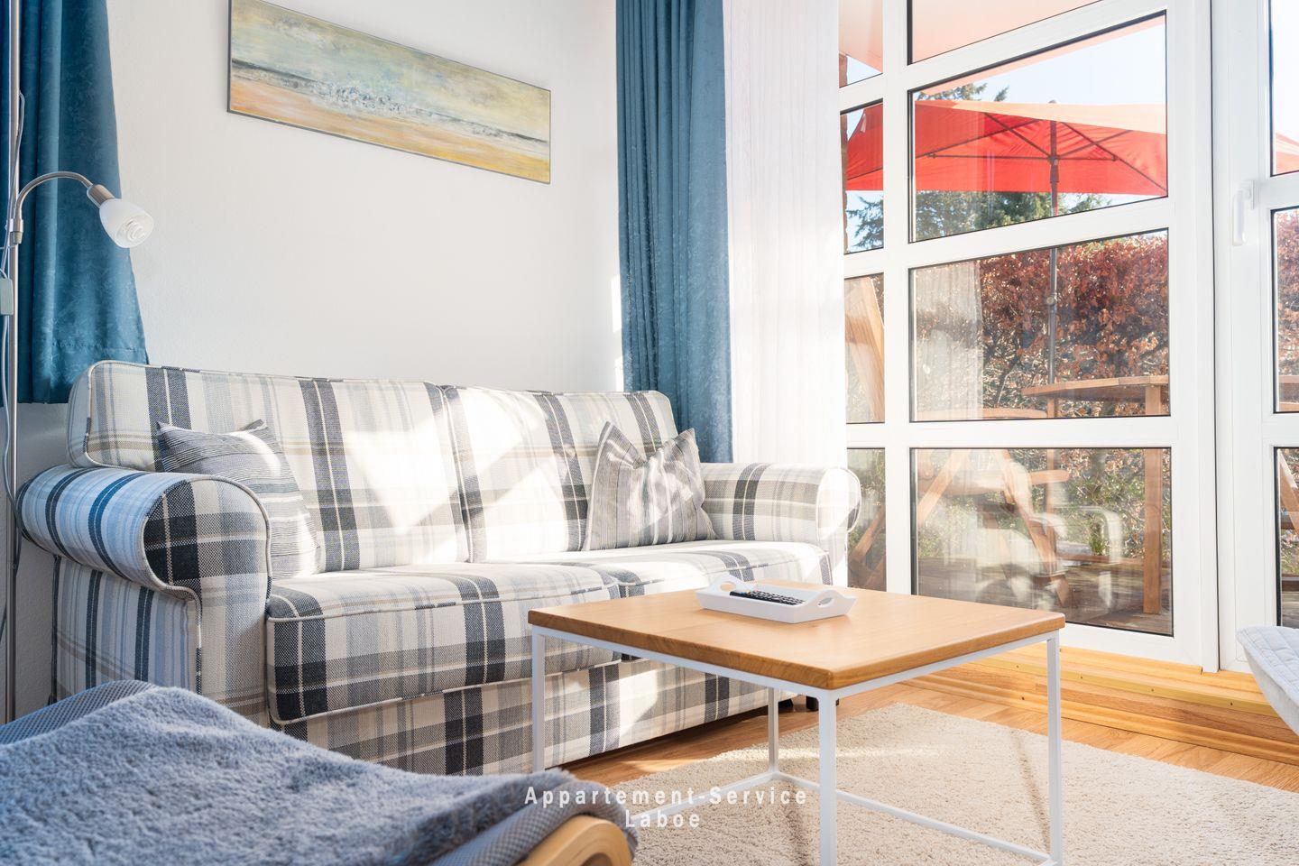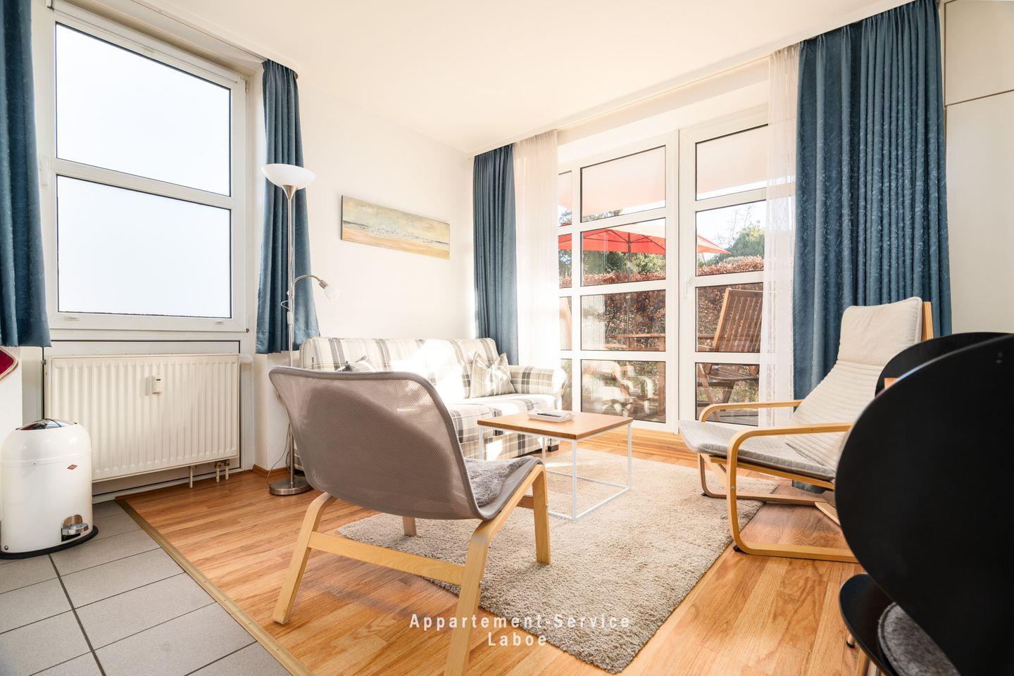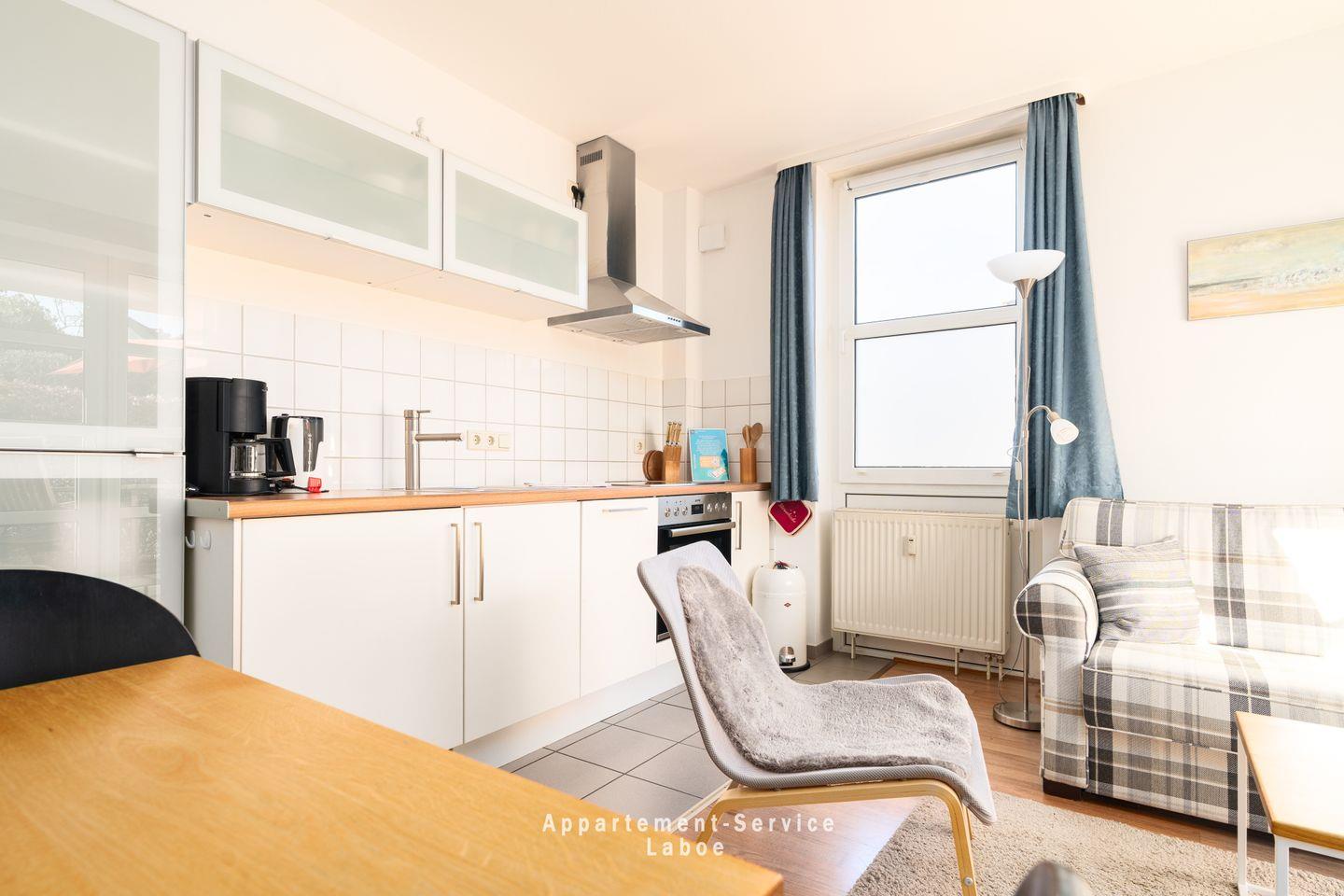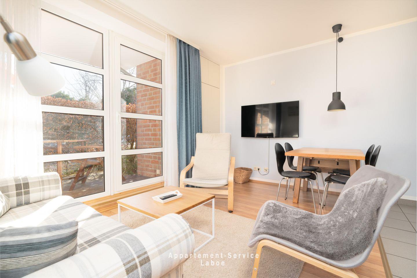 FeWo La Böe: Hafenresidenz W05 im Erdgeschoss ruhig gelegene Zweizimmerwohnung bis zu 4 Personen über 44 m², kombiniertes Wohnschlafzimmer mit gemütlicher Sitzgruppe (Doppelbettcouch), TV, W-LAN, vollausgestattete Küche mit Essplatz, kleiner Flur mit Garderobe, Dusche/WC, Schlafzimmer mit Doppelbett, möblierte Terrasse, PKW-Stellplatz in der Tiefgarage mit Doppelparkanlage (max. L 5,00 m; B 2,00 m; H 1,50 m).